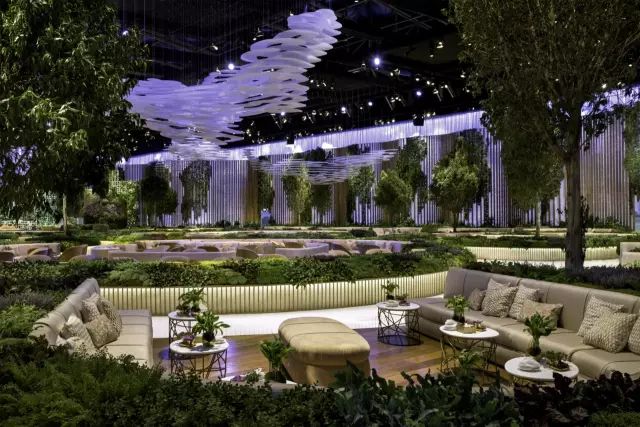 与大型艺术家Kendall Buster合作,表达一个在公园般的空间环境,定制的沙发桌椅,让客人被树木包围,并且整个空间有更多层次的递进和空间划分。