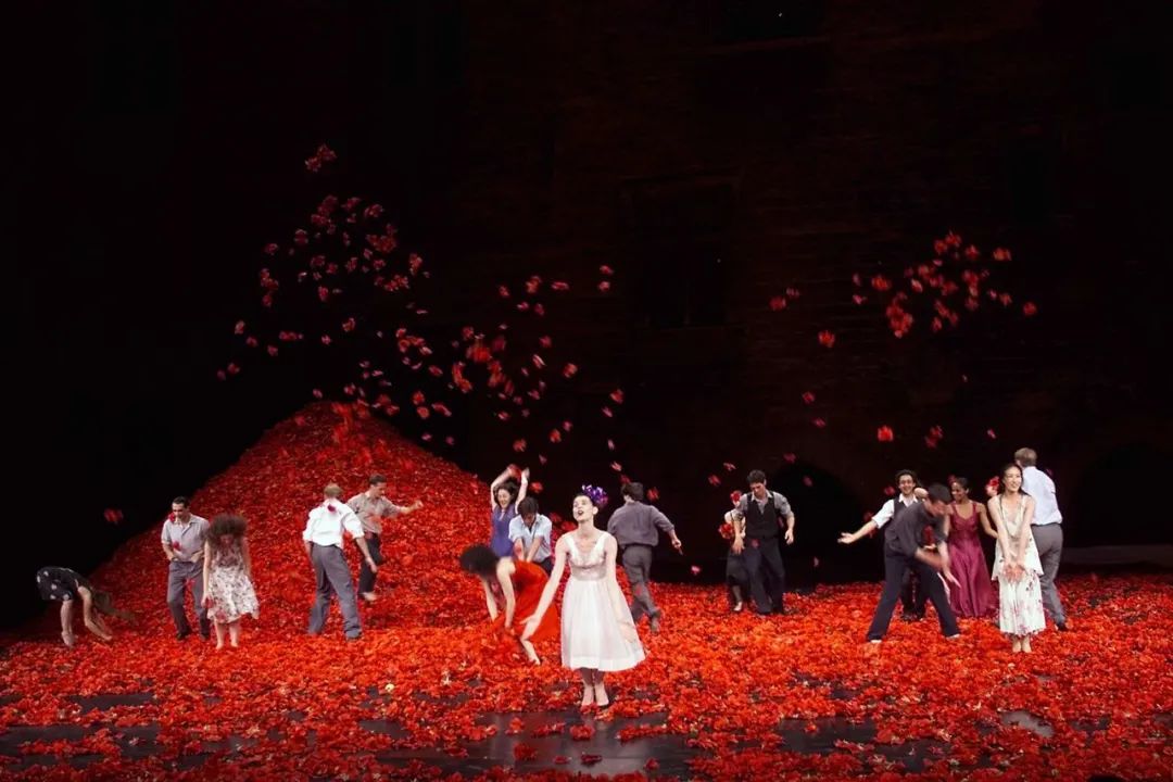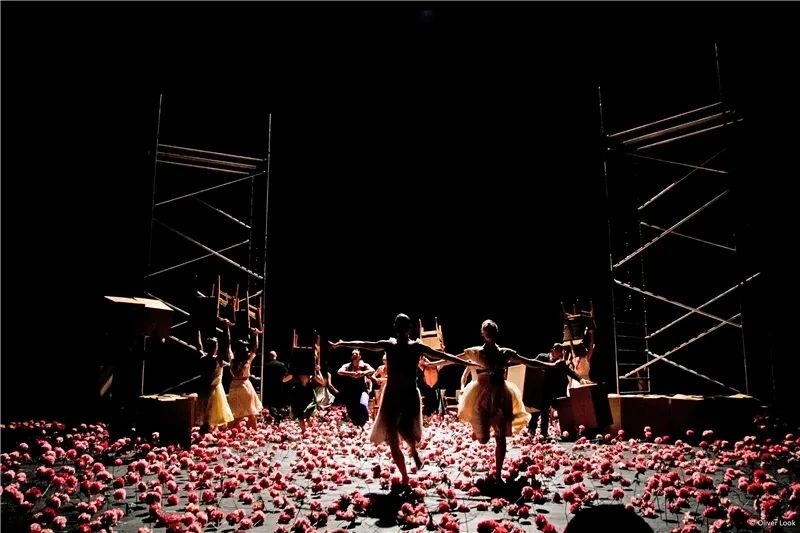 德国舞蹈艺术家皮娜·鲍什的作品《拭窗者》(Der Fensterputzer)中,舞台设置成一座被花瓣堆积的山坡,平面处也被洒满了花瓣,演员在花瓣间进行表演。皮娜·鲍什的作品通常从女性的视角探讨男女之间的爱与冲突,在此基础上将舞台用大面积鲜花营造出的效果非常具有视觉情感冲击。