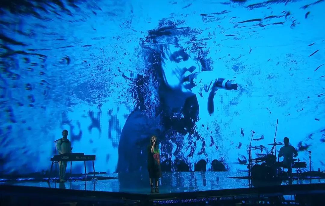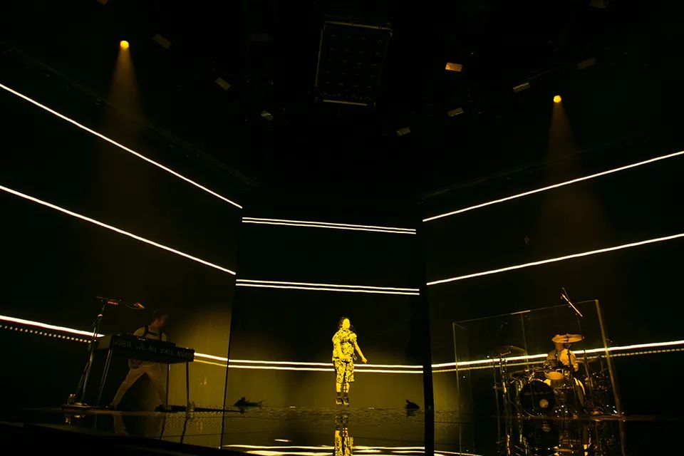 “ 当所有人入睡时”世界巡回演唱会是Billie Eilish的第二场巡回演唱会,整个舞台采用“钻石”结构造型,背景为三面LED屏幕,三面LED以45°方式呈现立体式设计结构,舞台地面也融入了地屏设计。从情感和主题上讲,Billie 和Finneas在她的许多歌曲中都创造了角色,因此设计团队努力将舞台创建成一个沉浸式视频环境,希望在表演过程中让观众感受到每首歌所带来的不同的角色和不同的感觉。