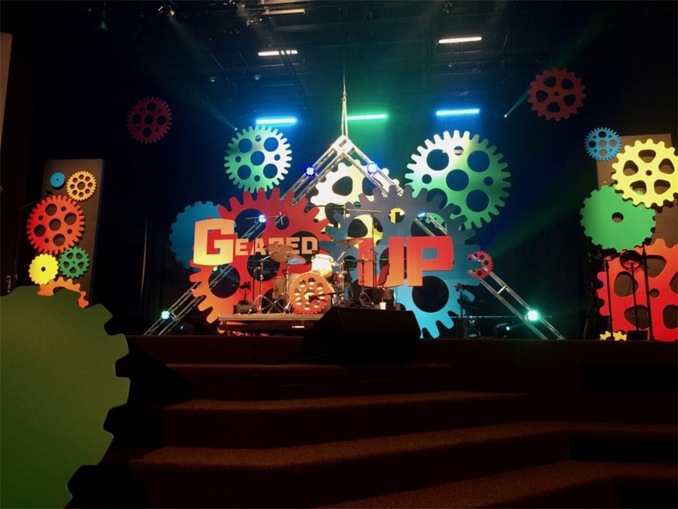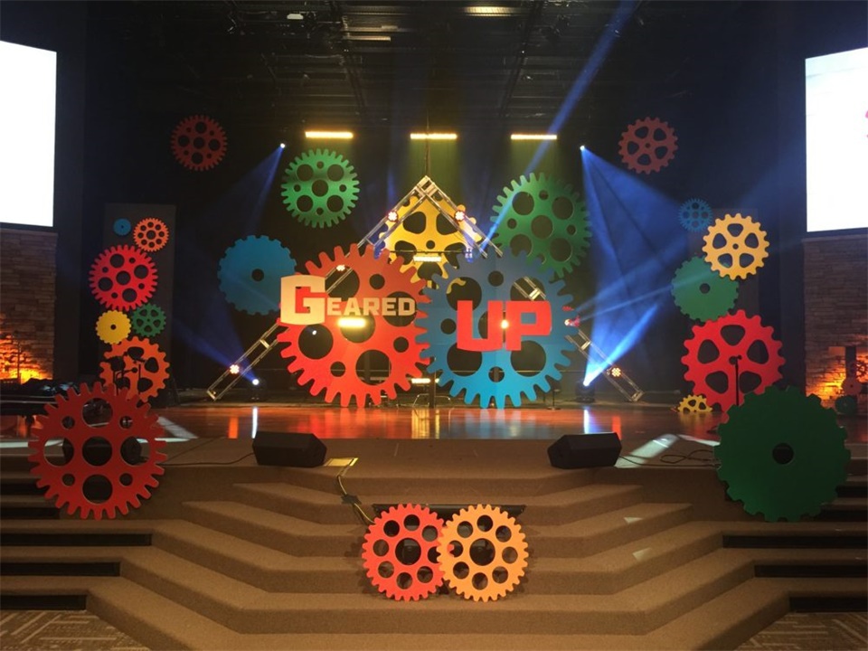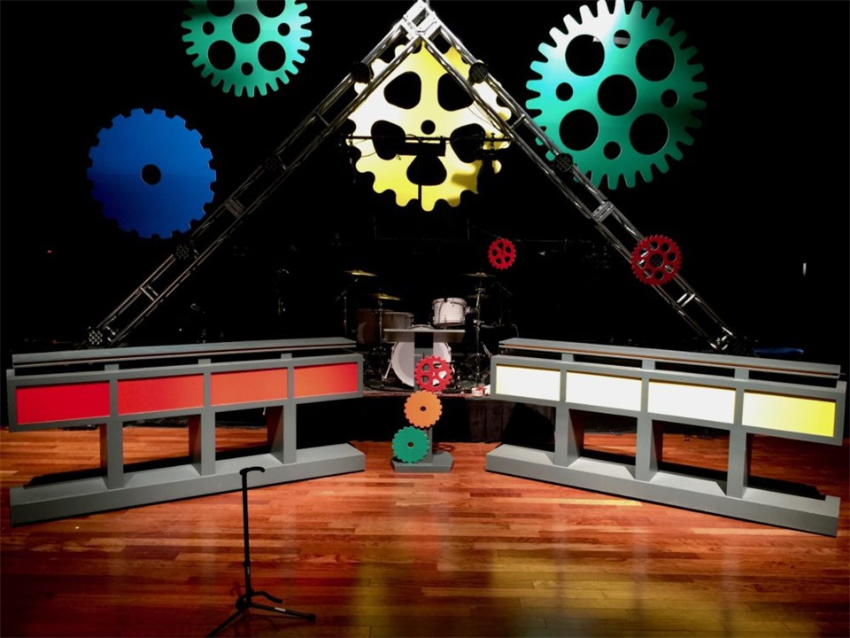 儿童活动的舞美设计可以用什么元素来体现儿童的活泼可爱?七彩的舞美设计更能吸引孩子们的注意力,那不如在儿童活动的舞美中设计各种大小、色彩丰富的齿轮,并根据不同的舞台进深来布置以增加层次感。而这些齿轮的材料可以用普通的泡沫来制作,这样也可以减轻舞台背景的重量,颜色则可以使用手喷漆着色。