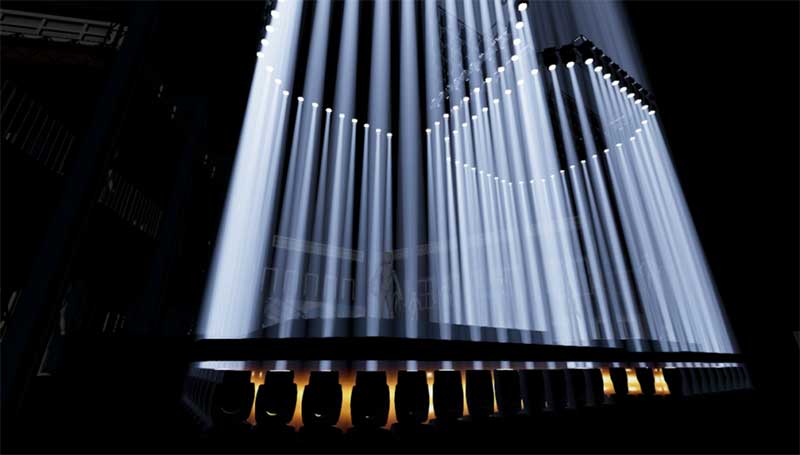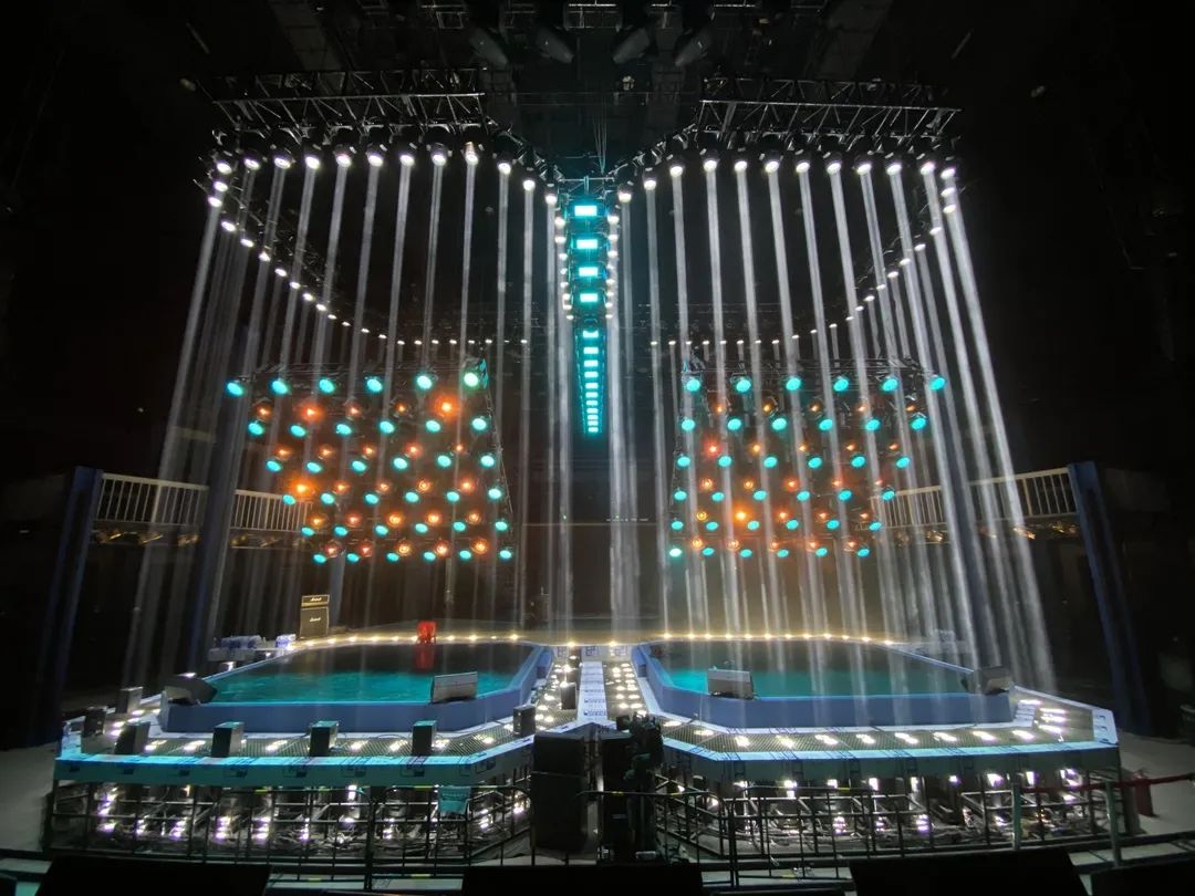 今年的《明日之子》以高校为背景,学员们都是学生,因此舞美设计也与之呼应,主题被定为“怪有力”高校,海选的舞台被打造成了一间摆放了各种乐器的教室。为了呈现理想的画面和人物光,大盟团队采用了影视灯和舞台灯结合的方式来进行海选场景的布置,利用影视灯柔和的光质,对场景进行基础的布光,再利用led切割灯单独雕琢每个光区。由于光区较多,仅切割灯就用了七十多台,且每一台灯都进行了严格的光比控制。