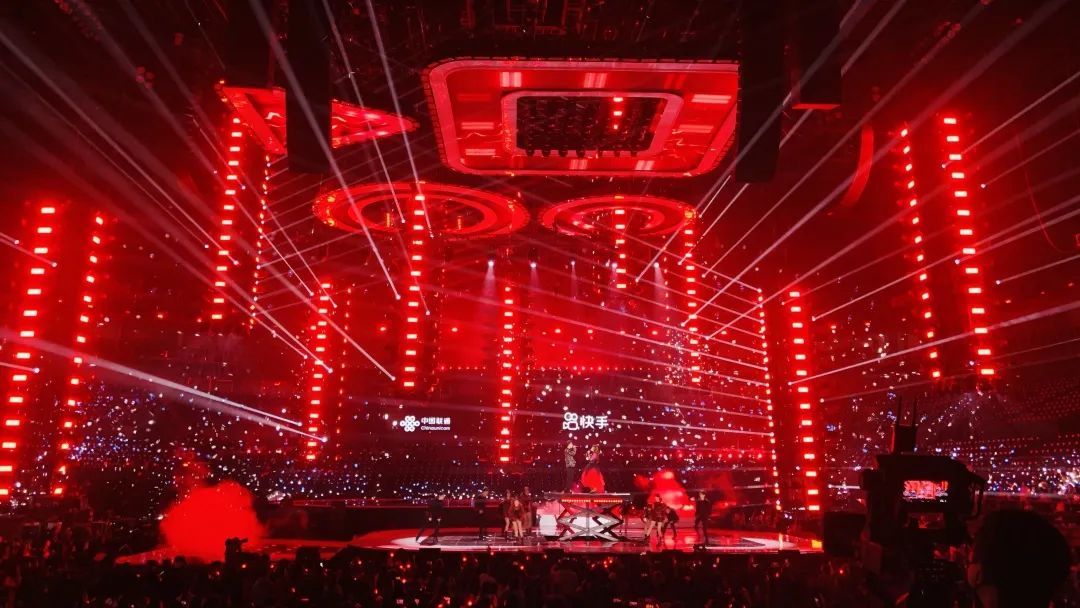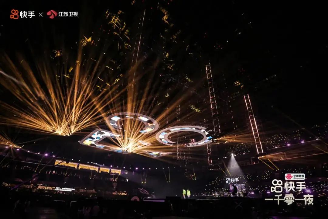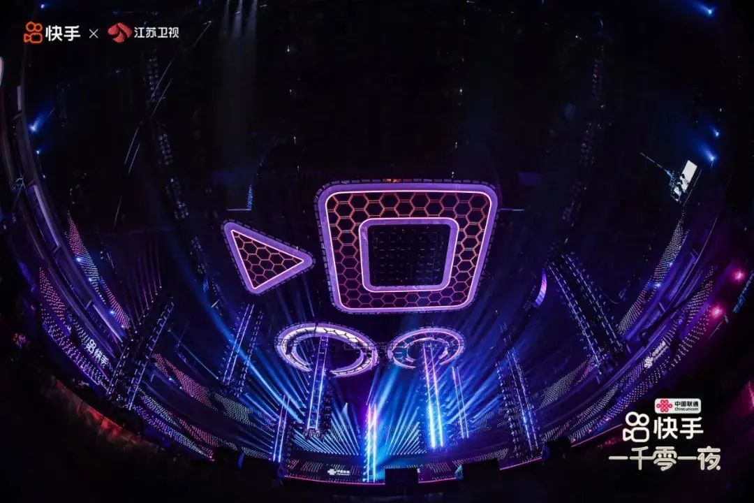 快手“一千零一夜”是由快手和江苏卫视联手打造的年度娱乐盛典。以“人间烟火+奇幻科技”为主概念,配合素人、明星等多样化的节目,为观众呈现一场精彩的视觉盛宴。此次晚会的舞美设计以快手的LOGO为核心,地面舞美设计巧妙拆解了快手的logo,采用了物理世界中最基础的几何图形三角、方块、圆形来组合,形成多舞台地面格局,丰富节目创作层次的同时,也与快手LOGO标识一致,经典元素结合极具现代感的图形使舞美展现的寓意更加深刻。 为呼应地面舞台造型形式,快手“一千零一夜”也向天空制景,在舞台上空制作了个同款几何造型。