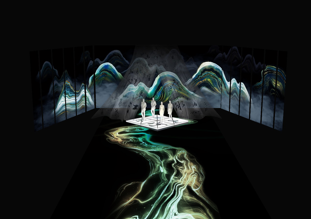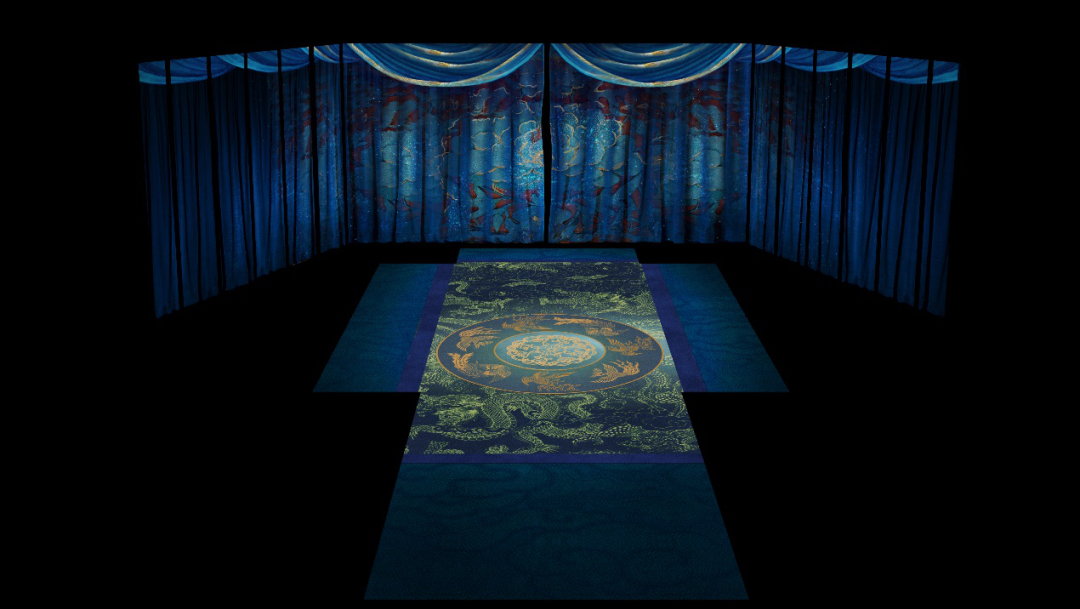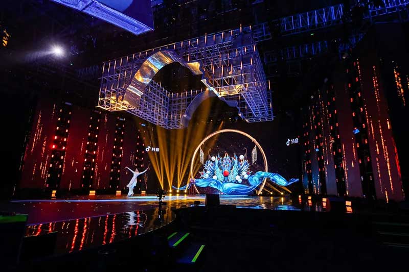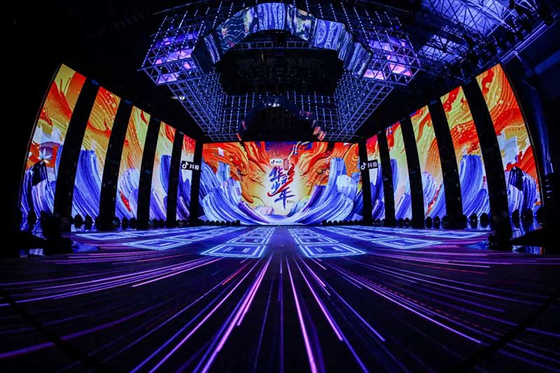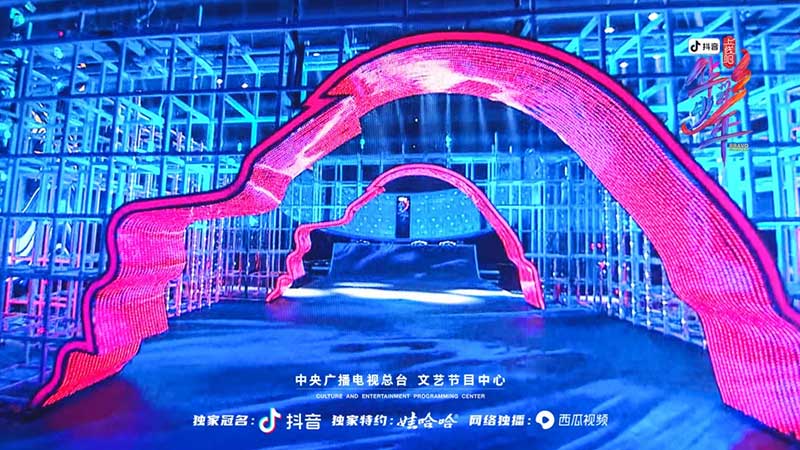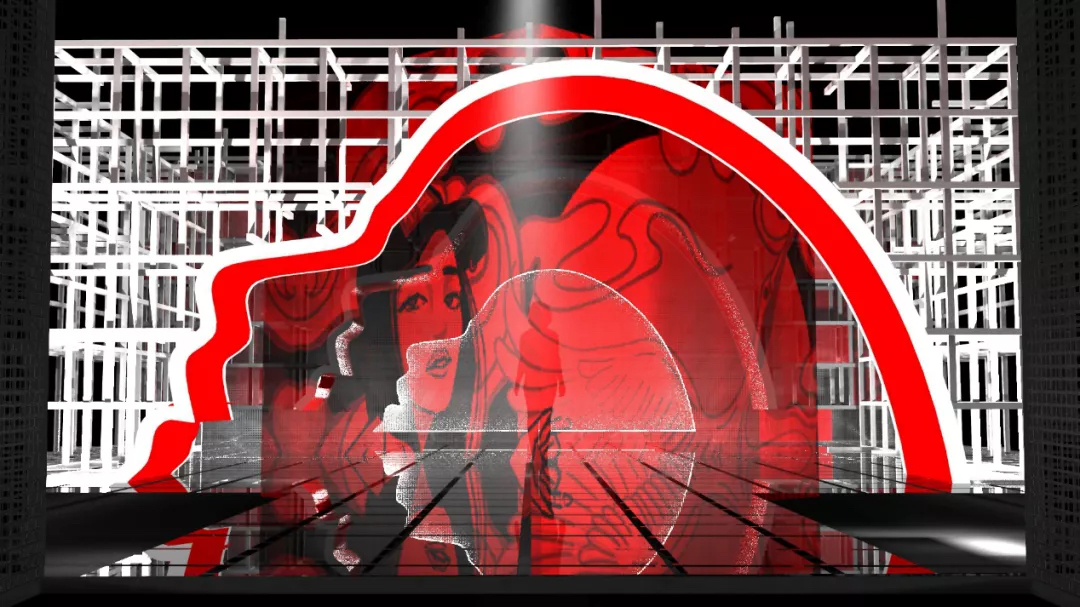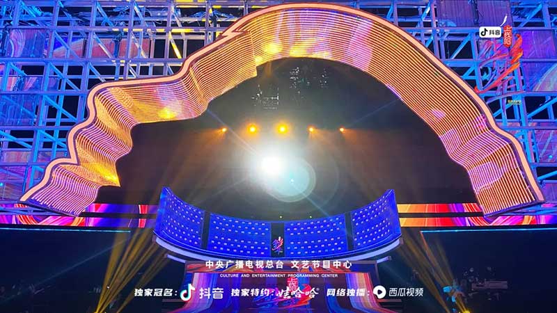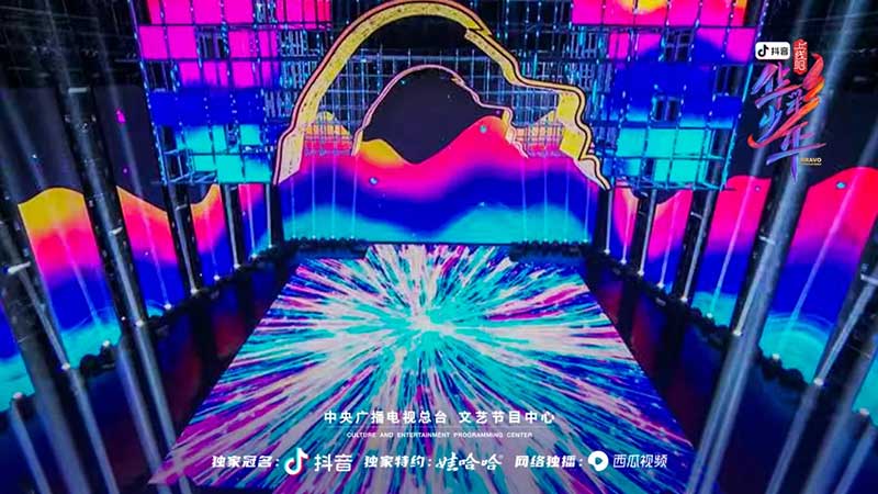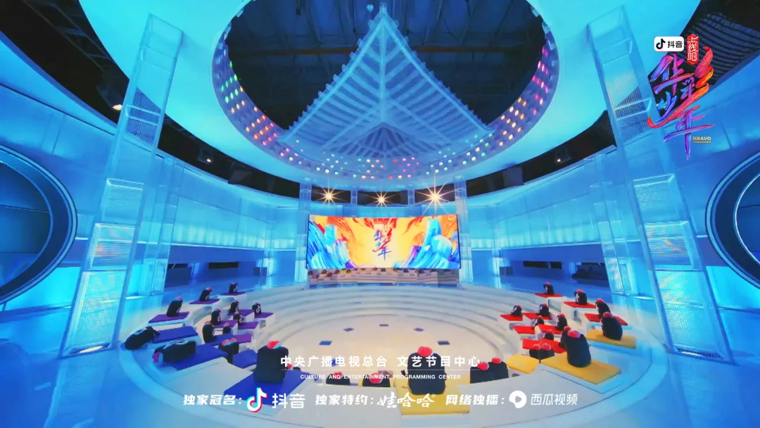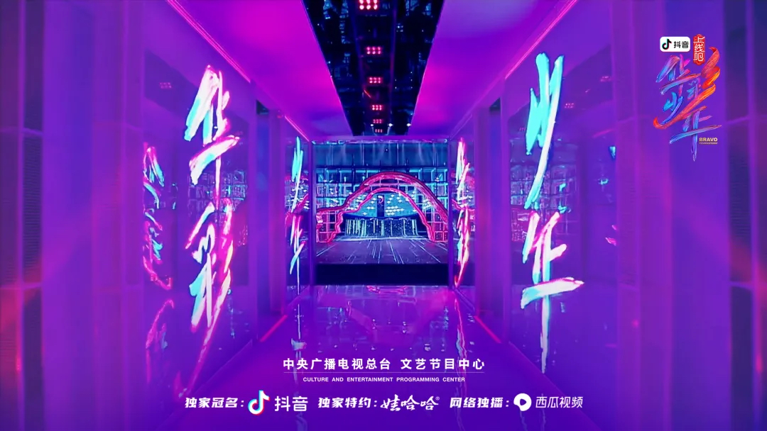 《上线吧!华彩少年》舞美设计最初的创意就来源于节目的主角——一群风华正茂充满生命力的少年。舞美总设计以抬头仰望天空的侧脸轮廓作为主视觉,既是舞台上少年们意气风发的缩影,也希望能够表达对于他们美好前程的愿景:无畏生长,逐梦前行,聚力向上,未来可期。镂空的框架形象悬于正中,横竖相接取意于榫卯的拼插结构,是对于艺术的传承。而少年的脸横贯其中,更体现着对于规则的打破。组成空间的四个垂直立面可以分离升降,简洁而有效的机械变化承载了对于节目的仪式需要和表演功能。还可通过内嵌的LED视频灯带得以实现装置整体颜色的瞬息变幻,而横截面的镜面反射材质亦与灯光效果相得益彰,使得整个舞台视觉上晶莹闪亮、流光溢彩。