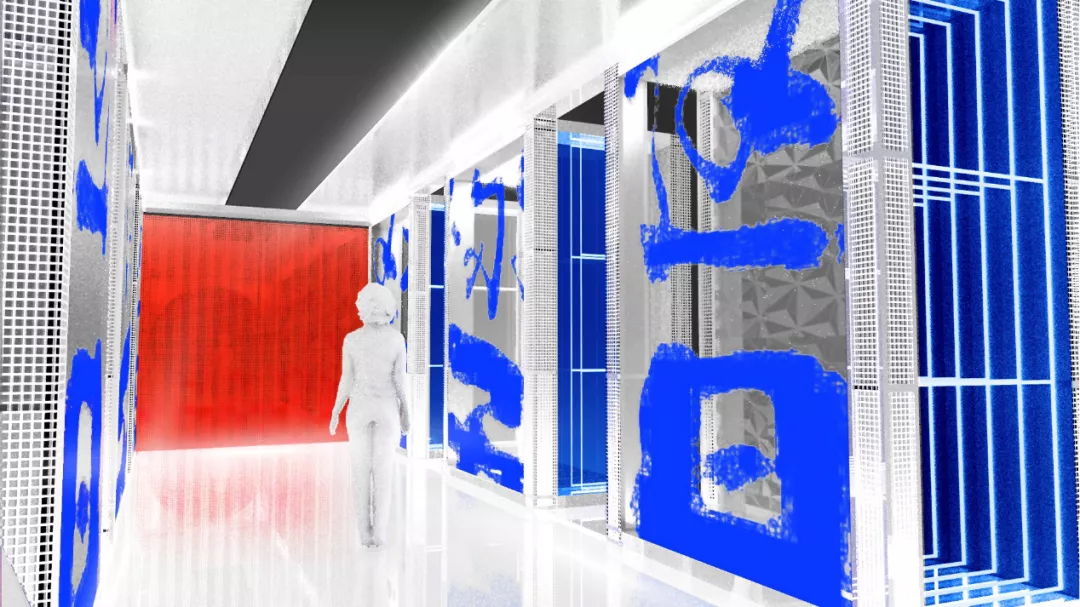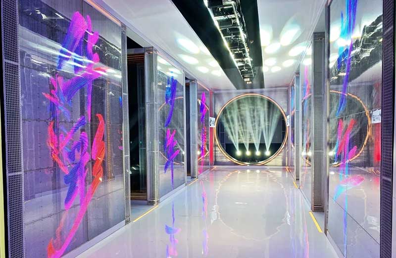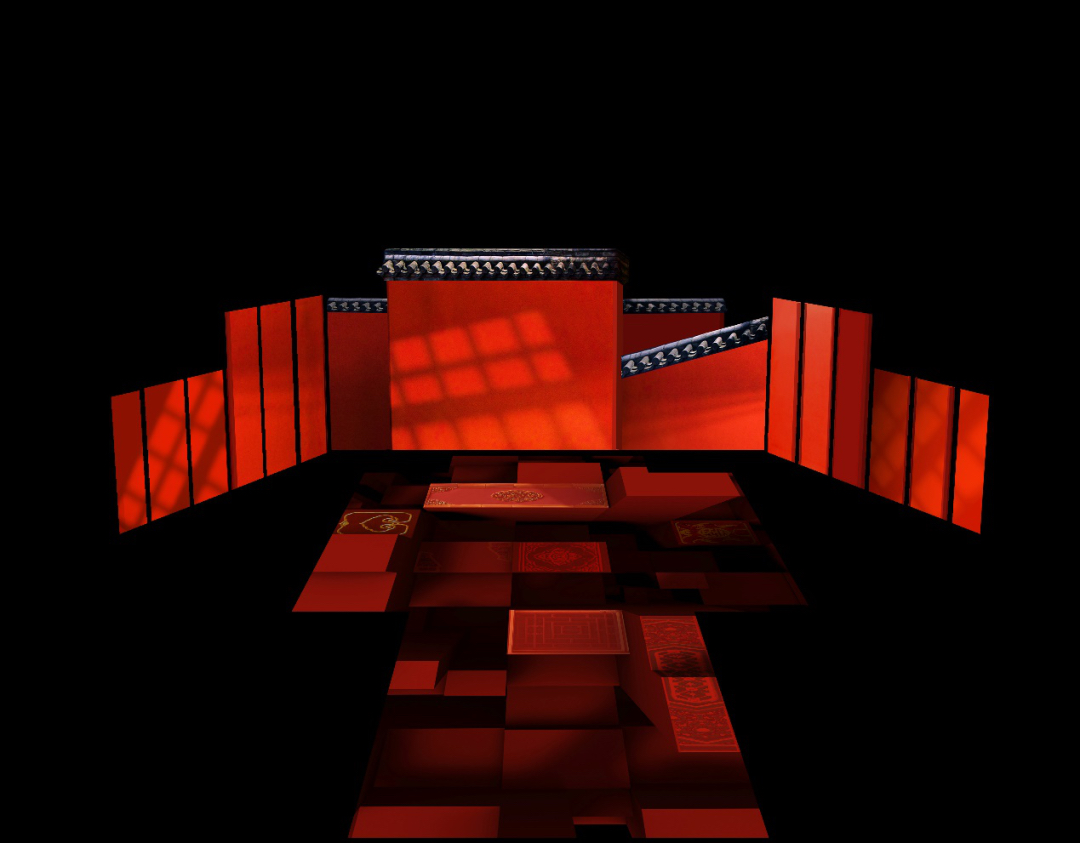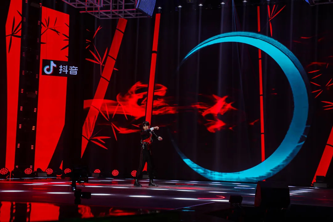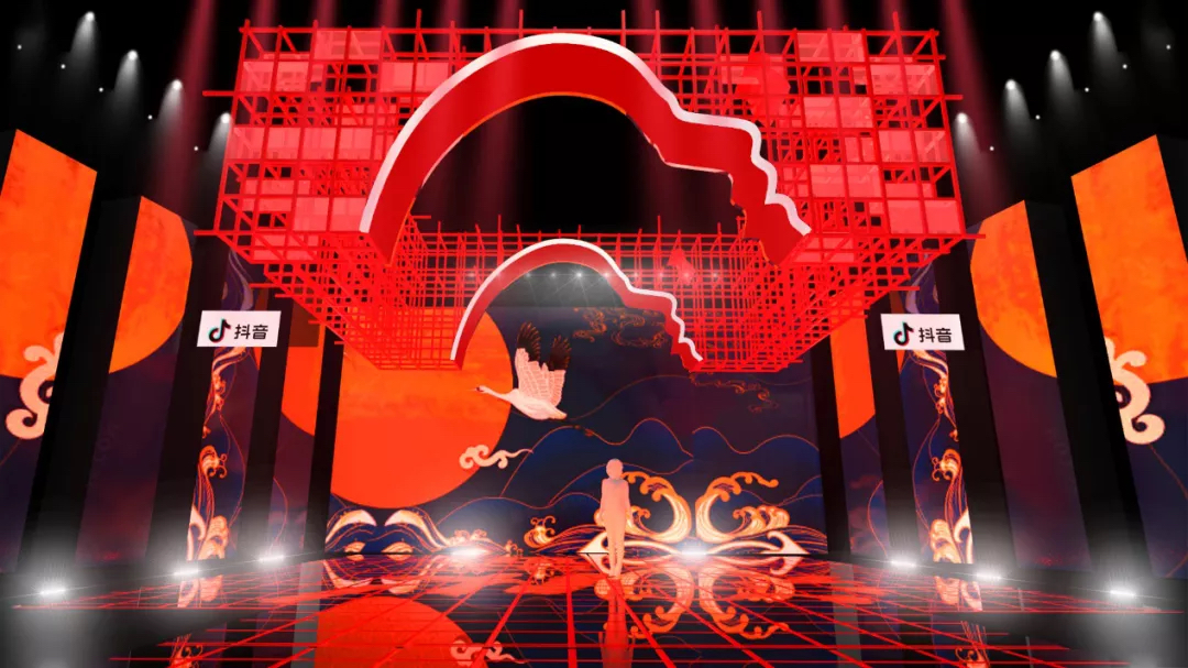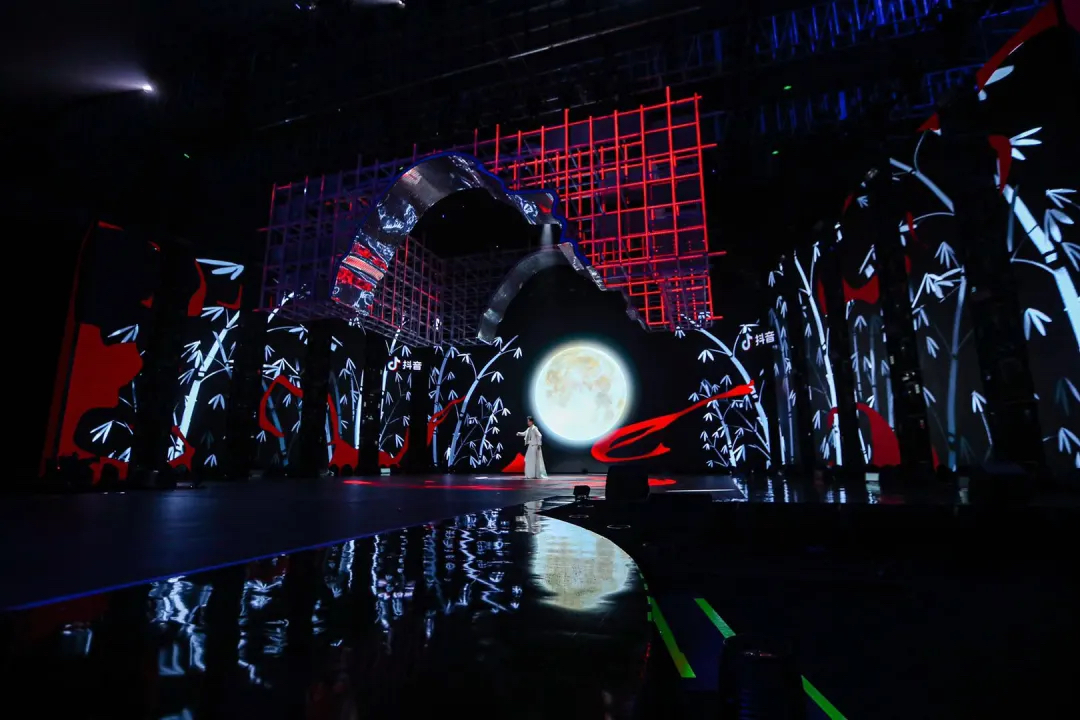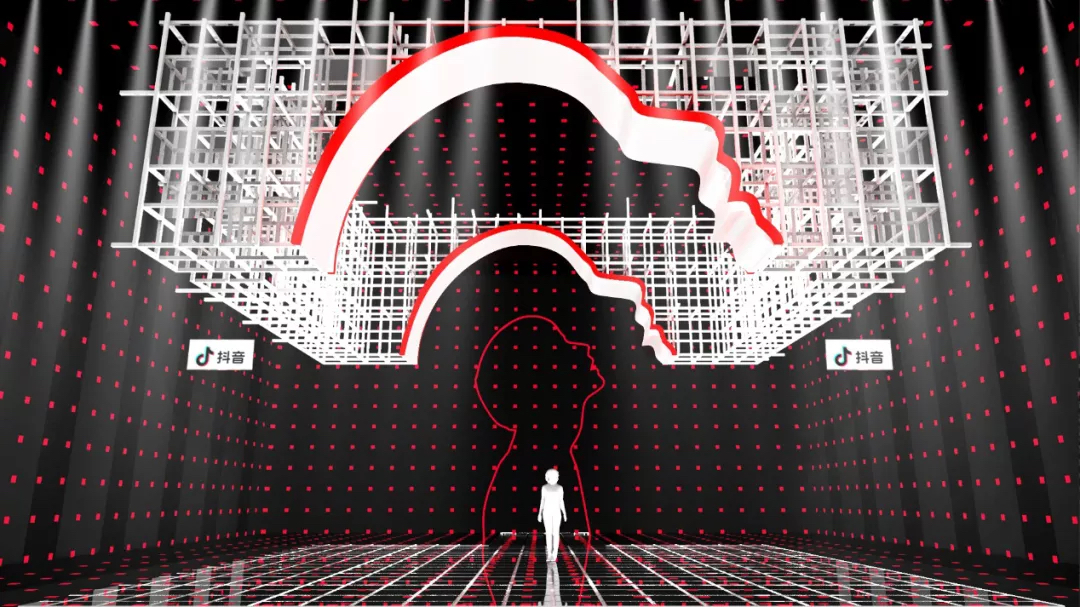 第二现场的设计气质则延续了对于传统古建的现代化解构,半下沉的中庭坐落在一方轻盈的“院墙”之中。意向化的月亮门更加凸显出中式的审美与构图,可谓方中带圆,圆中露方。上空利用铁网编织出若隐若现的飞檐,是国风概念与潮流元素的统一,呈现着贯穿始终的文化自信。通向主舞台的廊道则拓展了半透材料的应用,与冰屏相结合创造出纯粹剔透的白色空间,干净美好正如一张白纸,等待着青春活力的少年们释放能量,画出炫彩的一笔。