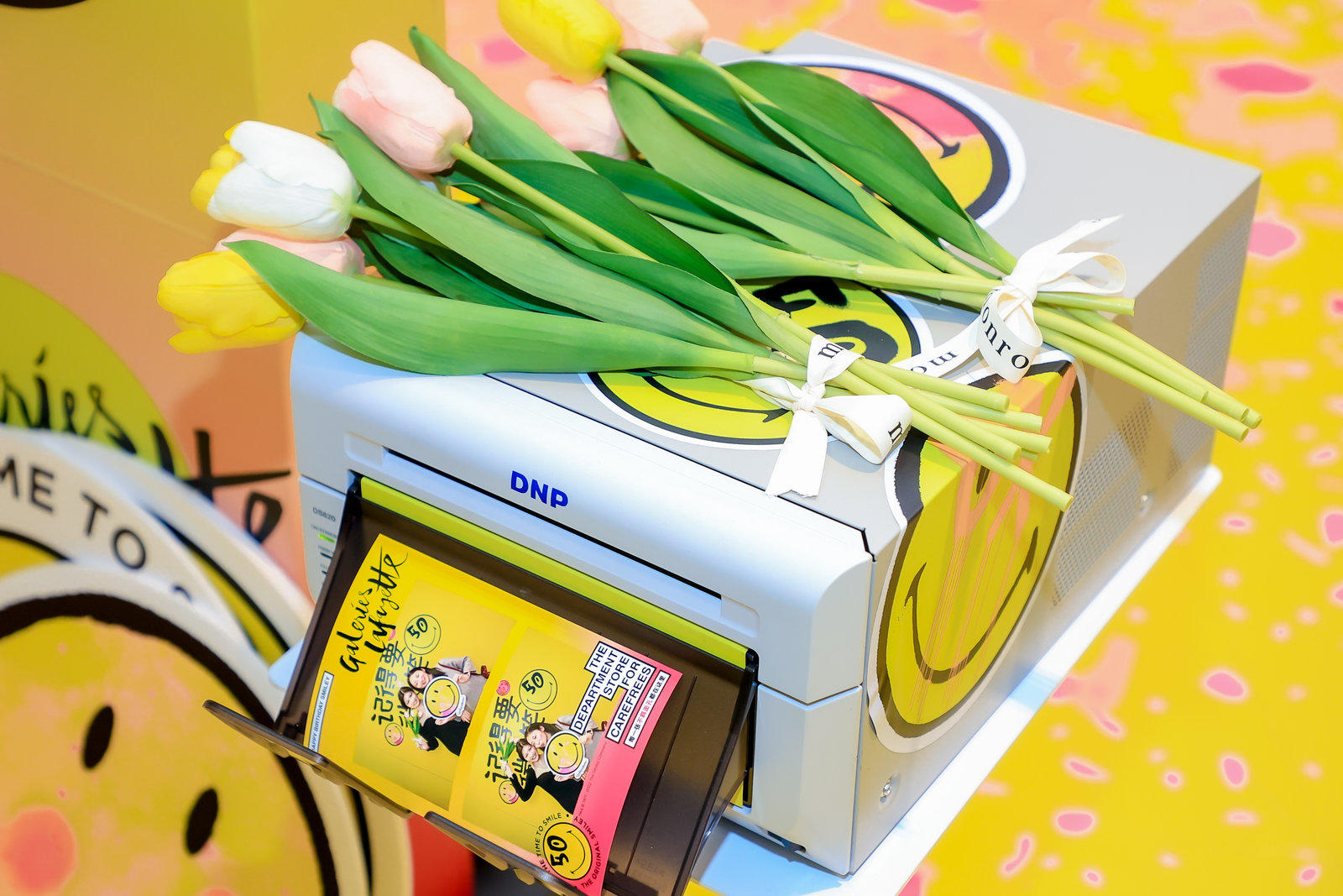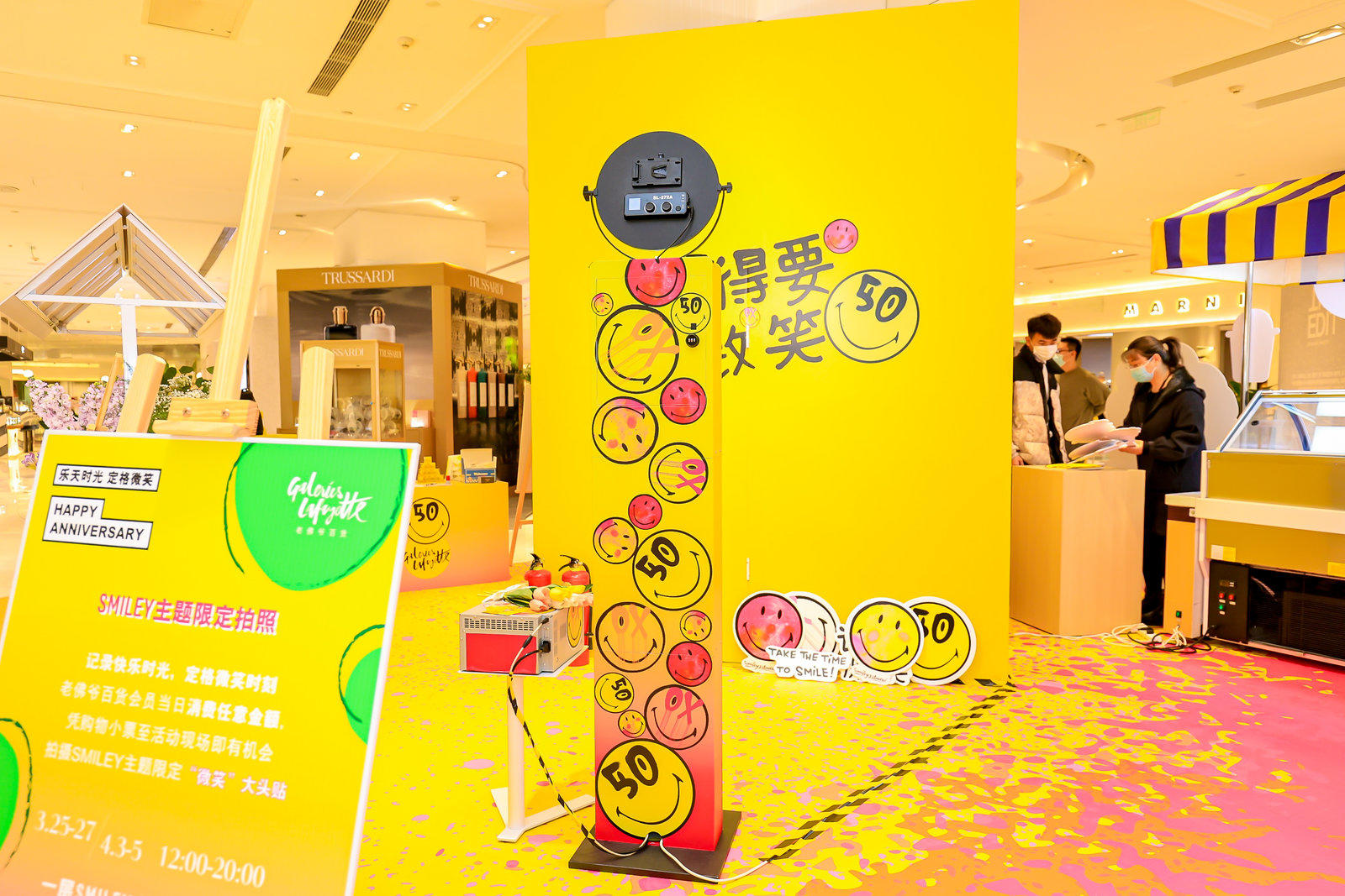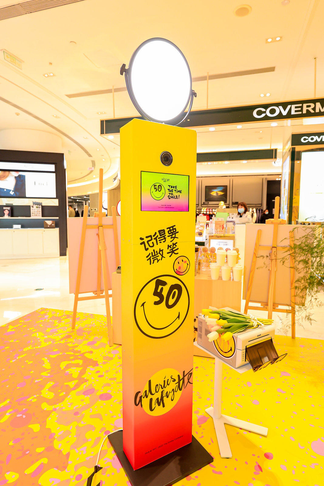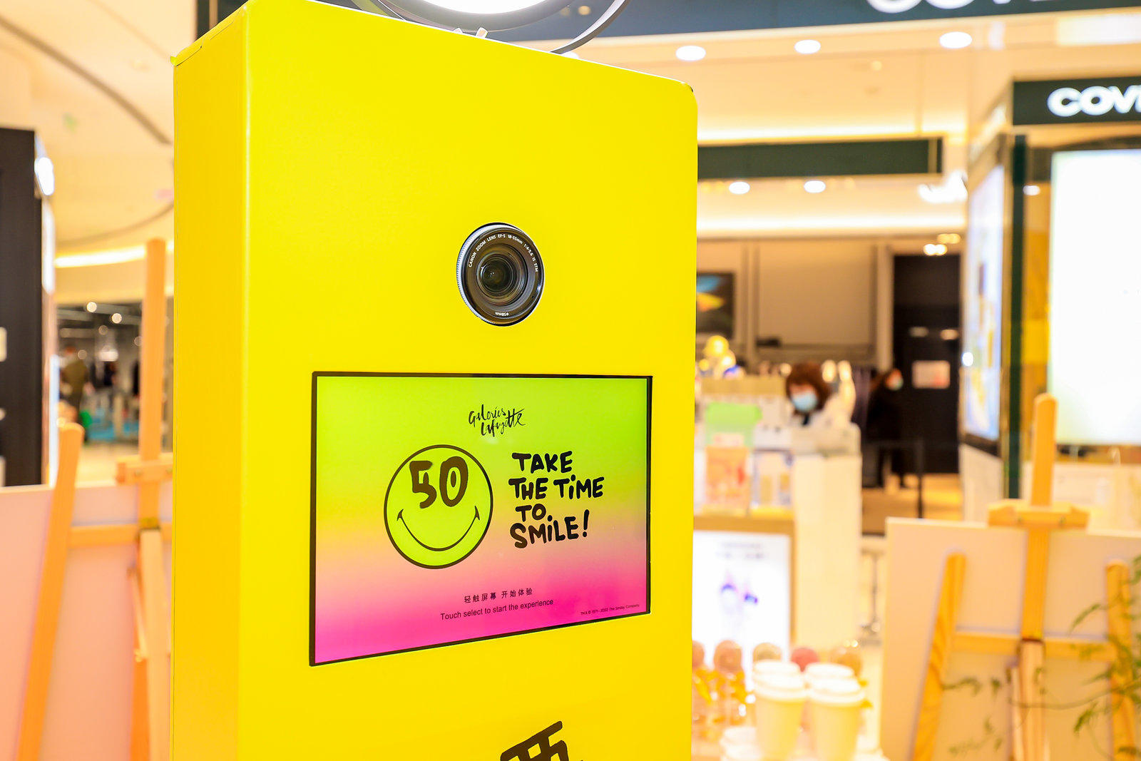 Fun Box为巴黎老佛爷百货店庆 X SMILEY50周年庆特别定制了一场以“take the time to smile!记得要微笑!”为主题的互动拍照活动 。体验区在老佛爷百货中庭,被SMILEY标志性笑脸占据的快闪互动区,前来体验FunBox的顾客络绎不绝,大家天然的会被快乐的气氛打动,在镜头前留下最灿烂的微笑,甚至愿意多打印一张照片,自己贴在展示板上,吸引更多人来体验互动拍照的乐趣。