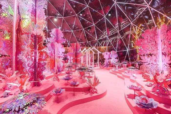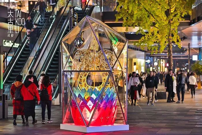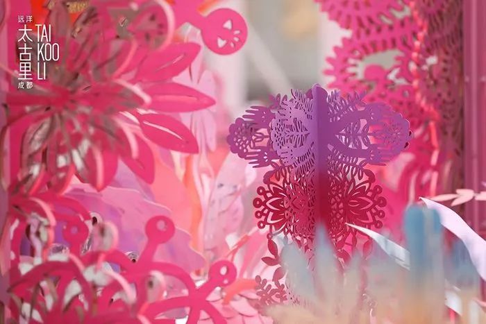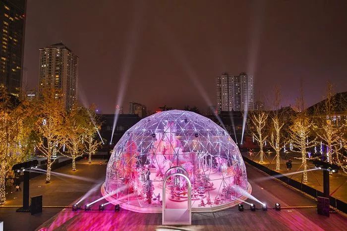 成都远洋太古里邀请中国青年知名纸艺艺术家陈粉丸,呈现“未来漫游,自然回响 NATURE’S LYRICS FROM THE FUTURE”主题活动。将未来城市“穿越时空”展现于漫广场和里巷之中,用环保纸制装置结合声光影及气味,造就一座充满未来感的如梦森林,让参观者进入了一场时光的梦影里,与时间和自然对话,探索城市与生活的理想样本。在启幕仪式现场,“未来漫游,自然回响NATURE’S LYRICS FROM THE FUTURE”公共互动主装置于成都远洋太古里漫广场开启:来自未来的“气泡森林”中,艺术家以成都远洋太古里里巷中真实的植物为蓝本,提取线条造型并加入手型符号,凝练成人与自然结合的图腾。与主装置形成配合和呼应的,还有散落在里巷中的“自然漫游”装置点:东里入口的“生命树”,是一棵不断生长、更新的共生之树;南中里二层的“生如夏花”,展现了如夏花般绚烂不息蓬勃生长的生命;北中里二层的“云间”,用轻盈的云朵缔造了通向天空的阶梯;西里二层的“蓝色耳朵”,用自然的声音启发观众对自然的另一种感知。此次活动的全部装置几乎都由回收纸或者环保纸制作,纸材均有FSC森林认证 ,保证其原料来自经认证的可持续经营的森林。同时,装置中的板材均使用回收碎木料重新压制,造型中也使用了回收的冰淇淋木棒等材料。展览结束之后,一部分装置会回到艺术家工作室二次陈列,剩下的部分将会通过回收组织处理,成为新的环保纸和板材。