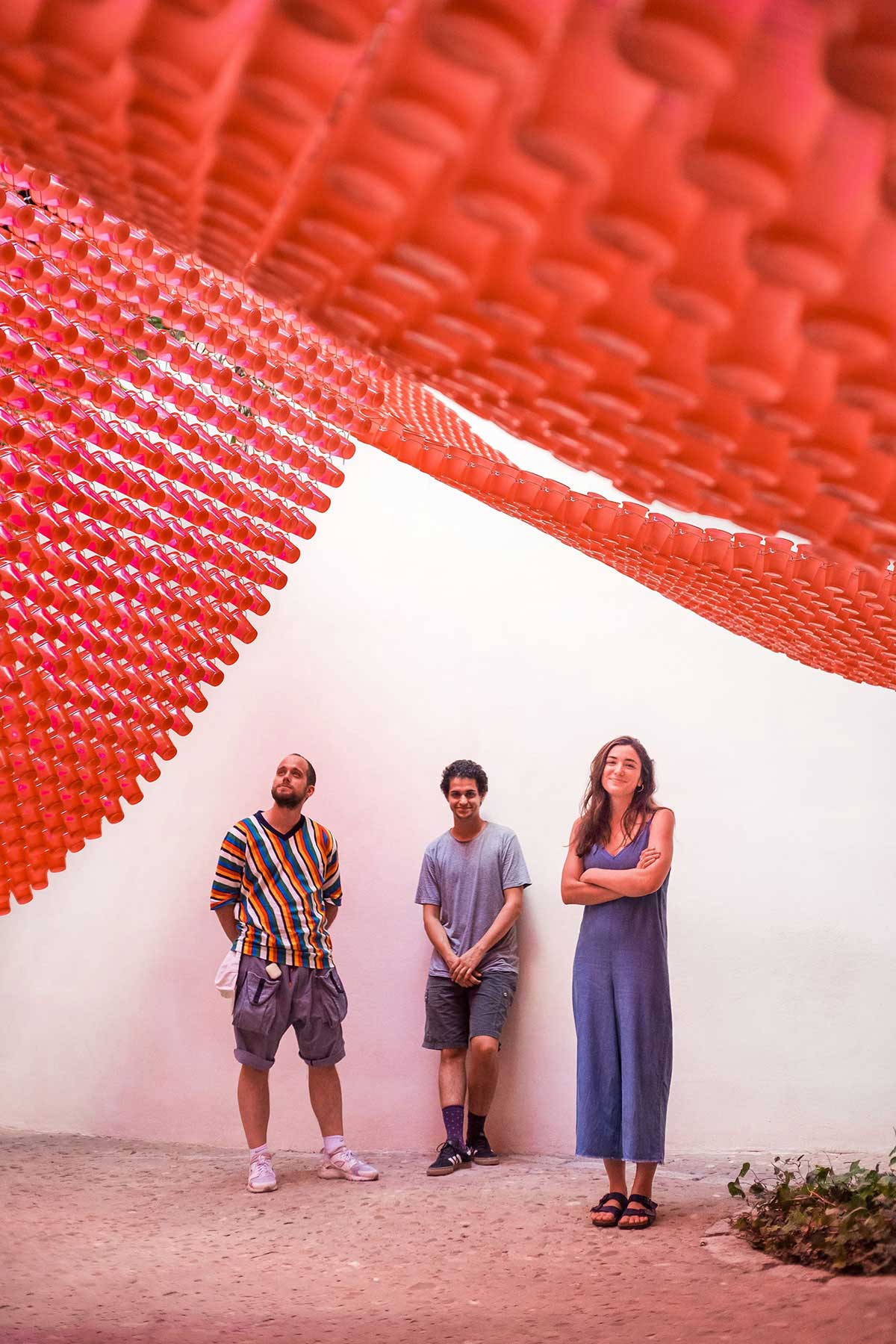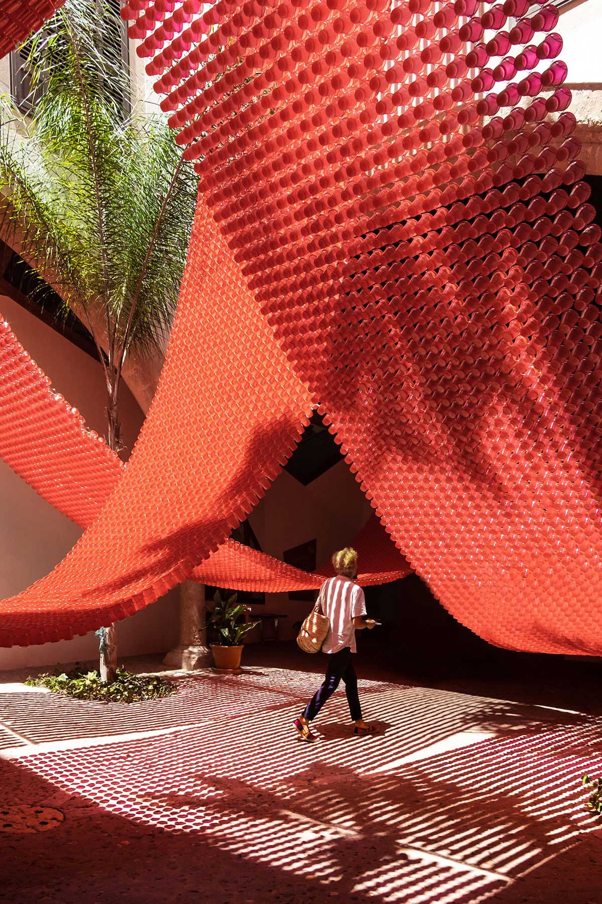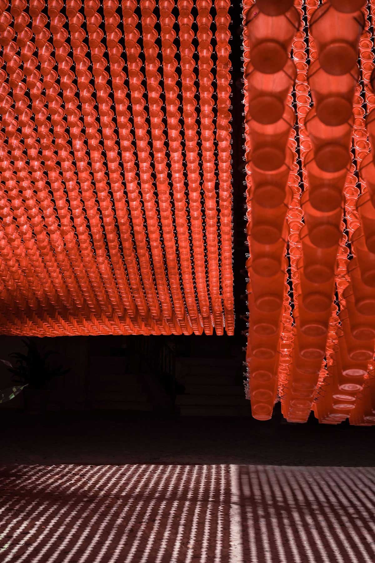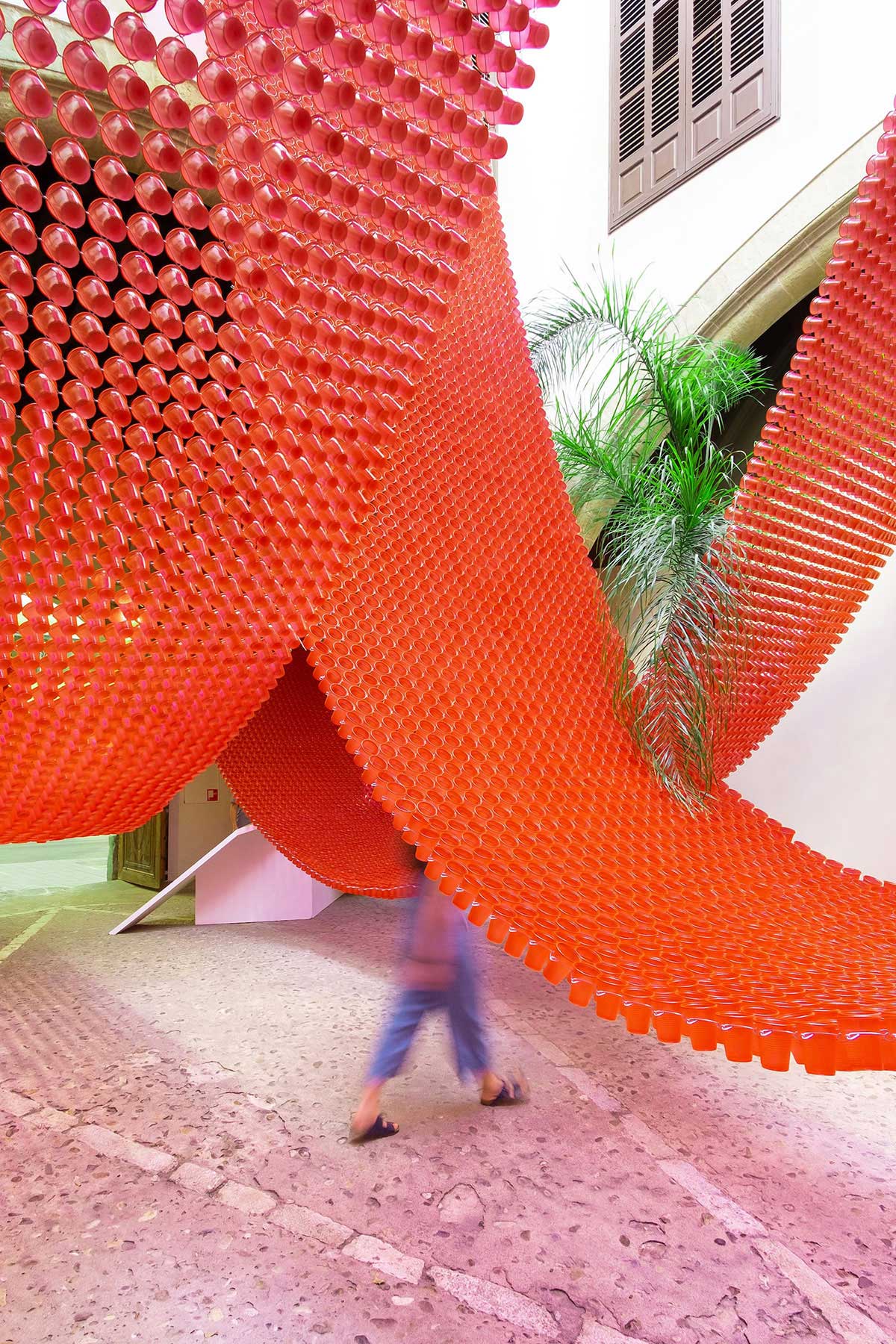 Manuel Bouzas和Santiago del Aguila在马略卡岛帕尔玛的Can Balaguer庭院(由Flores y Prats建筑事务所设计)合作设计了一个名为“悬链线和弧形”的展览展示装置。该展览展示的设计灵感来源于天井石拱门和与之相反的反向几何形体,通过链状结构组合形成了一张轻钢网,上面覆盖着的塑料杯在庭院内部投射出温暖的光线。