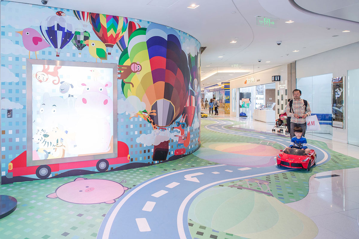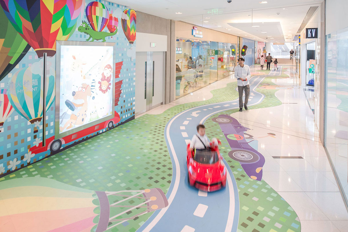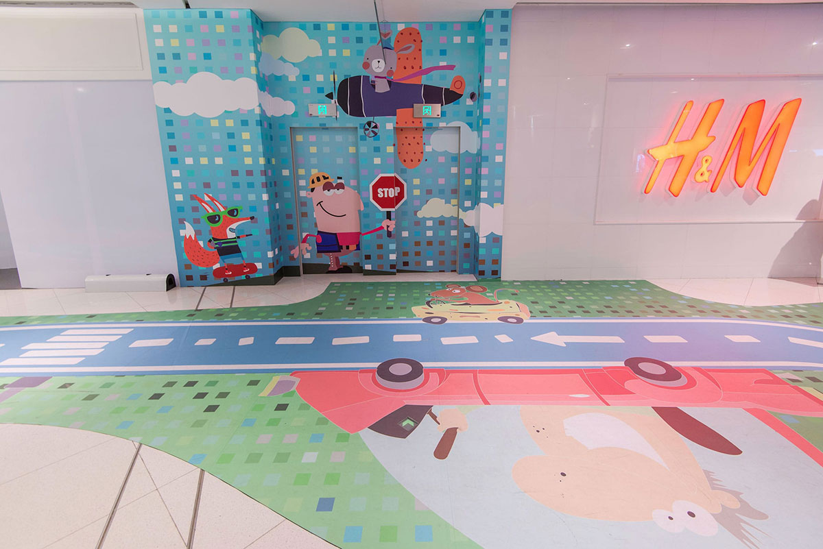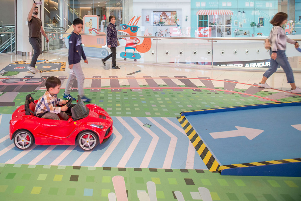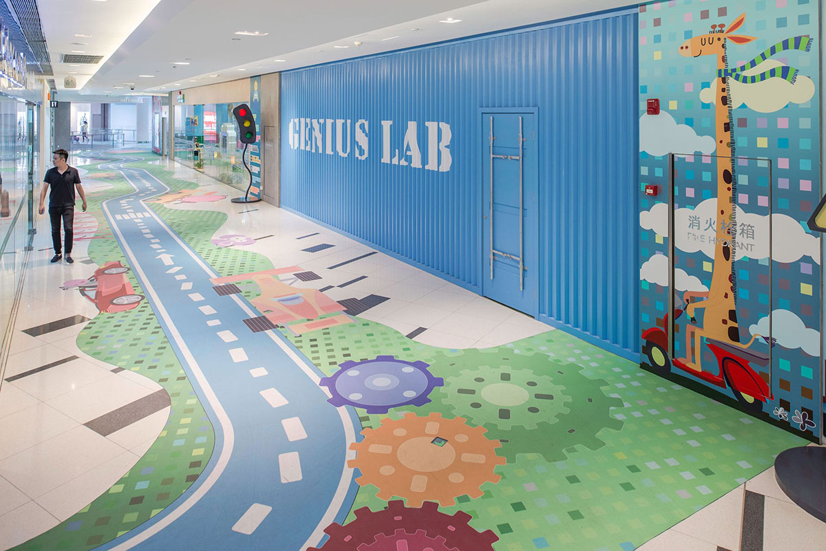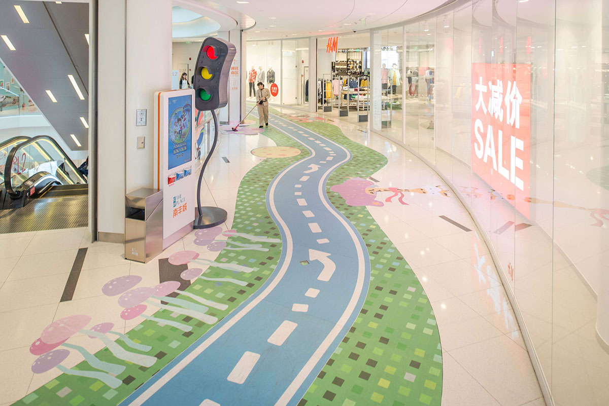 这条位于购物中心二楼的走廊,是一条没有任何商业店面的走廊,由于缺少店面,这条走廊看起来像是一个后宅,人行流通不畅。购物中心希望把它变成一个面向家庭的娱乐空间,可以重新激活购物中心内使用率较低的空间。为了确保商业活动能够正常运作不受到干预的影响,采用了在地面上设计二维图形的方式来达到预期效果,并提出了以儿童为导向的游乐路径,于是“丛林赛跑”的商场美陈设计便这样诞生了。