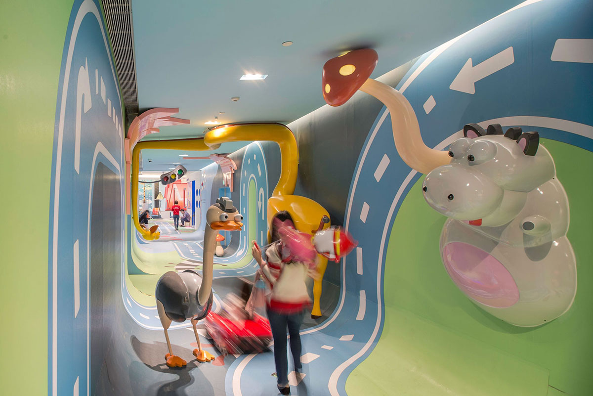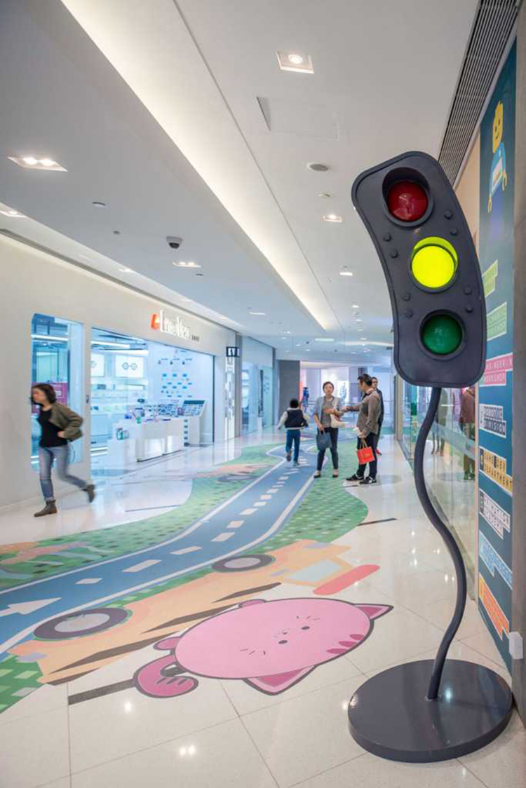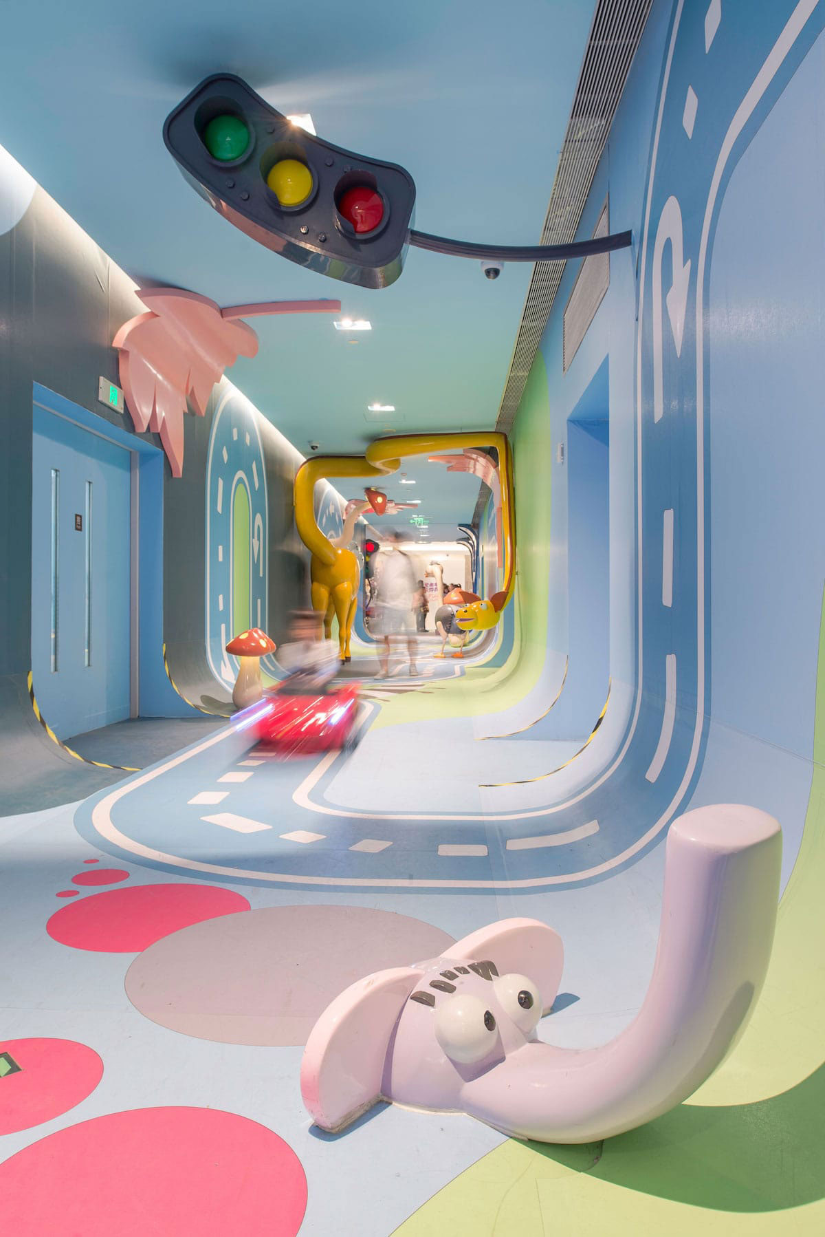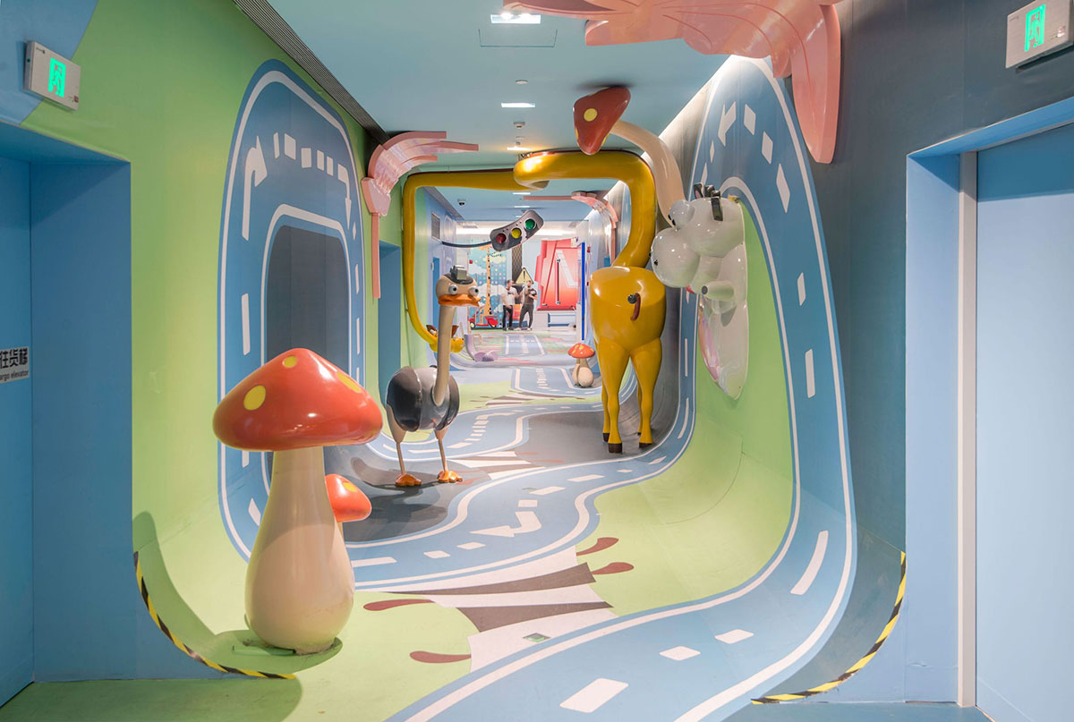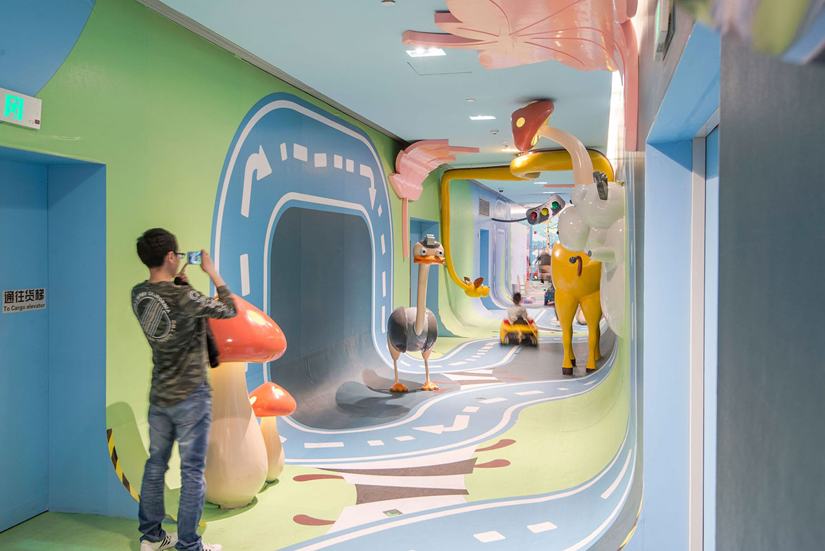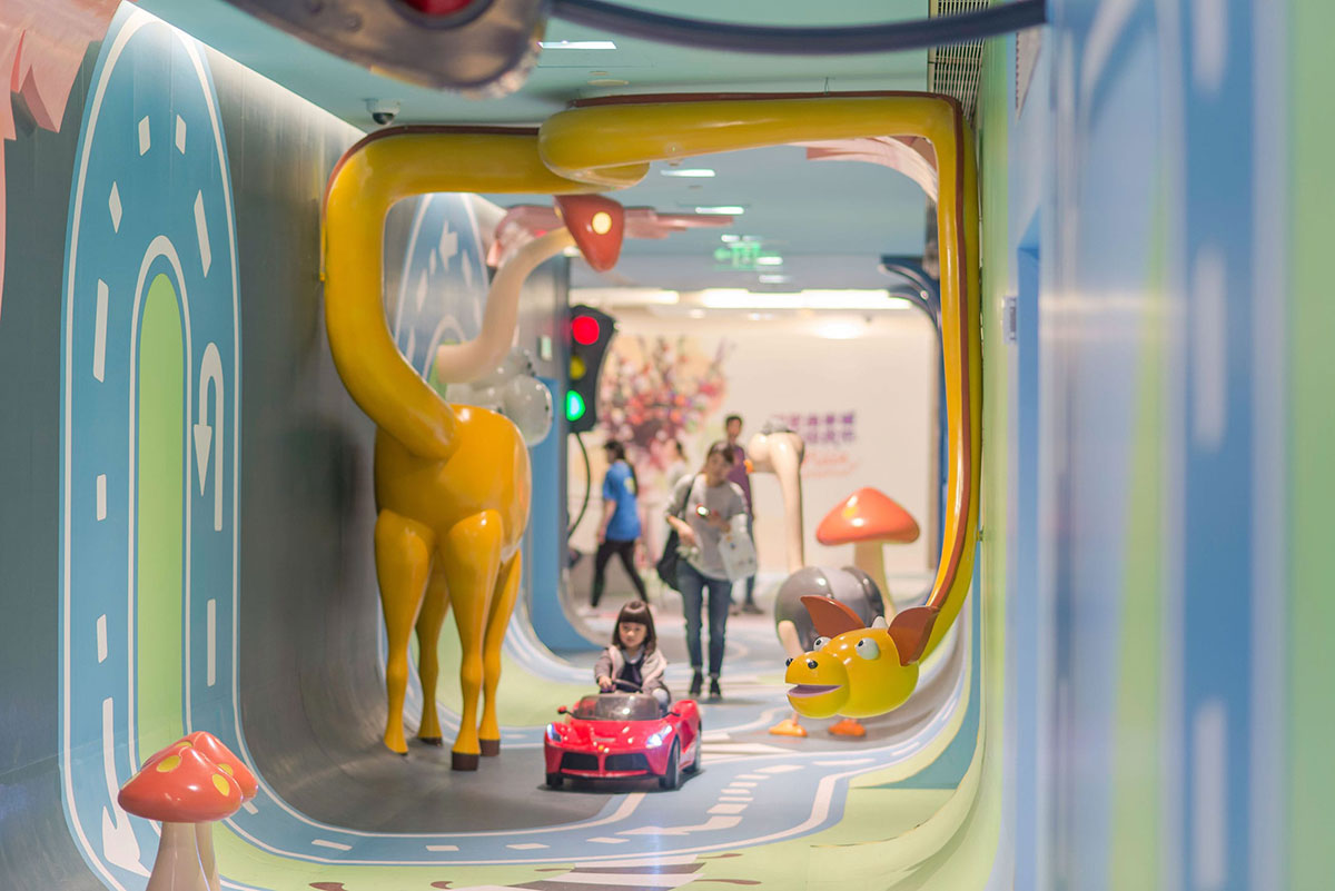 从创造体验的角度来看,这个空间充满了惊喜和故事性,体验路线有自己的情境节奏和互动元素,让孩子和大人们都能够体验参与进来。整条走廊也实现了互动照明,灯光嵌入蘑菇和交通信号灯中,每当孩子们开着小车过来,这些灯就会被自动点亮。