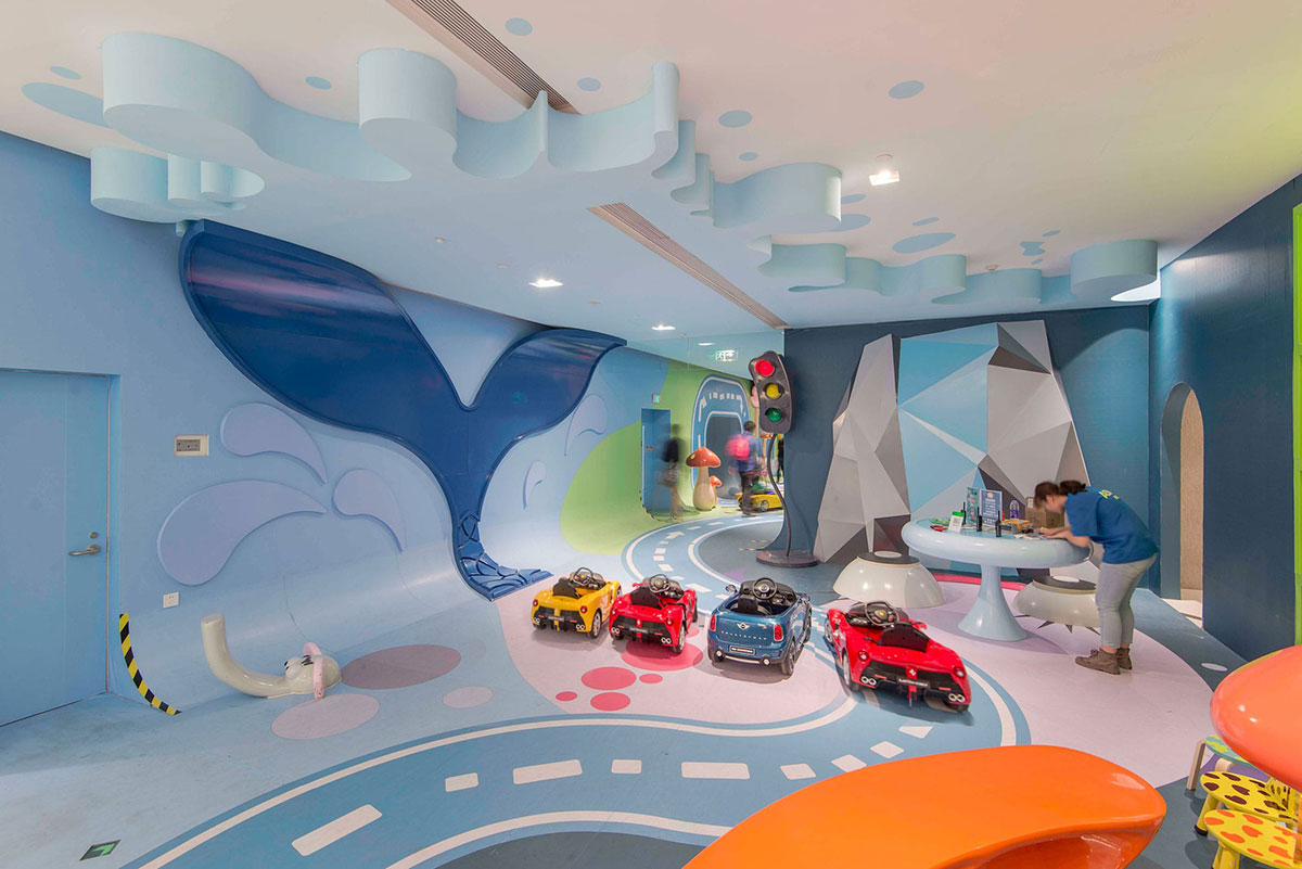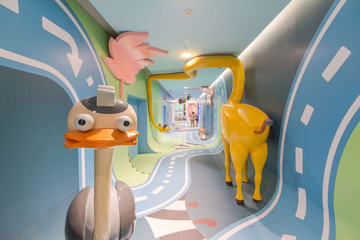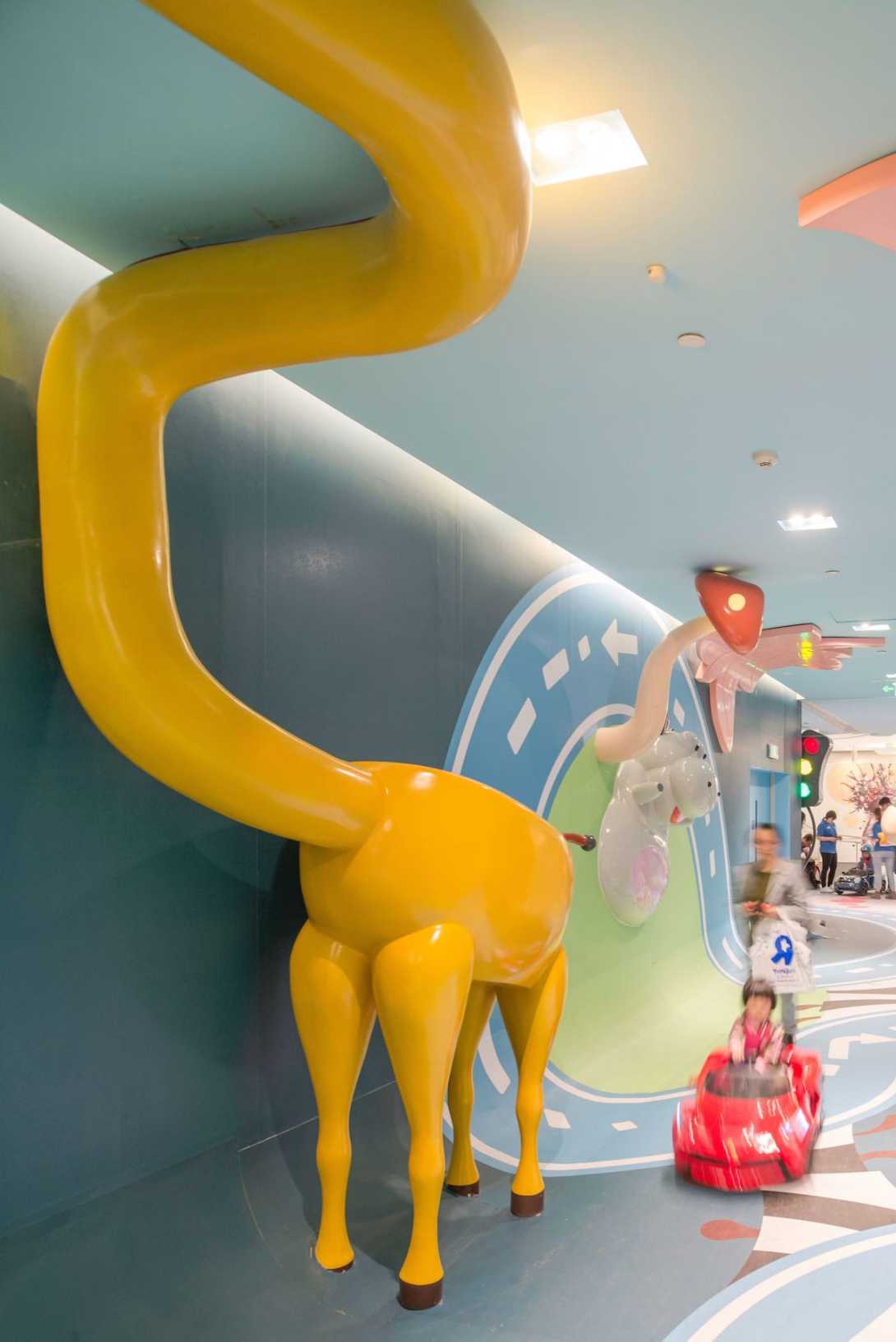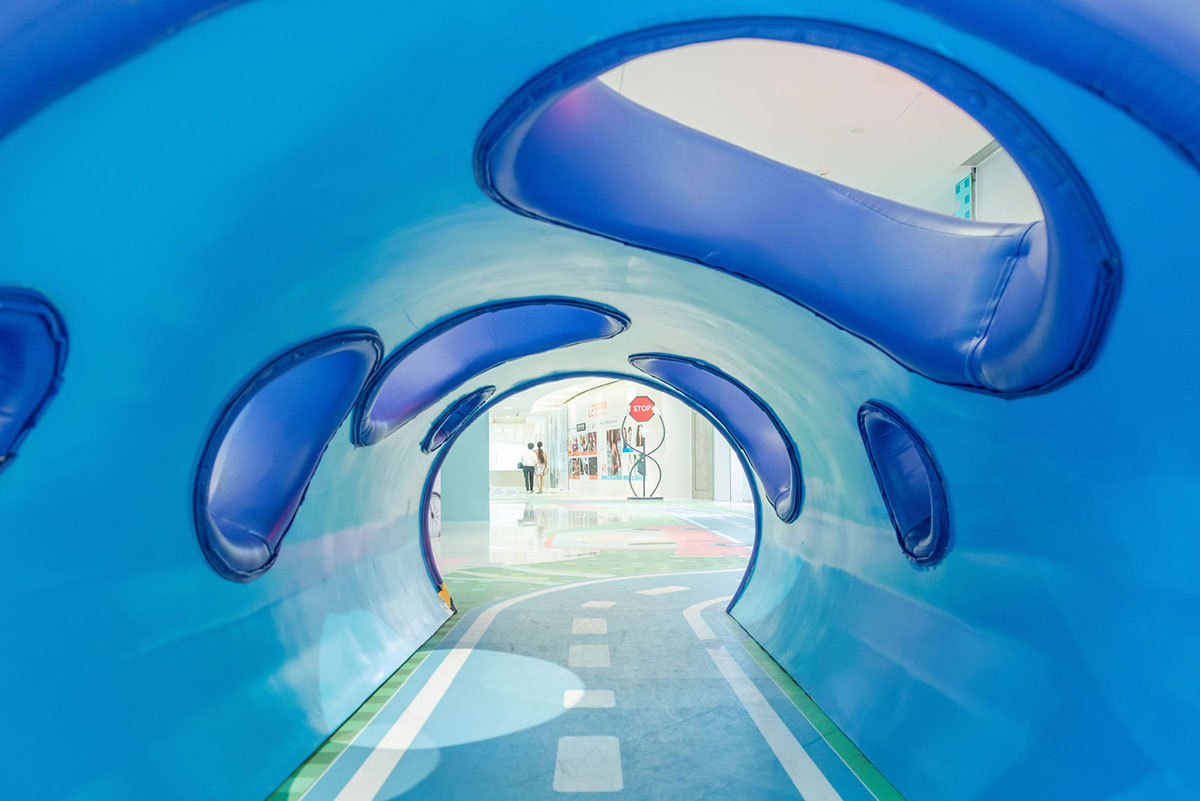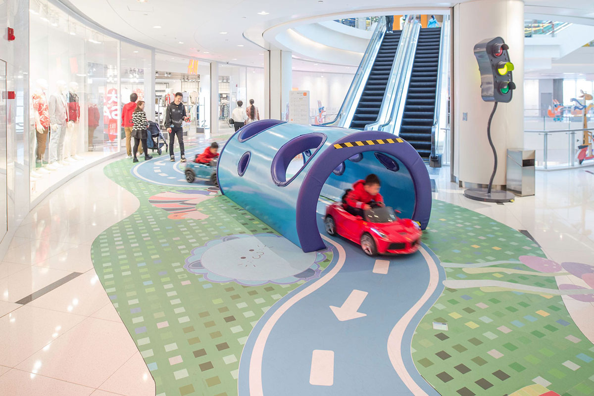 从创造体验的角度来看,这个空间充满了惊喜和故事性,体验路线有自己的情境节奏和互动元素,让孩子和大人们都能够体验参与进来。整条走廊也实现了互动照明,灯光嵌入蘑菇和交通信号灯中,每当孩子们开着小车过来,这些灯就会被自动点亮。