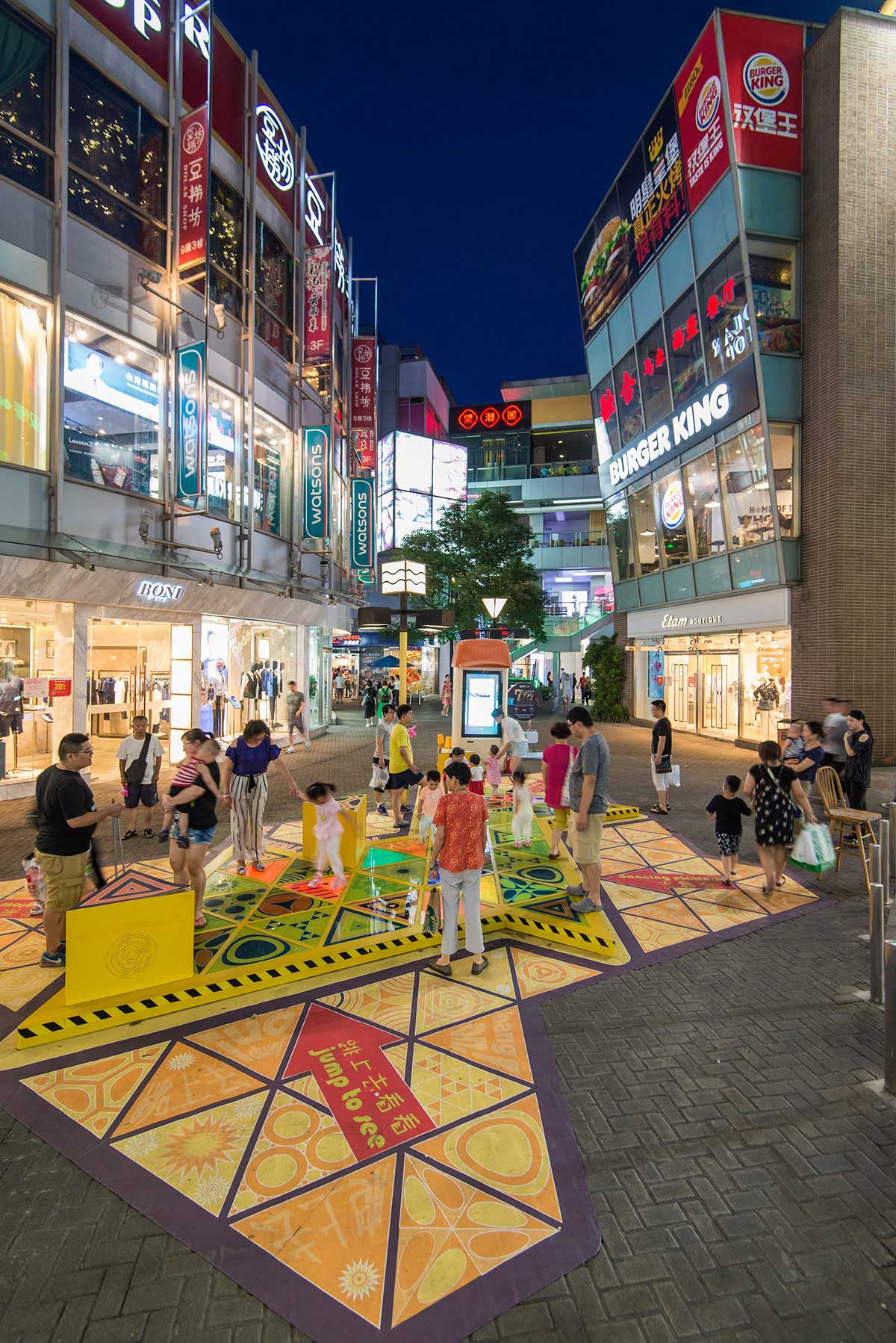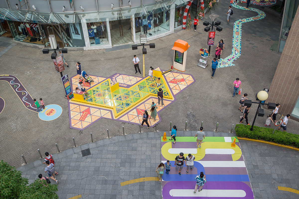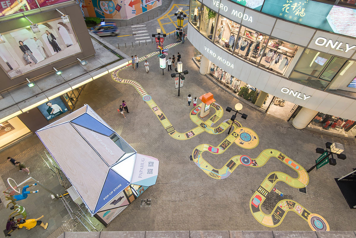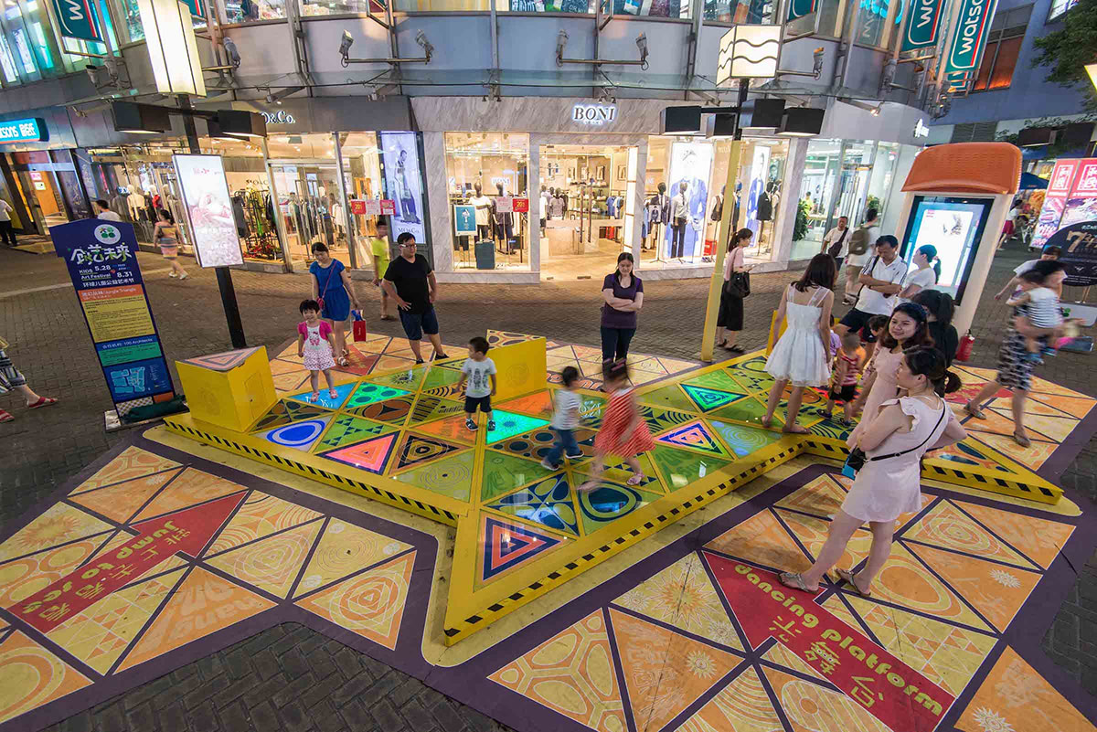 大宁国际商业广场是一个25万平方米的综合用途开发项目,拥有11万平方米的购物中心,由于其露天零售街的条件,是上海最热门的购物中心之一。从一开始,大宁国际就希望有一些意想不到的商场美陈或者展览展示会吸引孩子和成年人来使用,而不是仅仅只是路过的时候观察了一下,为此,Triangle Tango这种公共空间干预就诞生了。Triangle Tango旨在促进互动、吸引顾客并增强户外零售街道中私有公共空间的体验,这种干预本身会把流通区域变成一个“空间”,让顾客可以停驻下来,带着孩子和家人,花些时间与其他人互动。