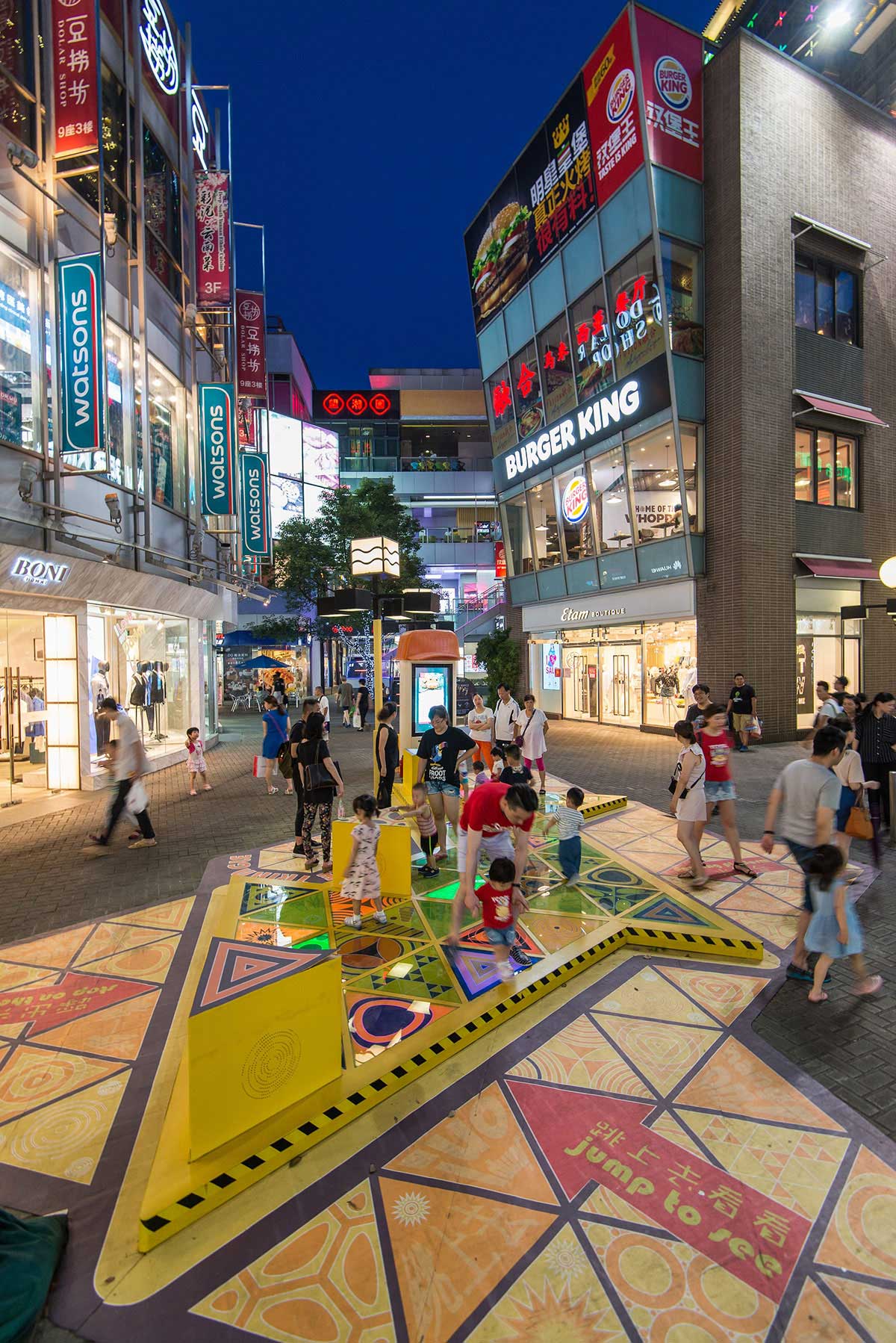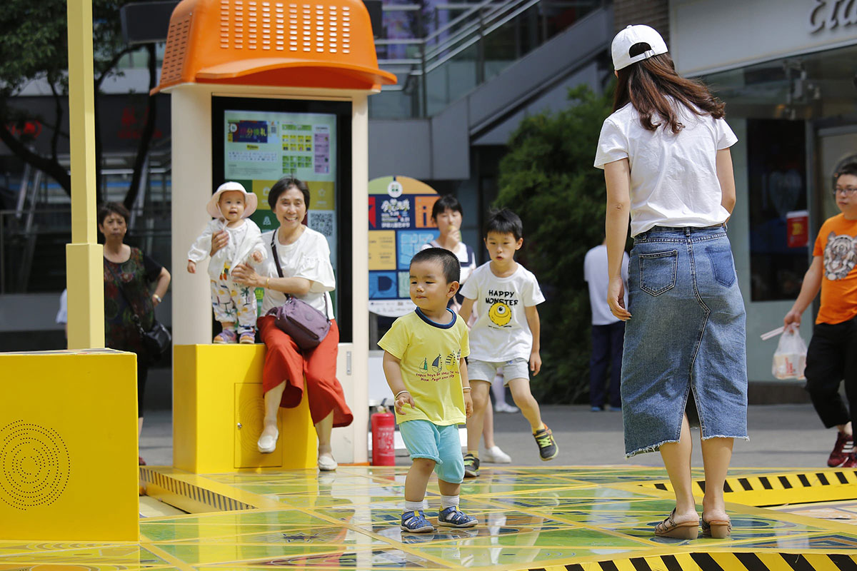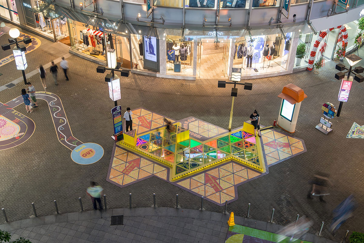 大宁国际商业广场是一个25万平方米的综合用途开发项目,拥有11万平方米的购物中心,由于其露天零售街的条件,是上海最热门的购物中心之一。从一开始,大宁国际就希望有一些意想不到的商场美陈或者展览展示会吸引孩子和成年人来使用,而不是仅仅只是路过的时候观察了一下,为此,Triangle Tango这种公共空间干预就诞生了。Triangle Tango旨在促进互动、吸引顾客并增强户外零售街道中私有公共空间的体验,这种干预本身会把流通区域变成一个“空间”,让顾客可以停驻下来,带着孩子和家人,花些时间与其他人互动。