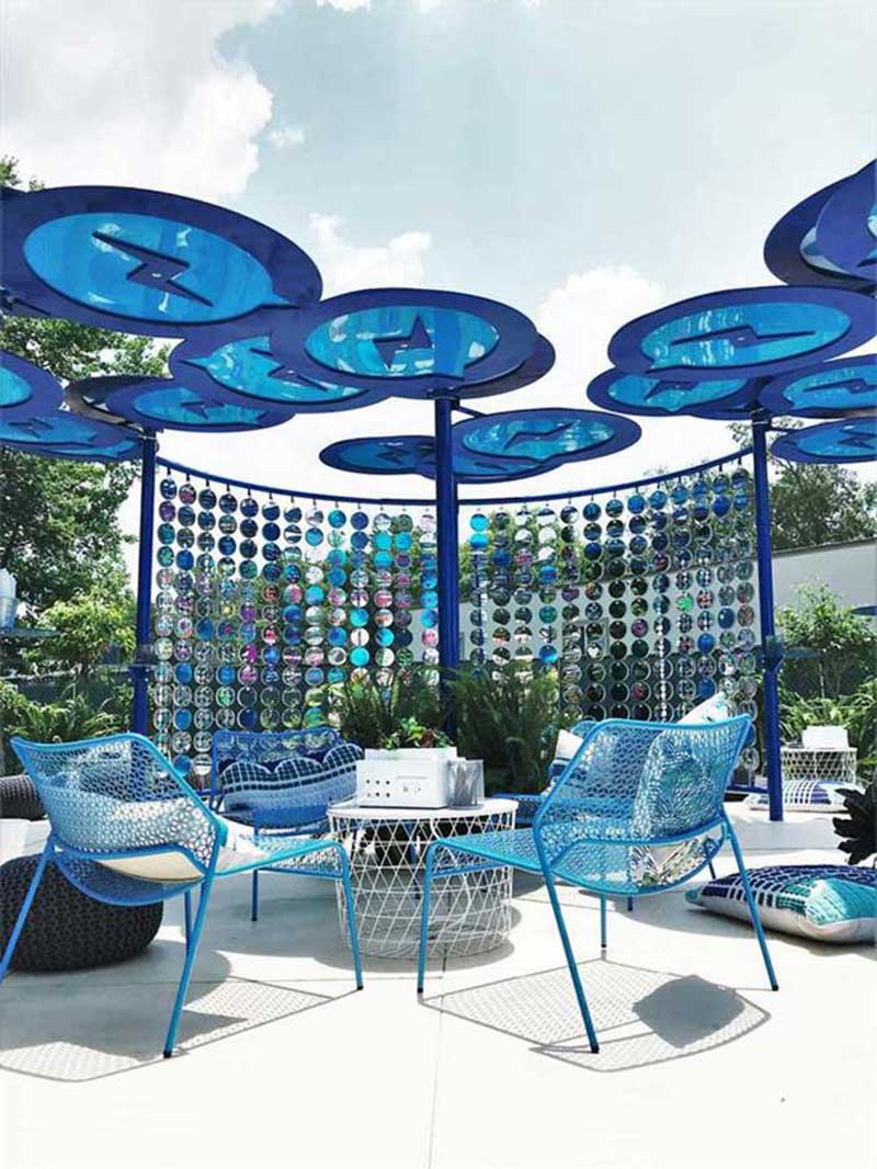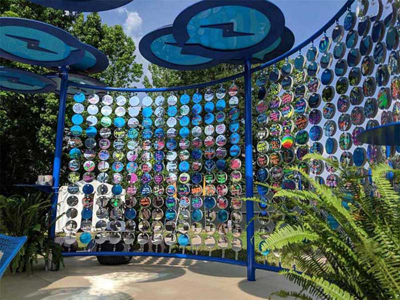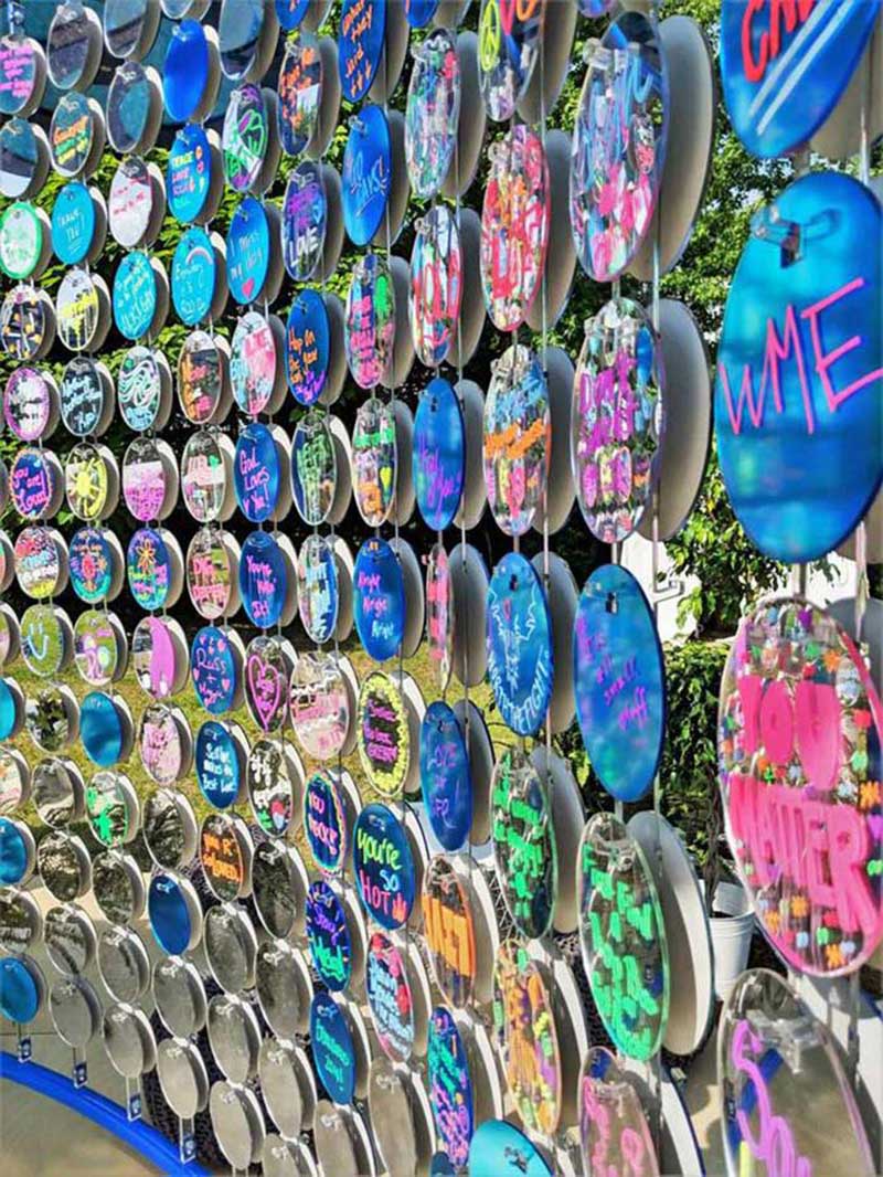 脸书(Facebook)在赞助参加一场音乐节活动中,设计制造并安装了一个完全沉浸式的互动环境,用于白天和晚上的活动,让来到活动现场的客人们能够分享他们的积极信息。该装置主要使用了镜面材料(比如镜面亚克力)作为客人书写留言的载体,此装置也吸引了众多参加音乐节的游客纷纷前往留言互动。