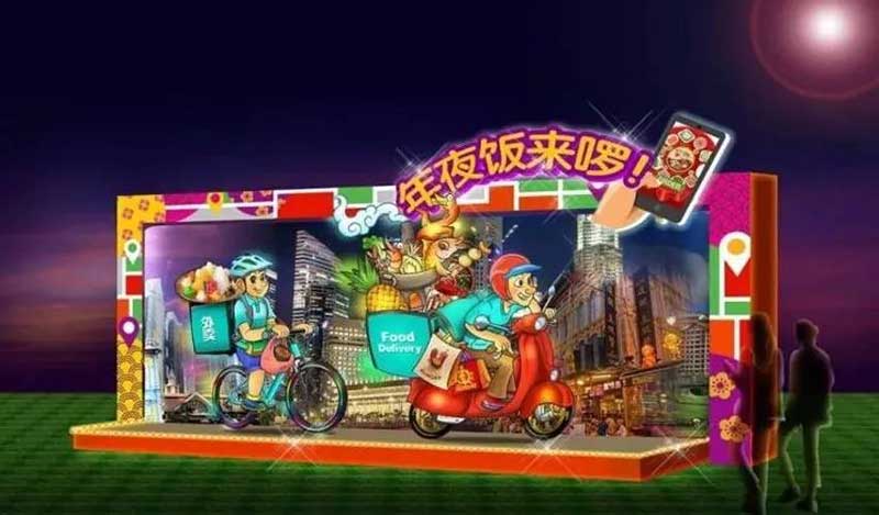 “年夜饭来啰!”灯组以日益普遍的送餐服务为平台,新加坡天际线为背景,呈现华人家庭重视一家人开开心心地团聚,共享年夜饭的传统习俗。常见的桌上佳肴包括围炉(团圆),鸡鸭(家乡年菜),大虾(嘻哈大笑),鲍鱼(包你年年有余),蒸鱼(年年有余)和鱼生(捞得风生水起)。庆祝农历新年时,大家别忘了传统的合家团圆和家庭价值观。