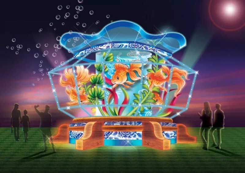 “过年了!合家欢乐”大型壁画灯组,呈现新加坡人庆祝农历新年的独特风貌。“家”这个汉字具有多层含义:家具有传承的内涵,将传统文化习俗世代相传。此外,新加坡人跟多元文化,多元种族的社区一同庆祝节庆,就像一个大家庭,同欢共乐的当儿,建立和谐交融的社会。“过年了!合家欢乐”灯组,精彩地呈现新加坡人办年货的热潮。牛车水的户外年货市场人山人海,大家纷纷采购应节食品,吉祥的装饰物和春联。新年期间,我们还会精心打扮,探望亲朋戚友,向其他种族的邻居问好。许多新加坡人喜欢看舞龙和舞狮,龙狮会串是新年的户外表演和妆艺游行必备的重头戏。各族人士也趁着新春佳节尽享游园之乐,虎豹别墅丰富的民间传说和神话雕塑是游园亮点之一。