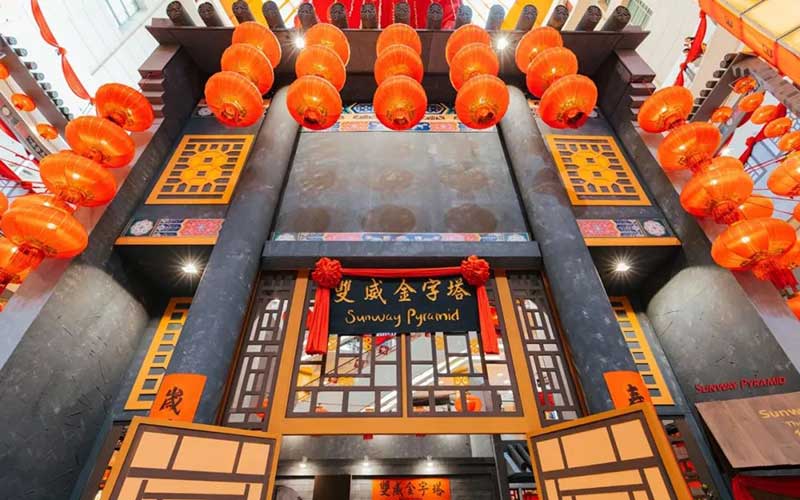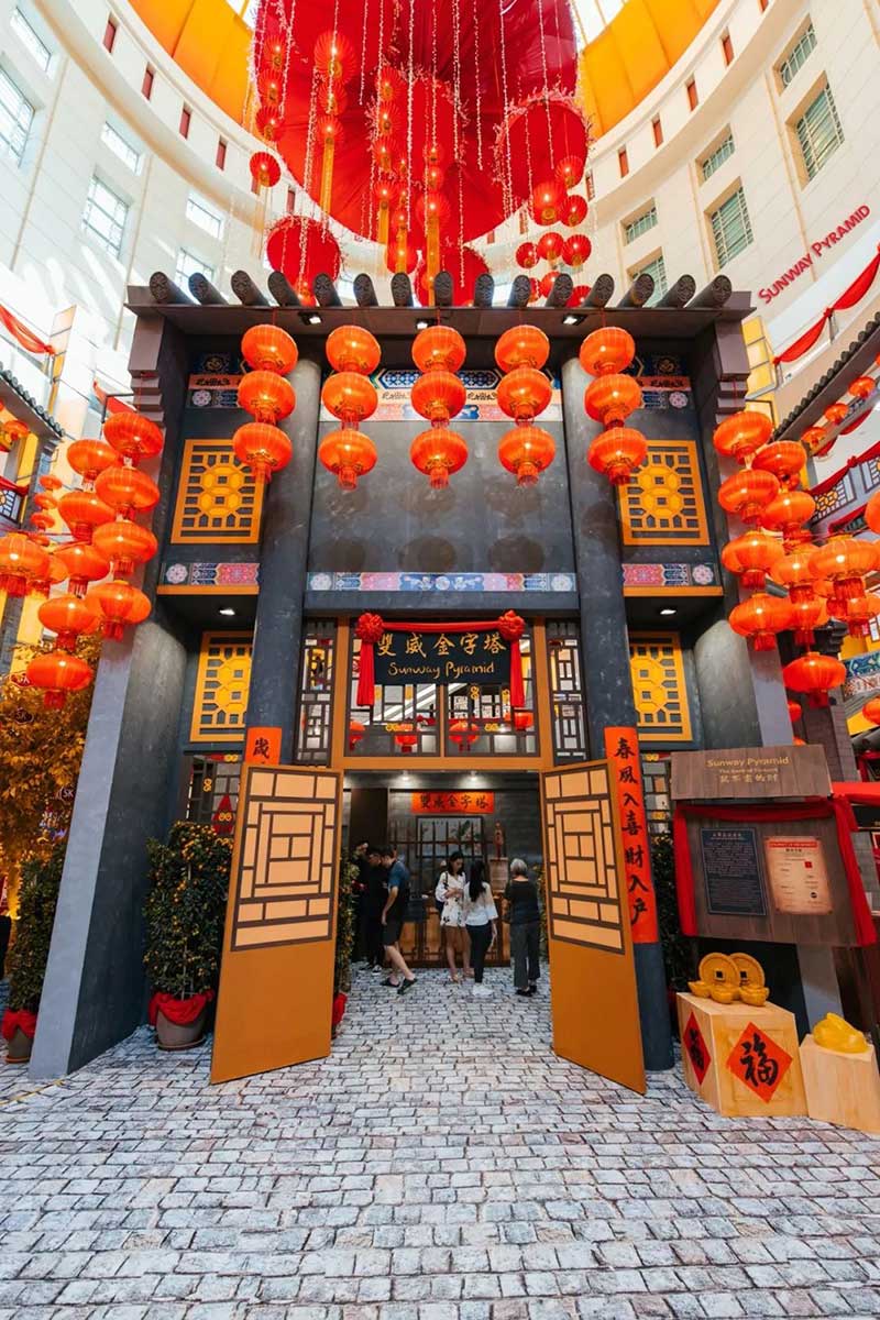 黄金色被誉为皇族之色以及常被一般人在过年时用来送礼以示祝福发财和好运之意。今年Sunway Pyramid新春主题之色,肯定少不了闪闪发亮的金黄色。LG2 Orange Concourse正中央摆了古老中国式票号,四周则围绕着传统金融街道以及挡位以创造出佳节氛围。