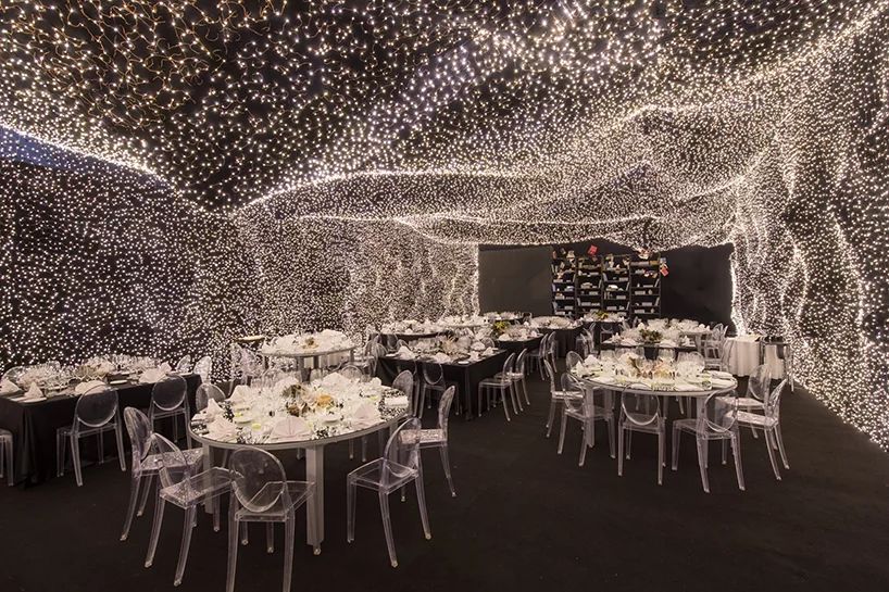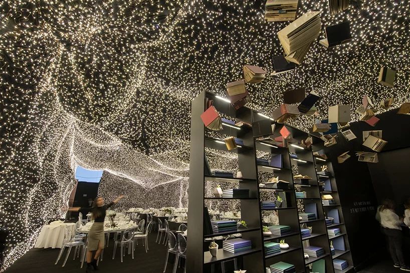 这家位于墨西哥城Citibanamex中心的星际餐厅,超过250,000个LED装饰了起伏的墙壁和天花板,与黑色的内部形成对比,大量的灯光使食客们沉浸在星空中,入口处的书柜也经过精心设计,悬挂在天花板上的书籍,就像真实置身于外太空一样。