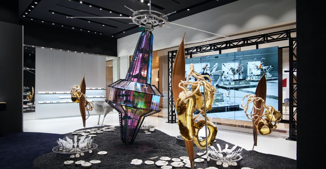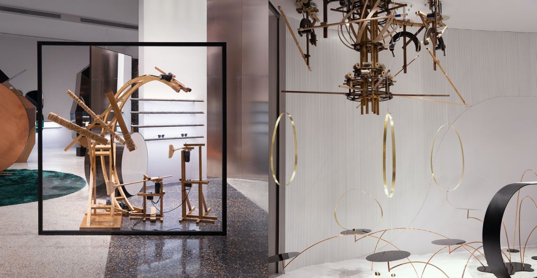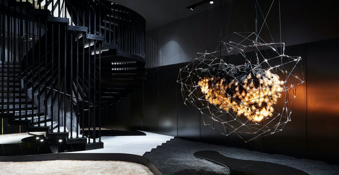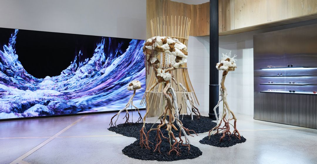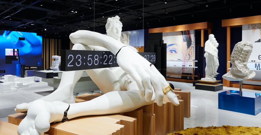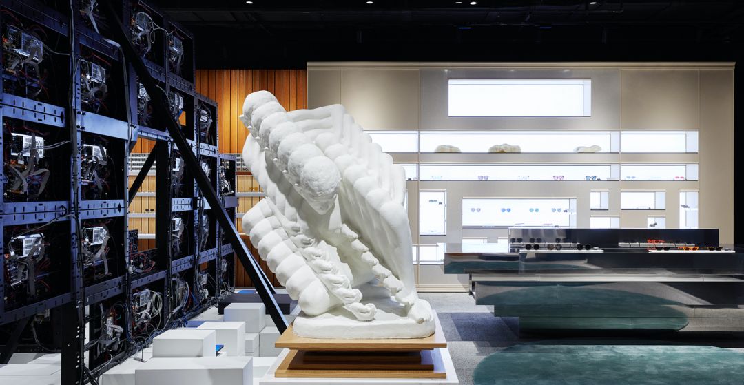这间旗舰店的主题是「未来人类」。空间表达了未来人类在火星和地球间的虫洞穿梭时的一段想象。进入这个奇妙空间的访客们,能够看到虫洞能量所留下的痕迹。内部的各种动态装置,形象地演绎了因受虫洞能量影响而发生扭曲的人体和物品的形态。