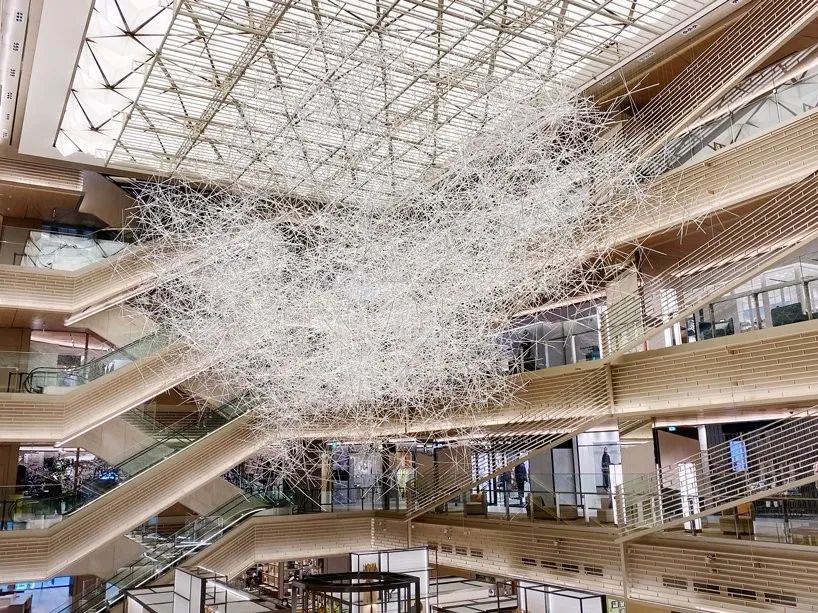 吉冈德仁为GINZASIX创作的《棱镜之云》,运用了约1万根透明棱柱,经由交错堆叠出如云朵般的形体,同时也形成无数透明的光线穿透光表层,仿佛一闪一烁的云朵,唤起观者对云的形态遐思。由于作品不规则形体的特性,因此从不同角度看上去都像是明暗变化无穷的云朵。每次观看皆能得到不一样的感官体验,正如同大自然无穷魅力般,总带给人出其不意的美妙惊喜。