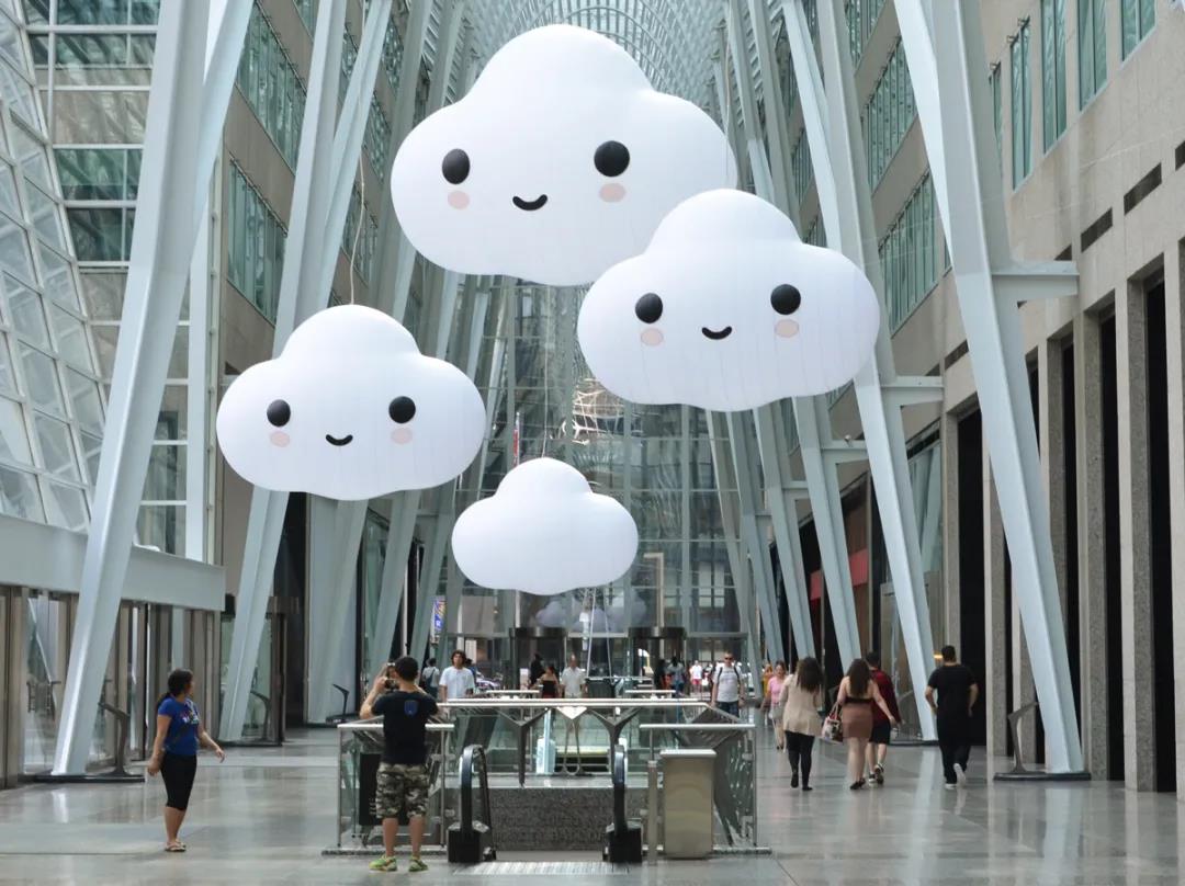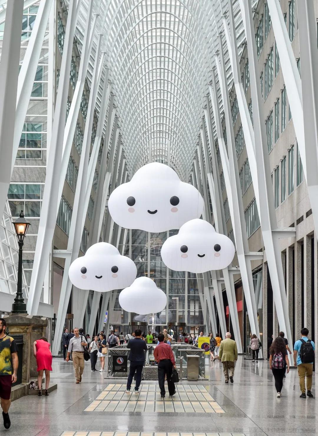 该装置由珀尔·瓦格纳(Pearl Wagner)制作,其解释是“小云和三个朋友在布鲁克菲尔德广场(Brookfield Place)度过慵懒的夏日时光。”艺术家希望通过这几朵洁白柔软的云让前来的人们心情得到放松和纾解,享受每一天的美好生活。