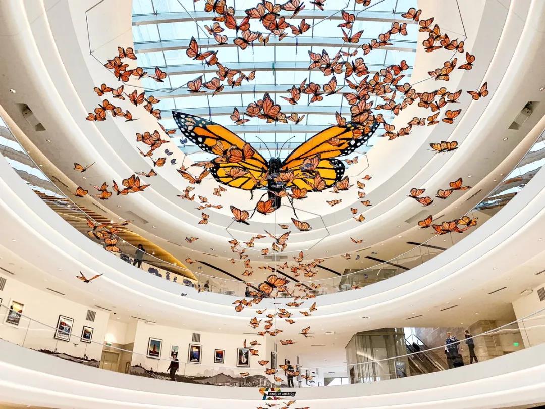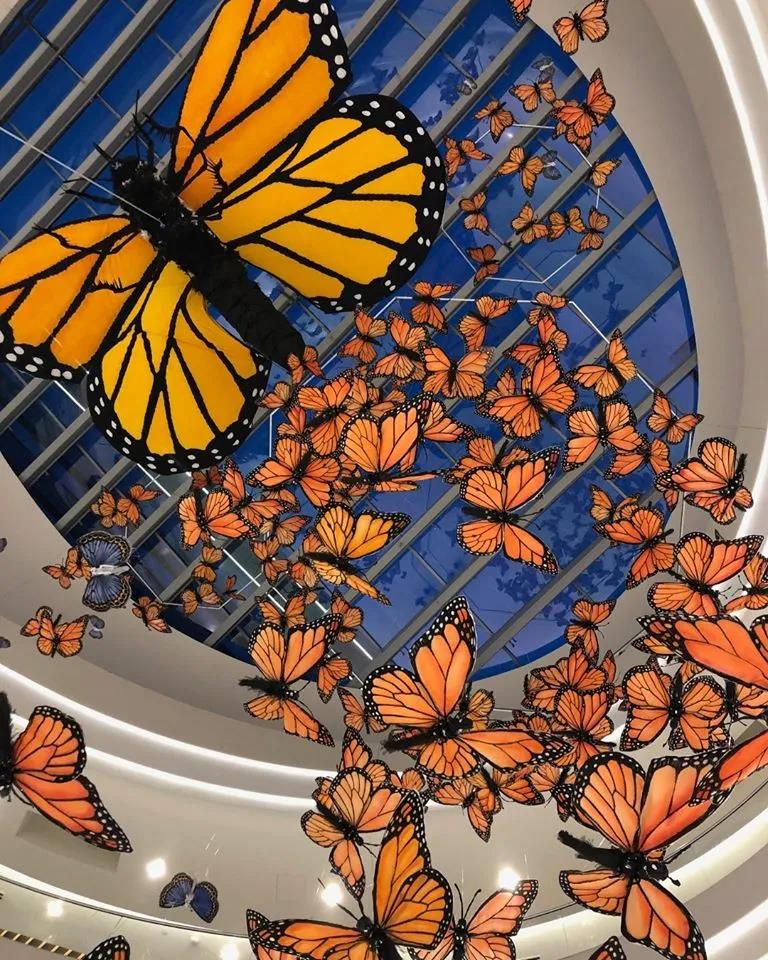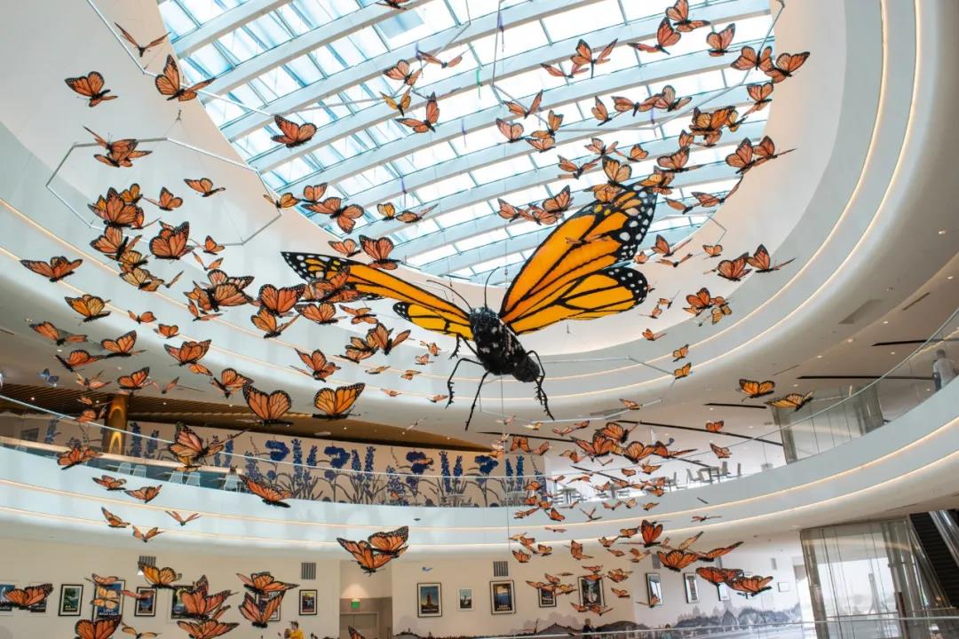 “蝴蝶不只是我们应该钟爱的漂亮昆虫,它还是生命之源的一部分,对我们的生存至关重要。”Lutter-Gardella邀请其他艺术家来帮助建造更小的蝴蝶,这些蝴蝶悬挂在中庭的天窗上,围绕着大型的帝王蝶。装置主要由塑料袋、吸管、塑料汤匙、衣架等废物流材料制成,并被设计成可重复使用。