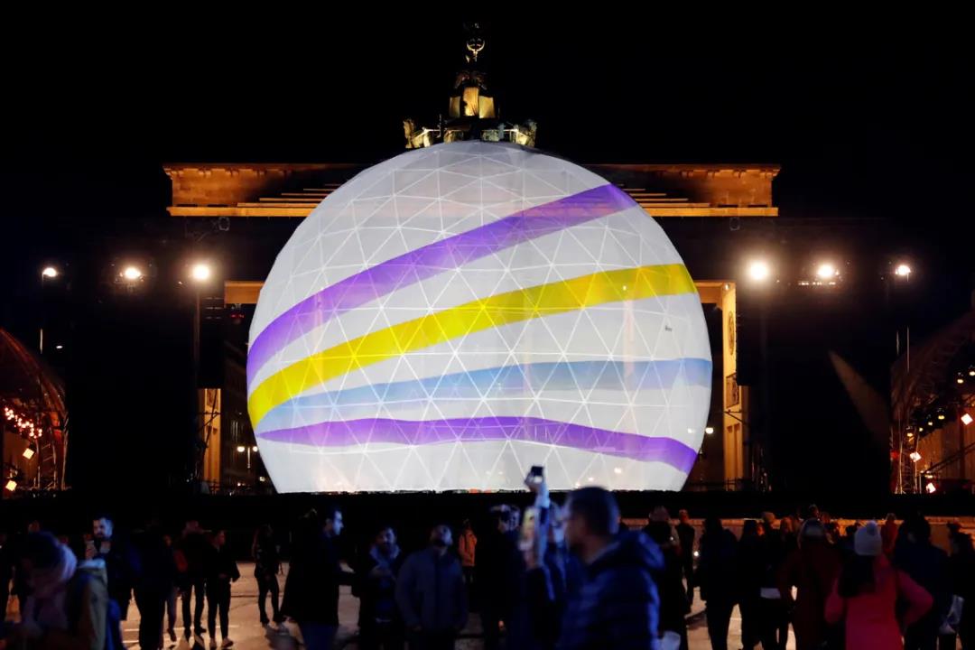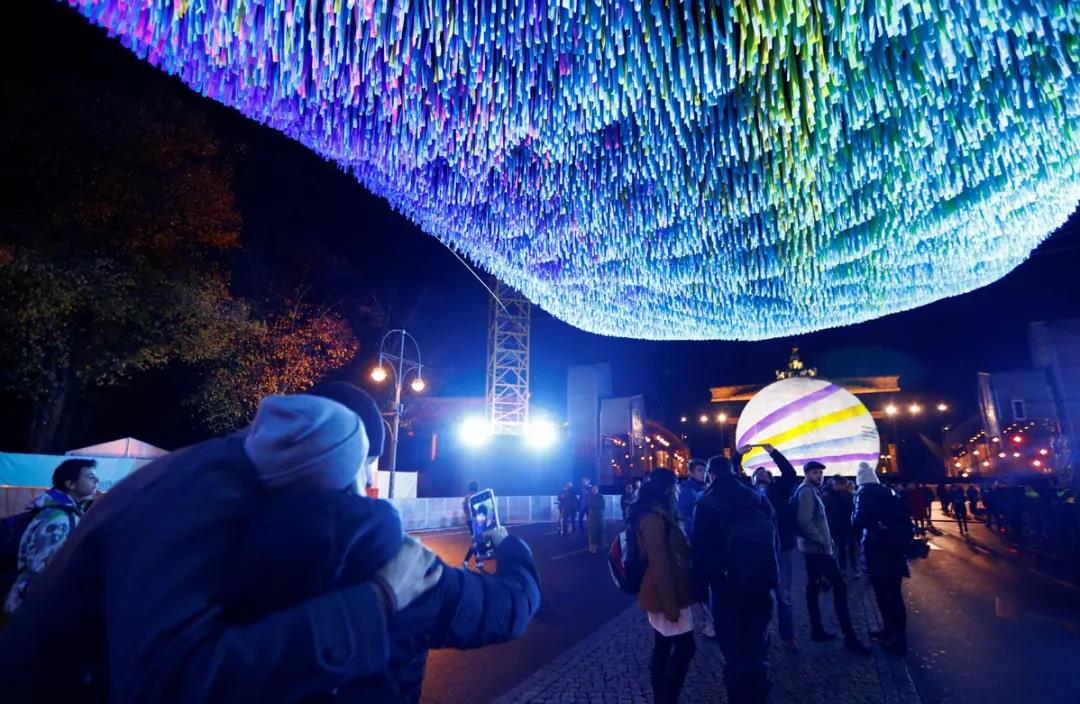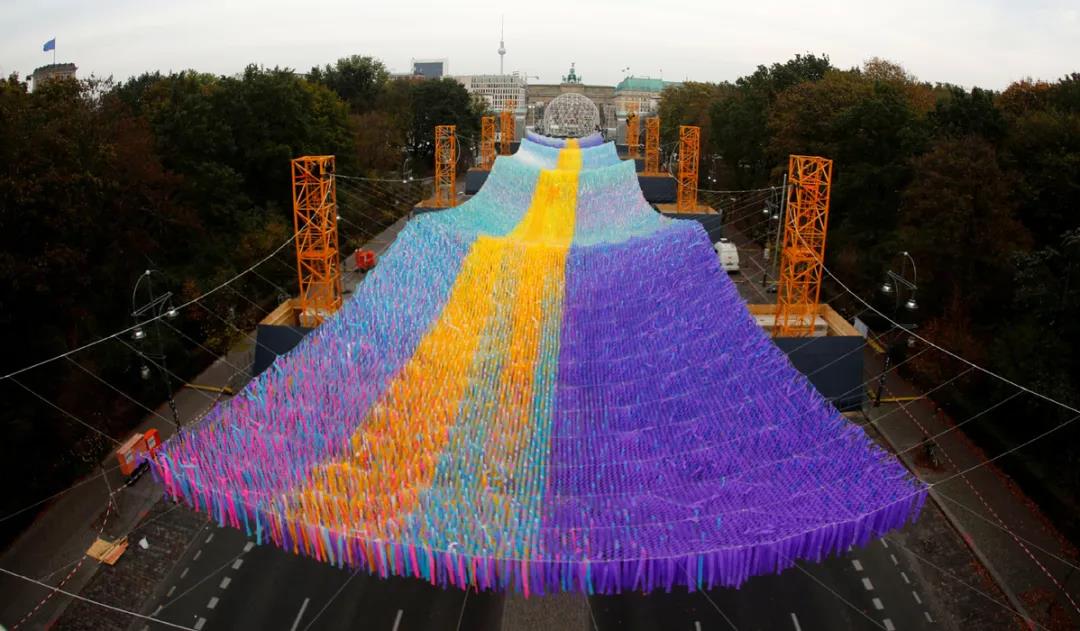 为了纪念柏林墙倒塌30周年,美国艺术家帕特里克·舍罗创作了一件装置作品,名为“动态的幻象”。它有150米长,由10万个横幅组成,德国居民在上面写了3万条信息,其中许多是关于爱与和平的。这些艺术品将像五彩缤纷的波浪一样漂浮在勃兰登堡门前。