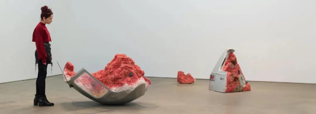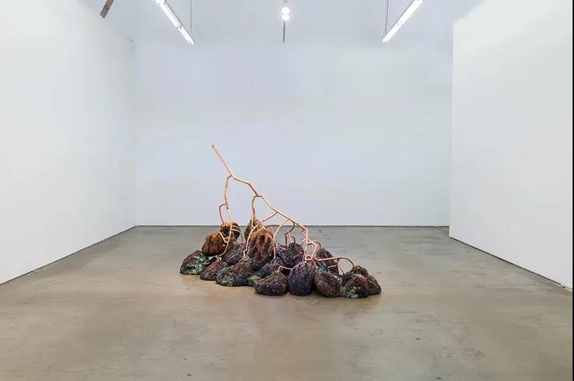 在弗朗索瓦·盖巴利画廊(FRANCOIS GHEBALY GALLERY)的展览中,这位艺术家将这些二元对立转化为最近一系列巨大的腐烂水果。这些“坏水果”从上到下布满了用别针别住的玻璃珠子和半宝石,它们抓住了蔓生的霉菌、腐烂的果皮和正在腐烂的水果的倒塌结构。
