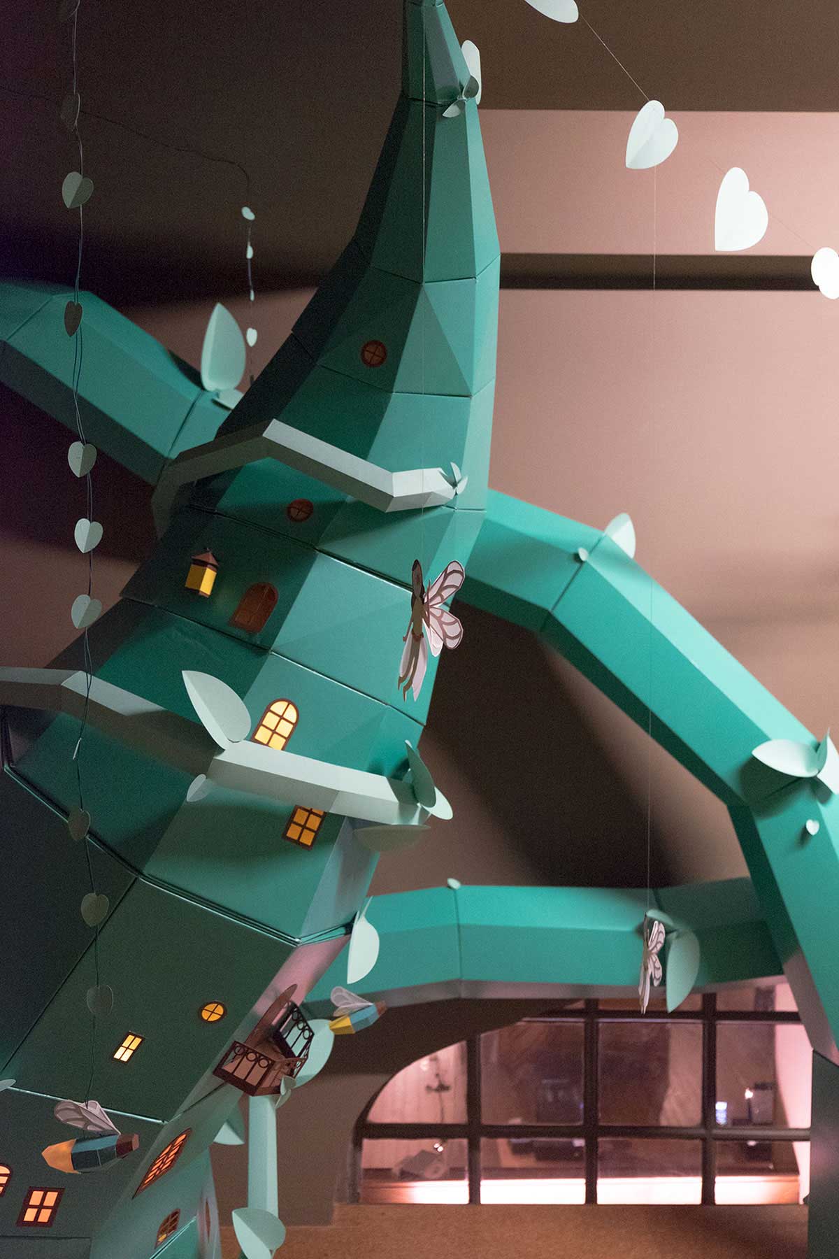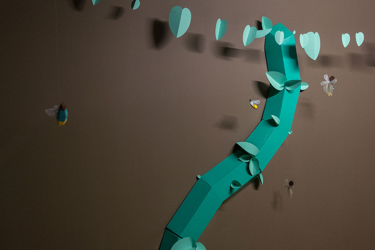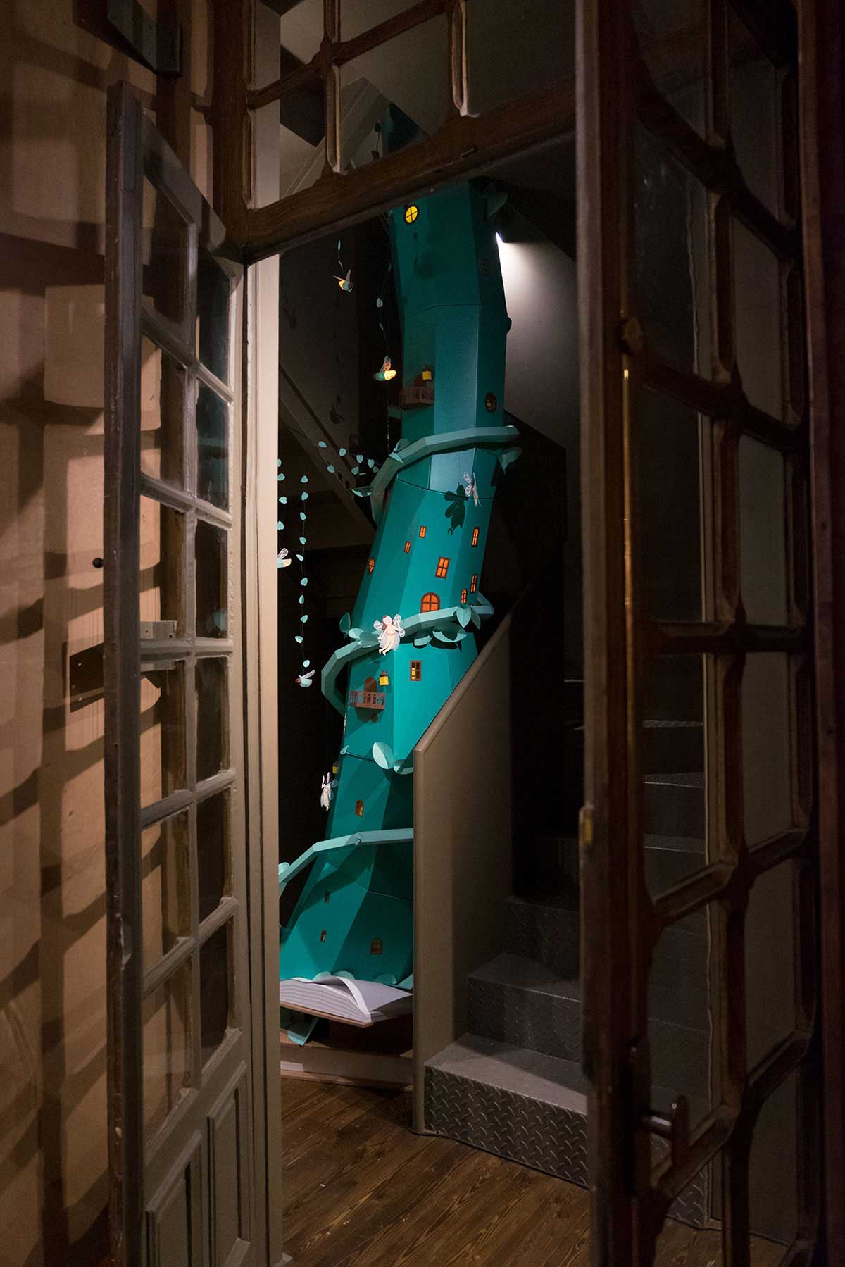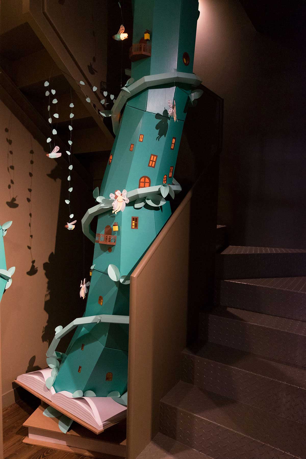 受到不同古典书籍故事的启发,我们创造了一个巨大的豆茎,可以穿透书籍和墙壁。 在茎的周围,你还可以找到数十个仙女、萤火虫和各种神奇的生物。 这个巨大的豆茎旨在鼓励孩子们发现这个小世界,透过窗户看,看仙女们的房子,并与不同角色一起玩。