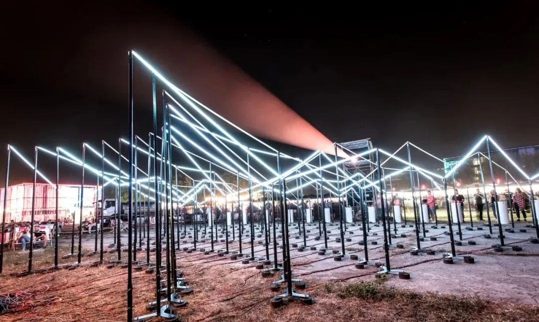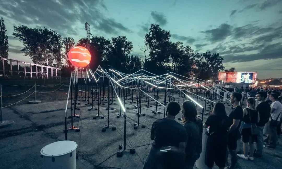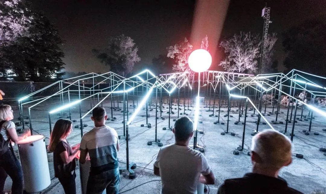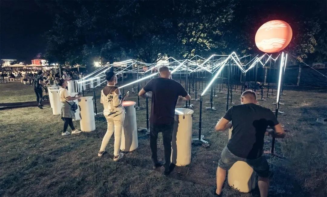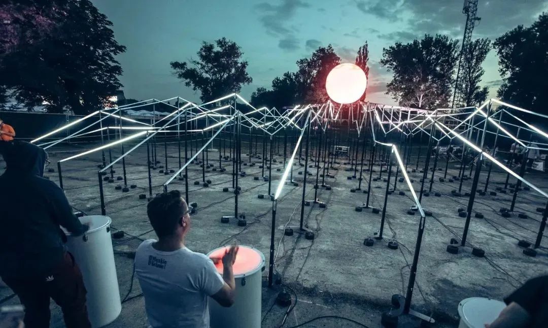 “光波鼓”占地面积约300平方米:包含15个安装LED控制器的PVC鼓,以及中心处一个直径约3米的氦气球,鼓和球之间由200米的传感LED灯带连接。为了增强灯带的视觉效果,灯带被架设出山峦般高低起伏的效果。