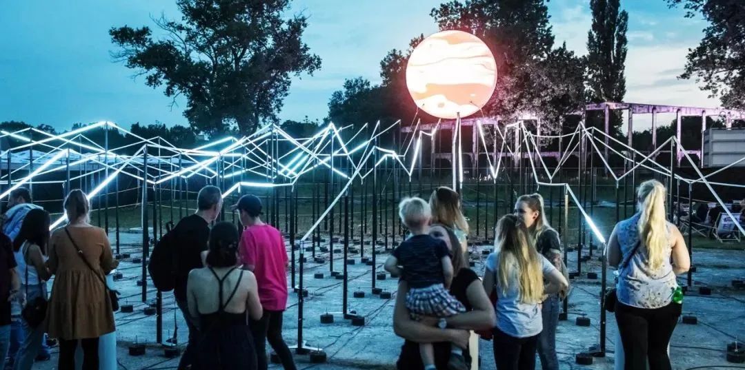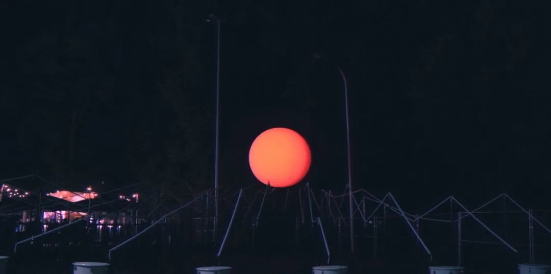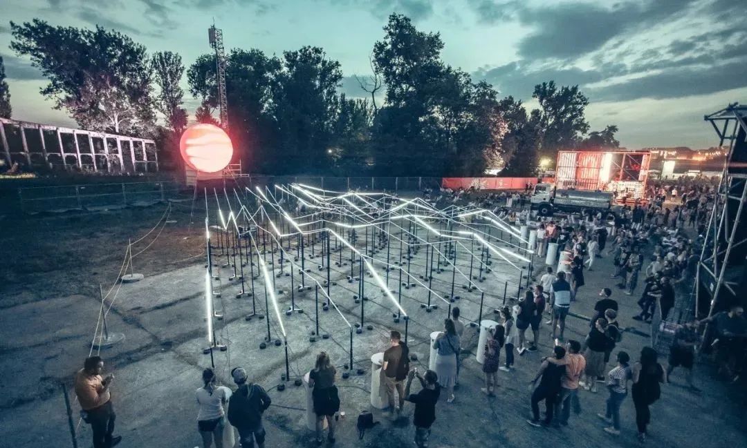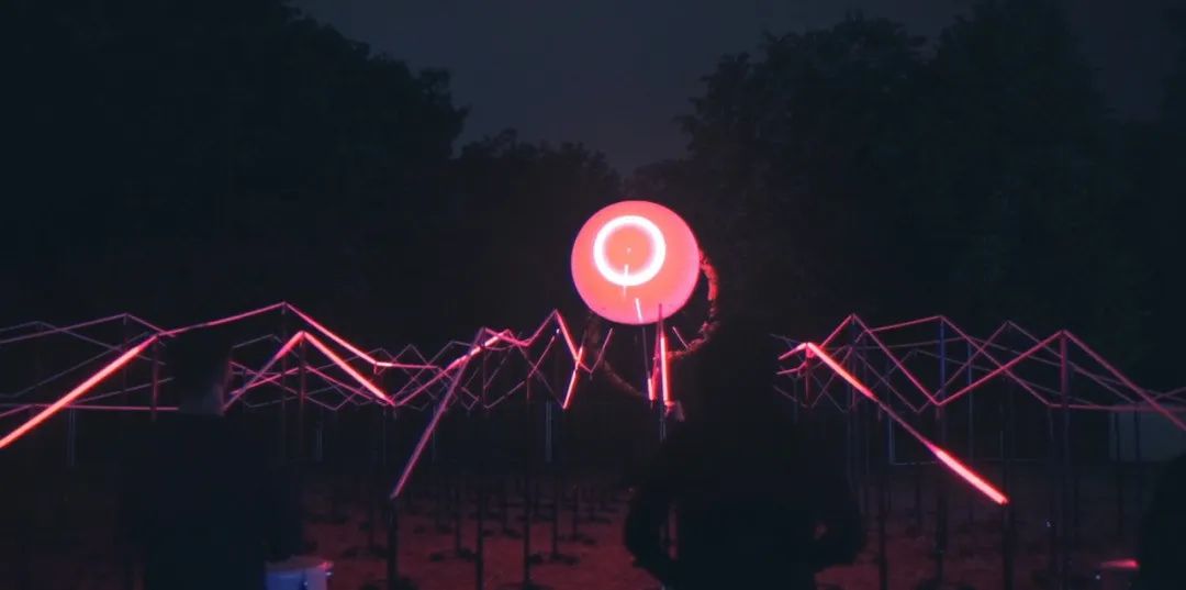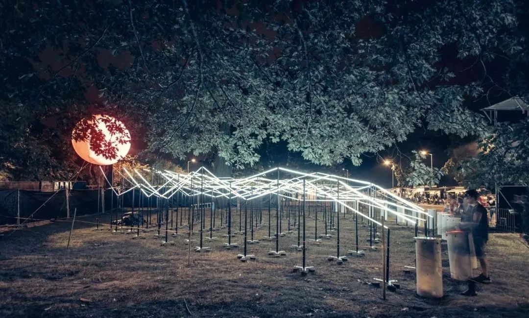 “光波鼓”占地面积约300平方米:包含15个安装LED控制器的PVC鼓,以及中心处一个直径约3米的氦气球,鼓和球之间由200米的传感LED灯带连接。为了增强灯带的视觉效果,灯带被架设出山峦般高低起伏的效果。