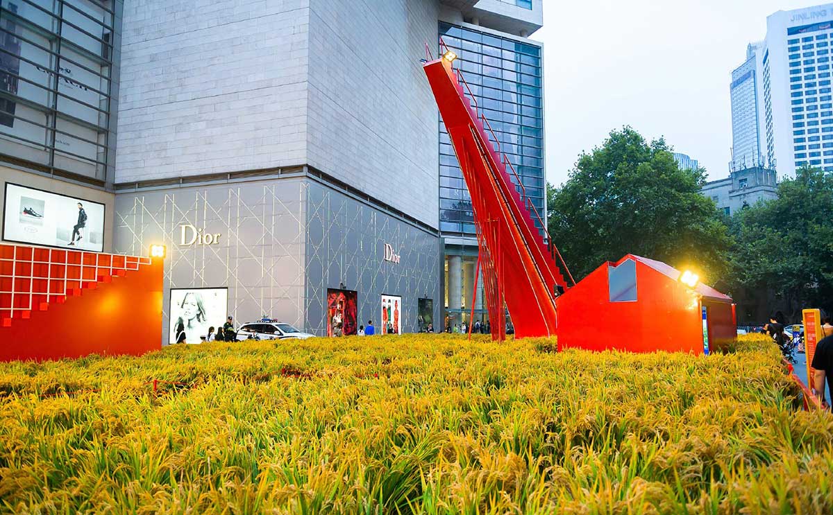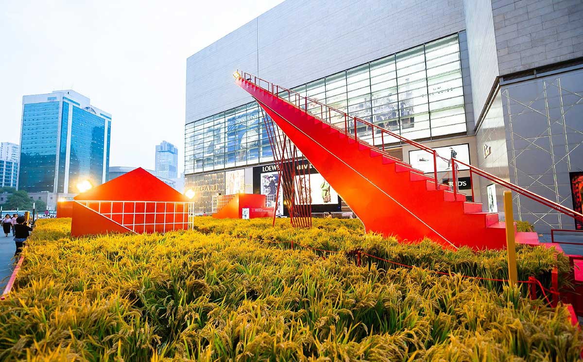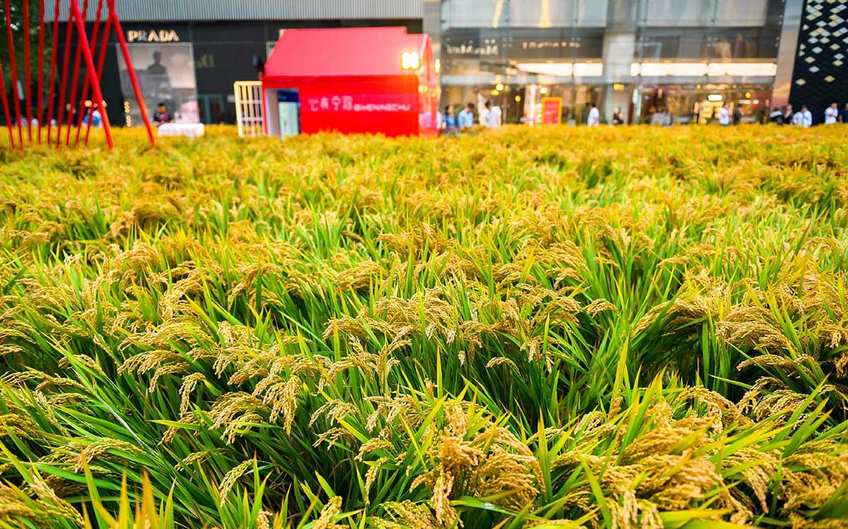 一片金灿灿的稻田,一阵风吹过,掀起层层叠叠的金色稻浪……国庆期间,新街口德基户外广场上“长”出的一大片金色稻田与红色天梯相映成趣,吸引了一拨又一拨的市民和游客前来打卡拍照。