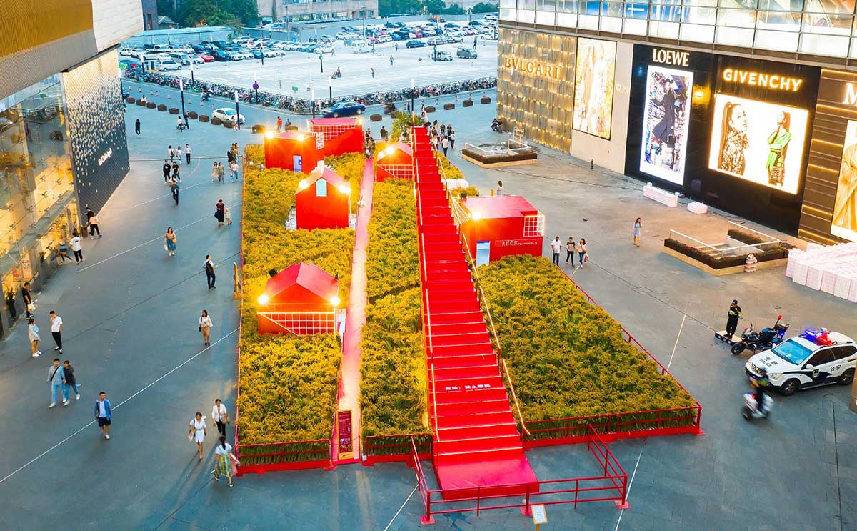 这是德基广场携手现代快报推出的《风吹稻浪 红望金收 献礼70年新中国》主题展。现场,800平方米的金色稻田,壮观又美丽。稻田的尽头还伫立着一棵石榴树,红彤彤的石榴垂满枝头,点缀了整个稻田。稻田前方还有一座9米高的红色天梯,顺着台阶上去,稻田风景尽收眼底。几条小道直通稻田中央,还有6间红色小房子错落有致地散布在稻田四周。