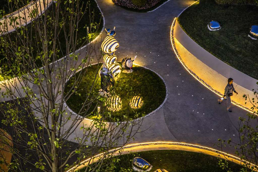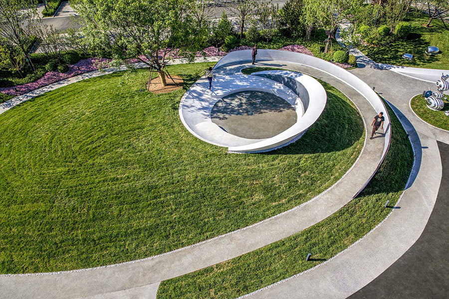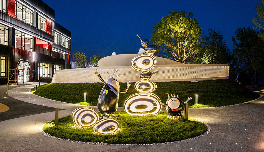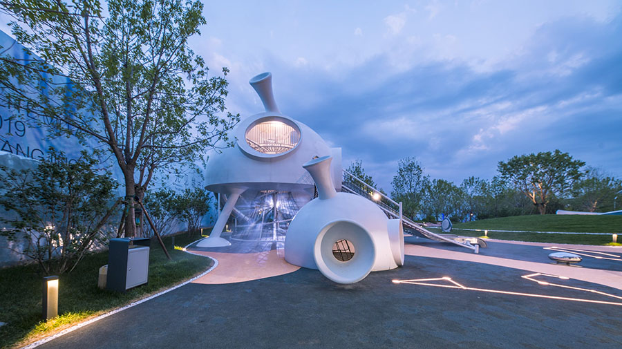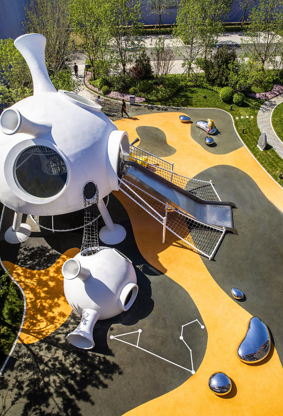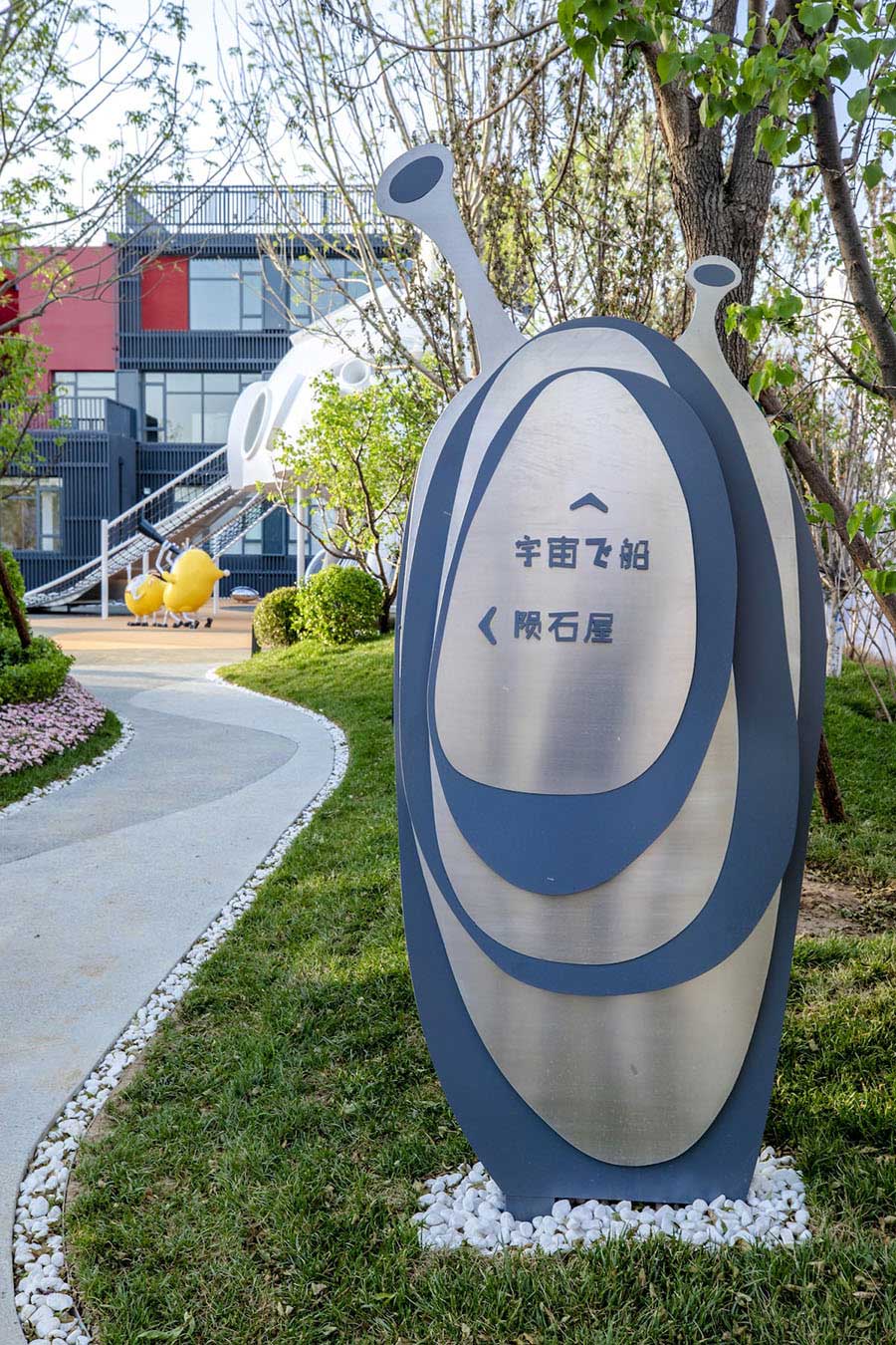 项目地块前期是以销售为主的售楼中心,后期会改造成为教育配套的社区幼儿园,实现空间不同时期功能的转变,销售氛围与幼儿教育之间的平衡是本案思考的重点,北京洛嘉团队为项目地独家打造了外星人“好海幼”的故事,将IP故事融入场地,将建筑、景观、室内设计都融入的故事场景中,运用场景化的设计手法,完整再现了“好海幼”来到地球的故事,以主题乐园化的方式打造完整的儿童主题 。