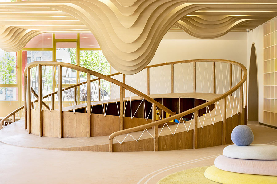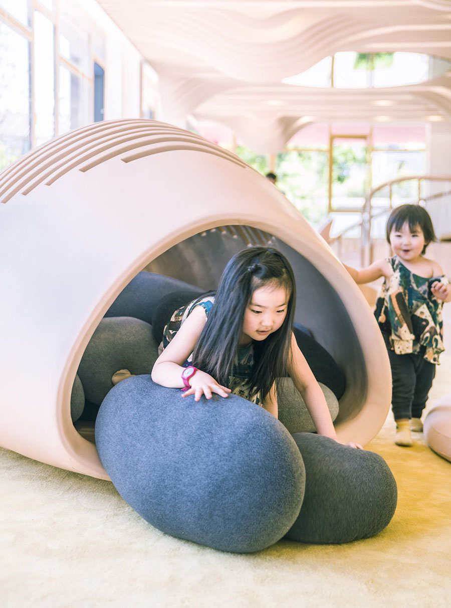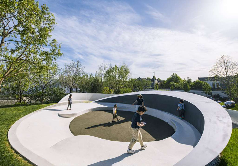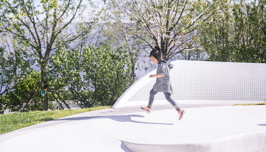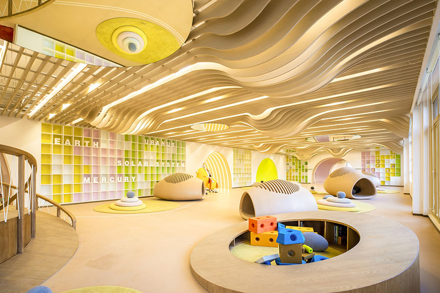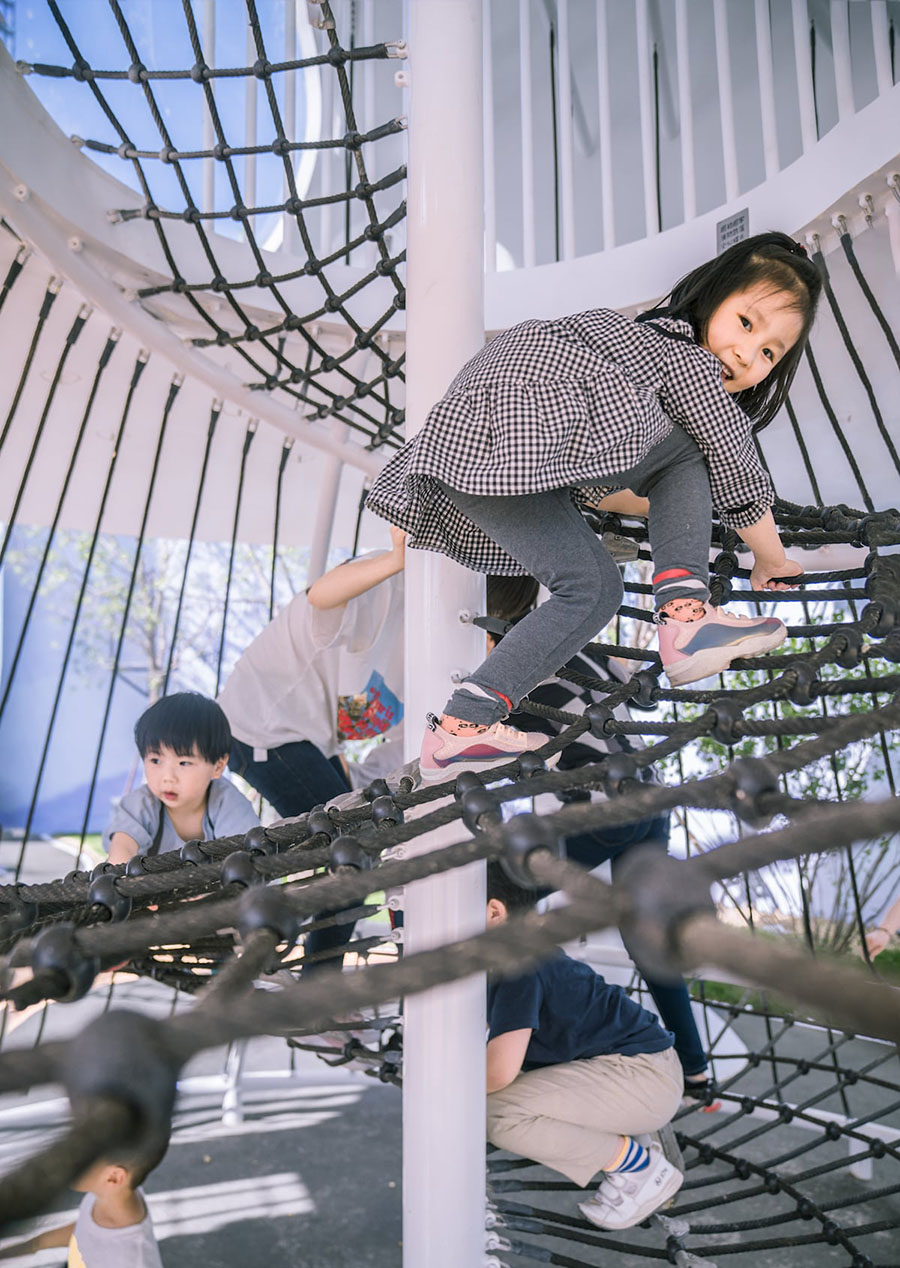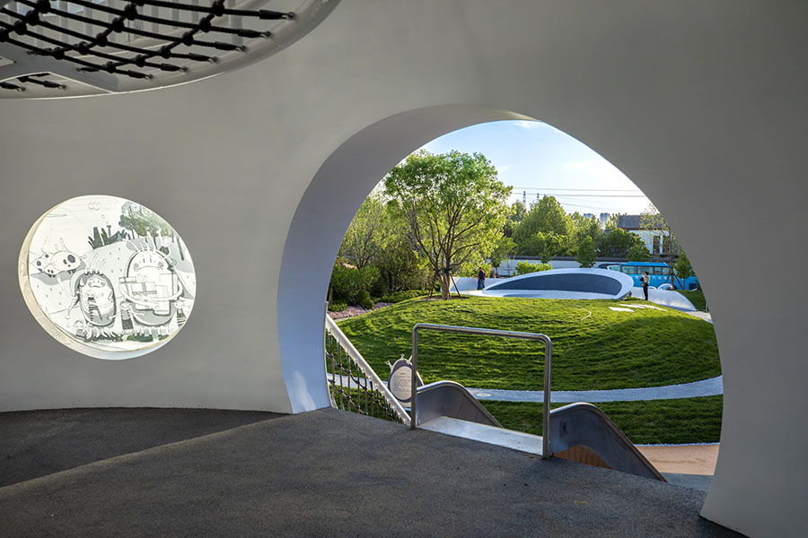 我们希望场地是足够自由的,就像浩瀚的宇宙一样,同时又需要一定的“体积感”满足儿童游玩的需要。园区中心设计了一个高点形成一个相对环抱的课堂空间。在这里,你可以大草坡上撒个欢,踏过繁星点点的银河路,听老师讲解自然的奥秘。