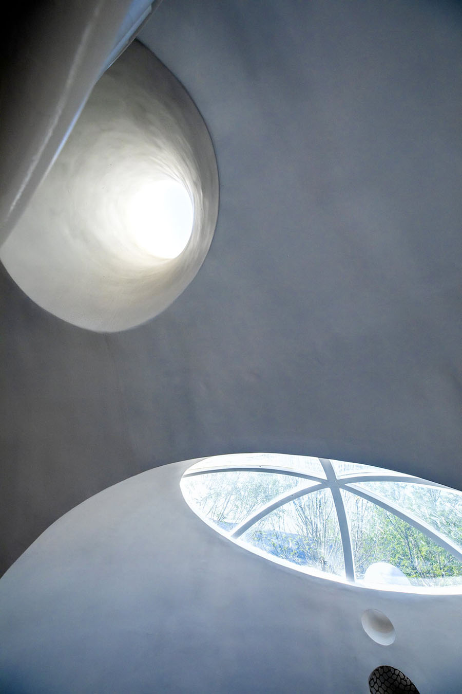 这是陨石屋建筑的中庭部分,由于空间相对狭窄,与甲方沟通的过程中,甲方设计总监尤蕊认为需要更多竖向的语言来拉伸纵向空间的关系——一个穿梭在天空树之间的大滑梯,能够满足了空间的需要。