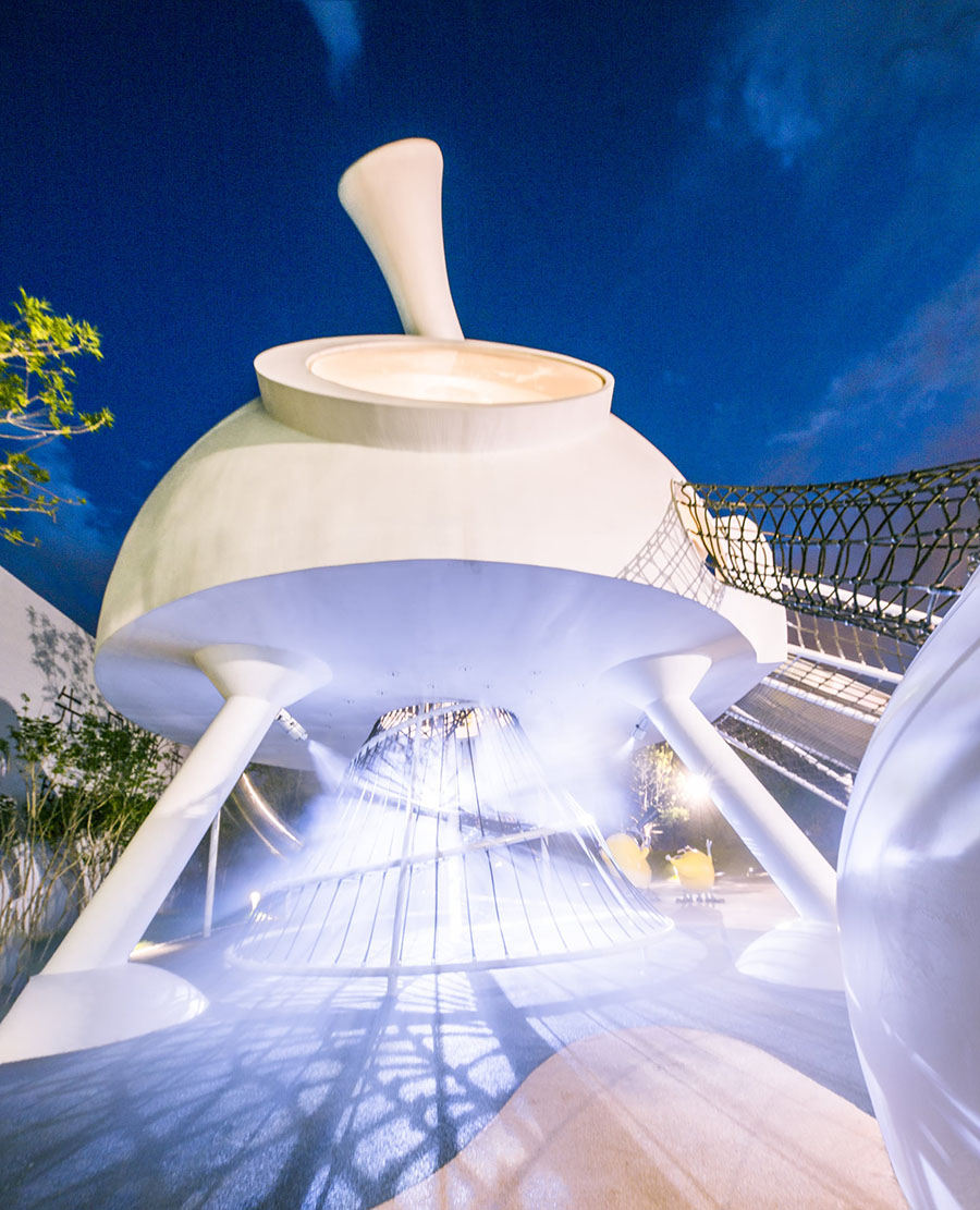 飞船内部划分两层空间,可以由下面的螺旋爬网直接到达2层空间,由滑筒由上滑下,在保障其安全性的同时创造或者鼓励孩子们去探索和冒险。我们将活动设施结合声光电的科技互动:科技互动喷雾,在星光路上设置互动点,踩踏互动点触发喷雾和水纹灯效果,犹如飞船将要腾空一般,同时也是最佳拍照点。
