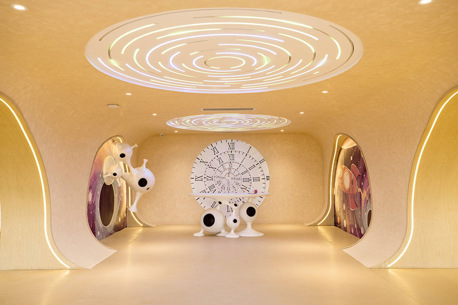 陨石屋结合建筑和室内规划布局划分5个空间:接待区、沙盘区、洽谈区、儿童活动区、中庭,每个空间都有独特的功能和故事,是外星人回忆时空之旅的场景化体现。