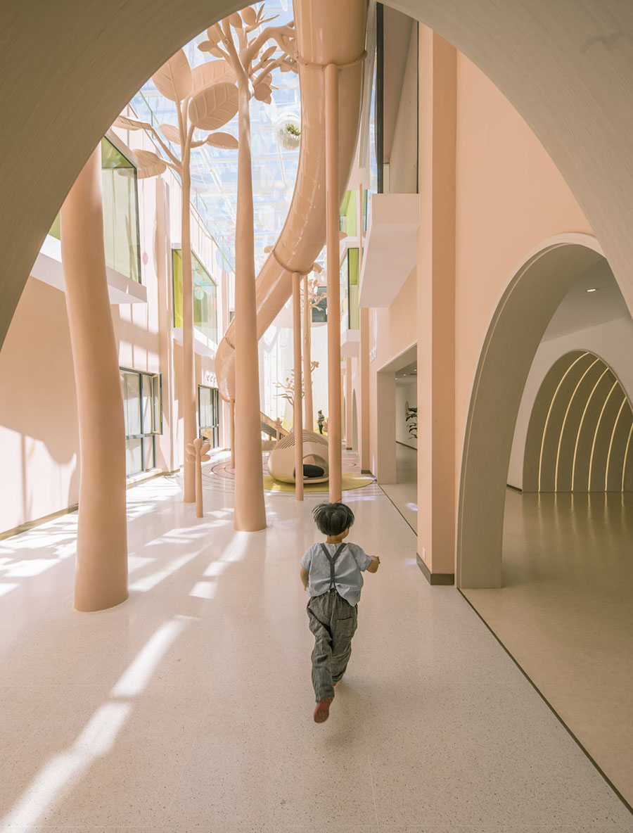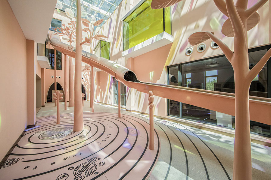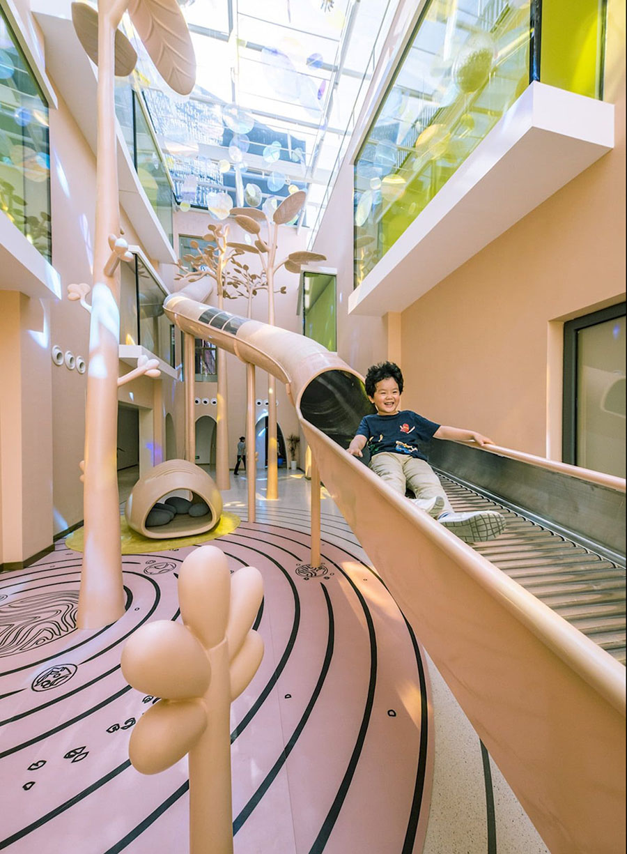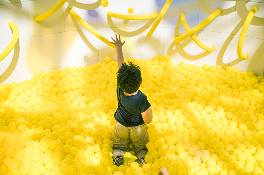 大量的粉色在墙面、滑梯、天空树的艺术装置上,扩充了室内的体积感。同时球池里堆积的黄色,吊顶吊装炫彩的装饰片随着阳光摇曳,用色彩来表达空间,将陨石村的故事延伸到现实加深人们对空间的记忆。大滑梯从三层直下,横跨整个中庭,圆筒滑梯后接滚轮滑梯,滑入海洋球池,增加丰富的体验感。