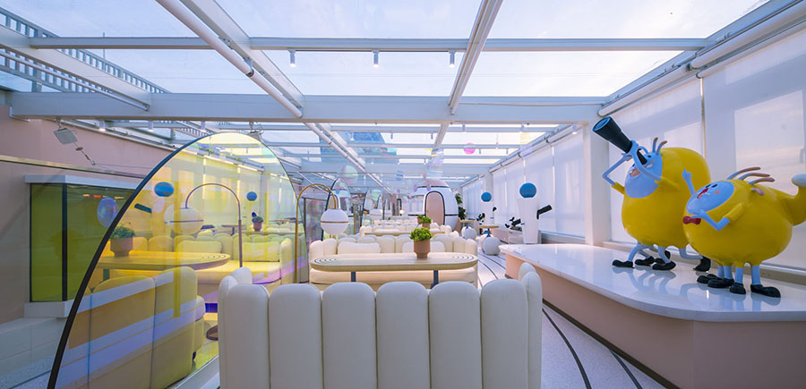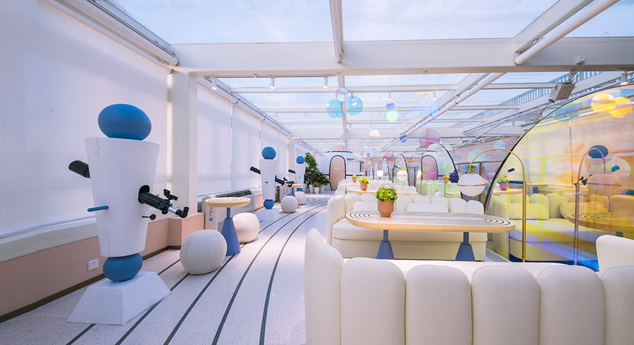 三层洽谈区平台是陨石村村民探索太空的基地。这里有如梦如幻的玻璃吊顶,可以用设计师们准备好的太空望远镜,在天气舒朗的夜晚,一起寻找行星的轨迹。