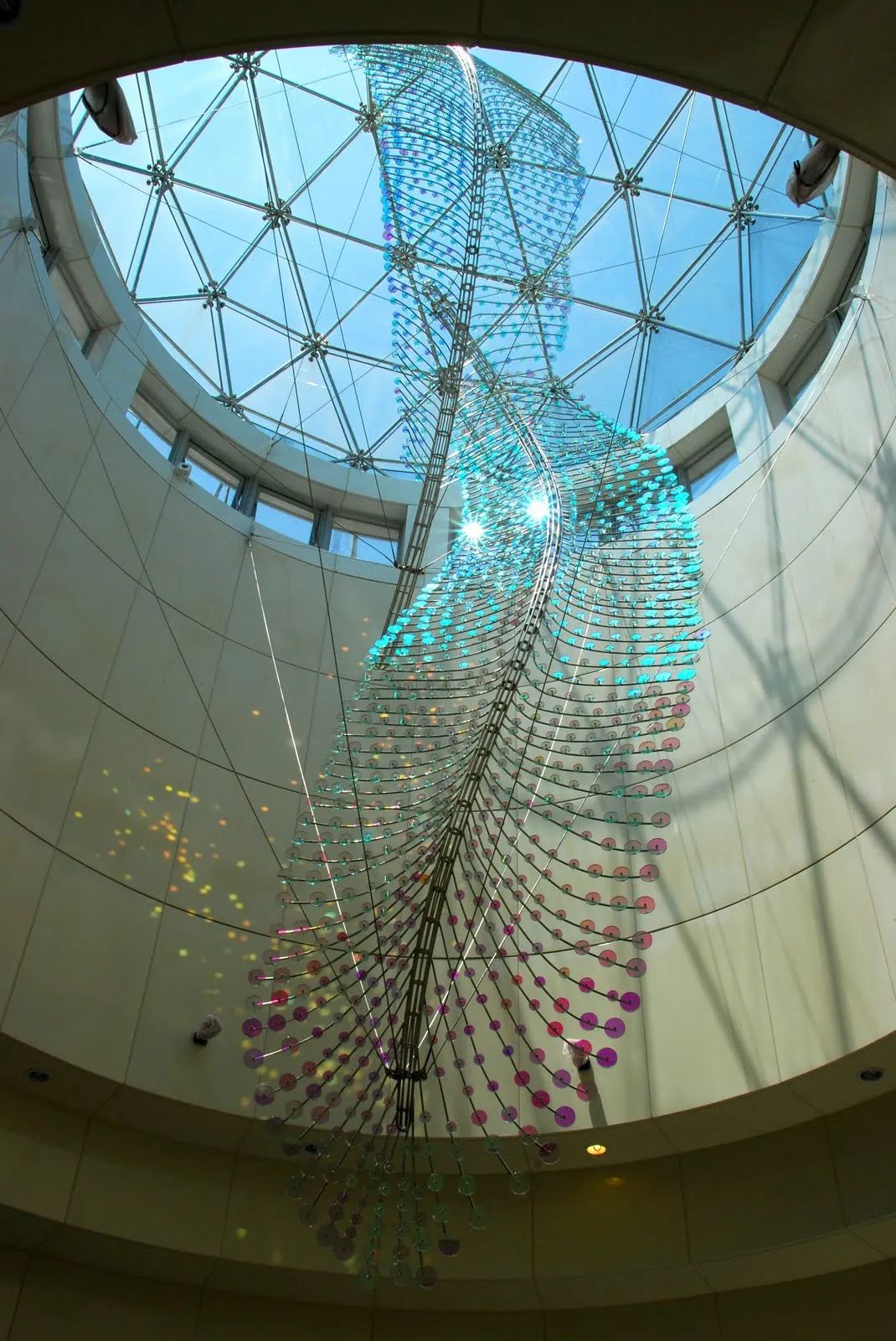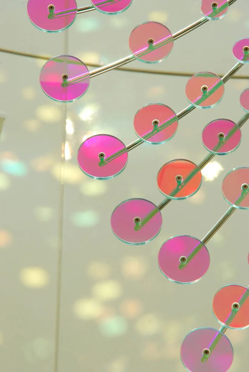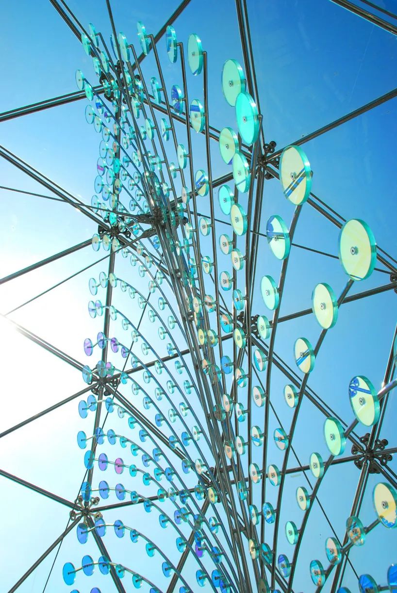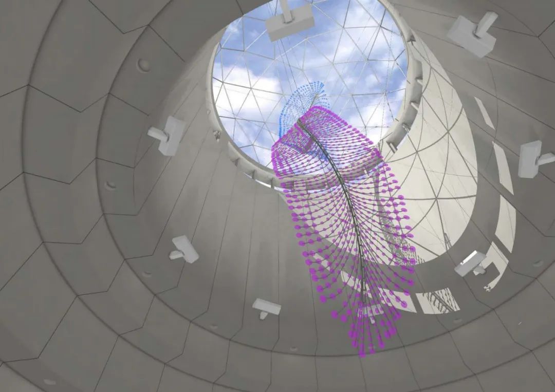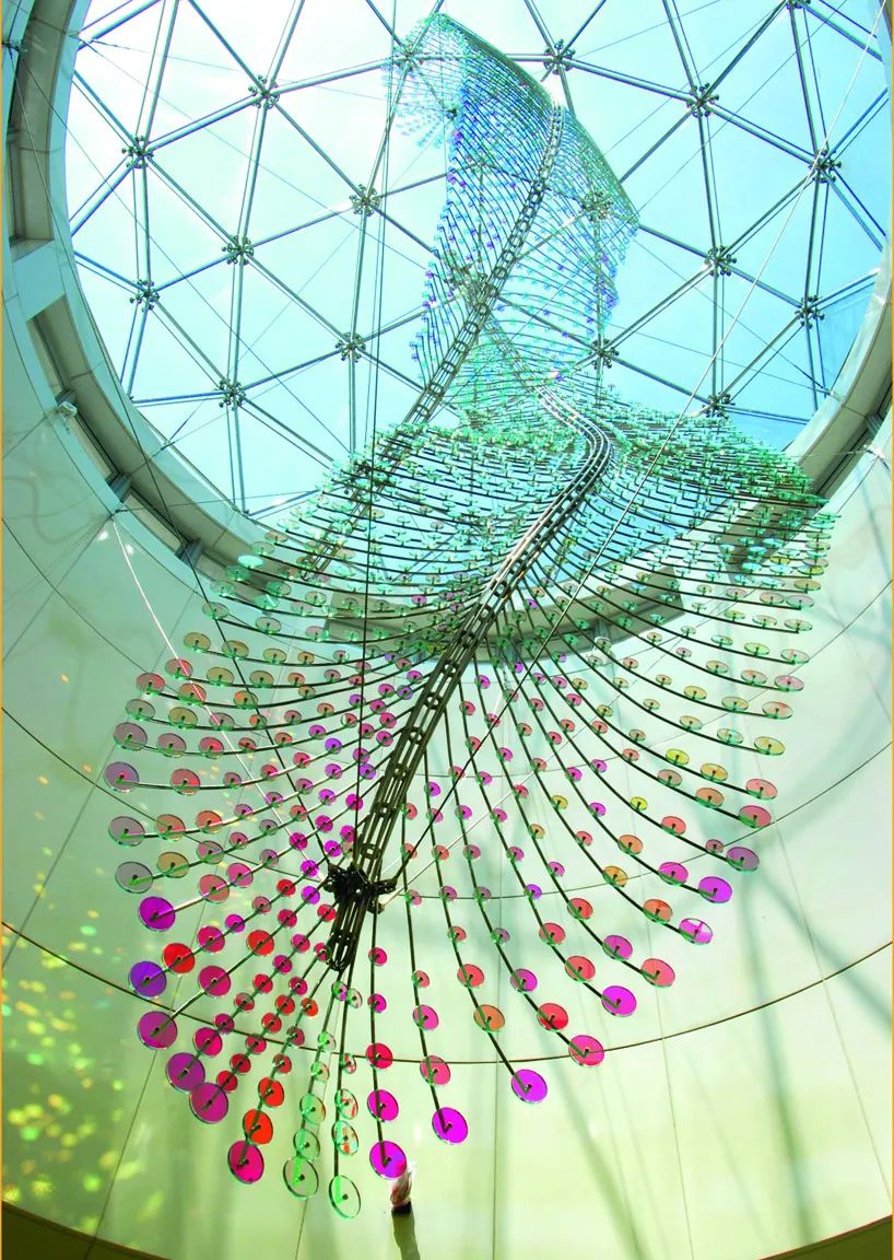 艺术家选择「羽毛」作为美丽的创作元素,在视觉印象上利用「阴影」与「光线」呈现羽毛的轻盈柔软,高科技的玻璃镀膜技术反射四季不同阳光光线变化,演绎出缤纷的色彩变奏曲。艺术家以模拟计算得出的基地日照角度,设计羽毛弯卷的方向和弧度,尤其在盛夏,灿烂缤纷的光影,让观者仿佛呈着地铁列车进入一彩虹般绮想的万花筒世界。
