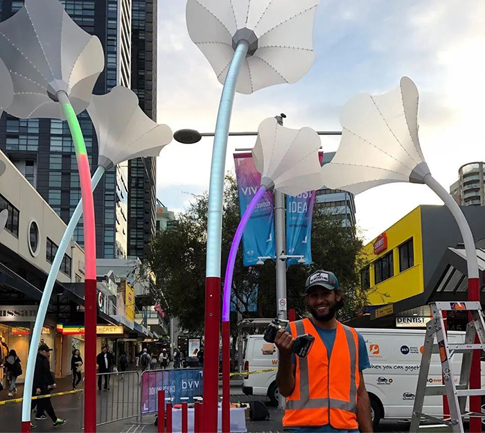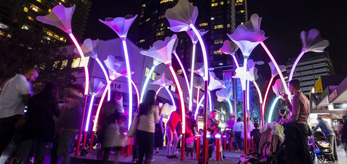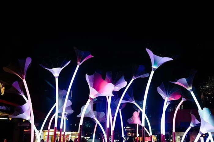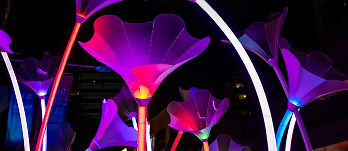 留声机是世界上第一款用于播放声音记录的电动设备。这件互动装置艺术作品的灵感正是来自于留声机喇叭(放音器)的形态。当27朵喇叭花从2米到6米的高度在你之上时,你将体验一个巨人的音乐花园。散落在“喇叭花丛”周围的互动按键则模拟了“小号”上活塞的样式。当你沉浸在巨大的“喇叭花”花园里时,你会觉得自己好像缩小了。每当观众按动按键时,对应的“喇叭花朵”将会鸣响音符,声音由鼓、长号、小号和萨克斯管组成。发挥巨大的喇叭键,你就能制作属于自己的花艺声光表演。艺术家与多位音乐家一起,为作品创作了不同音高的特制“号角”音效,与缤纷的灯光效果一起激活夜晚。