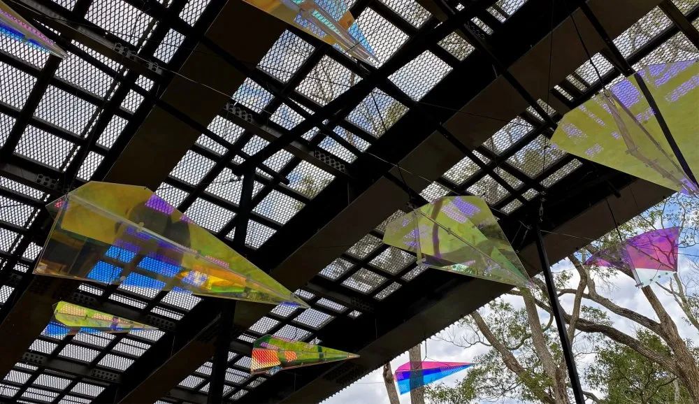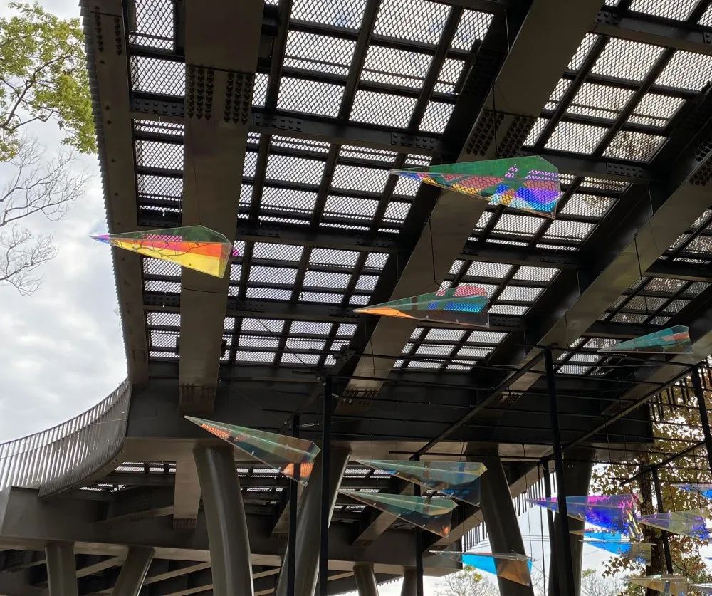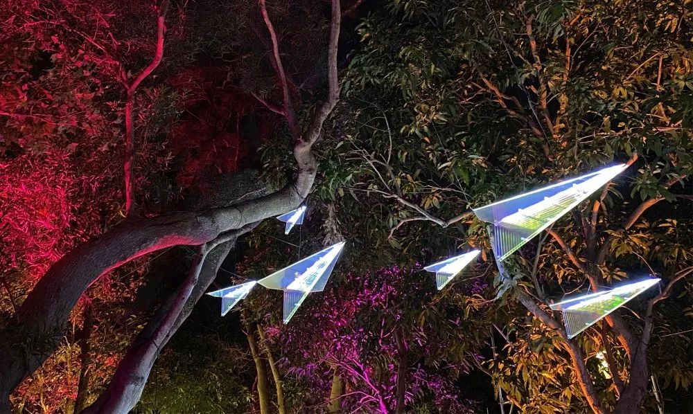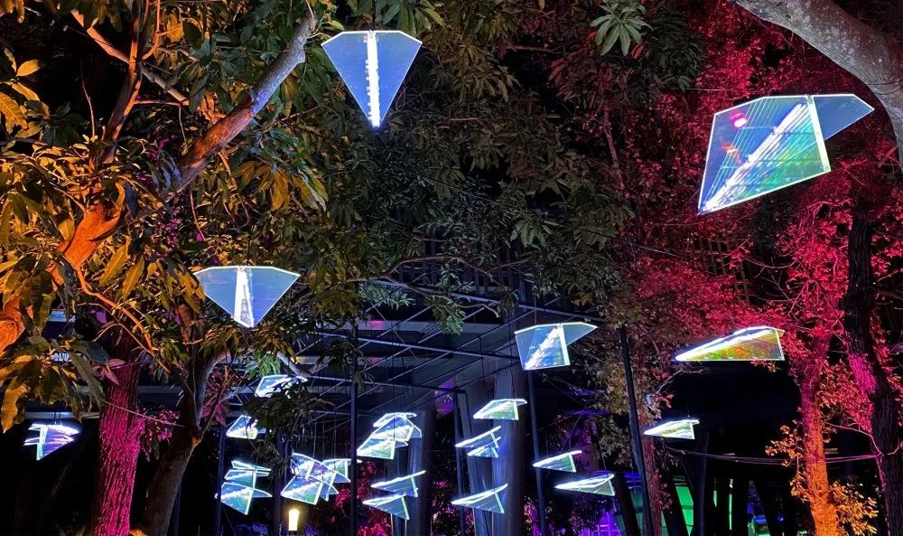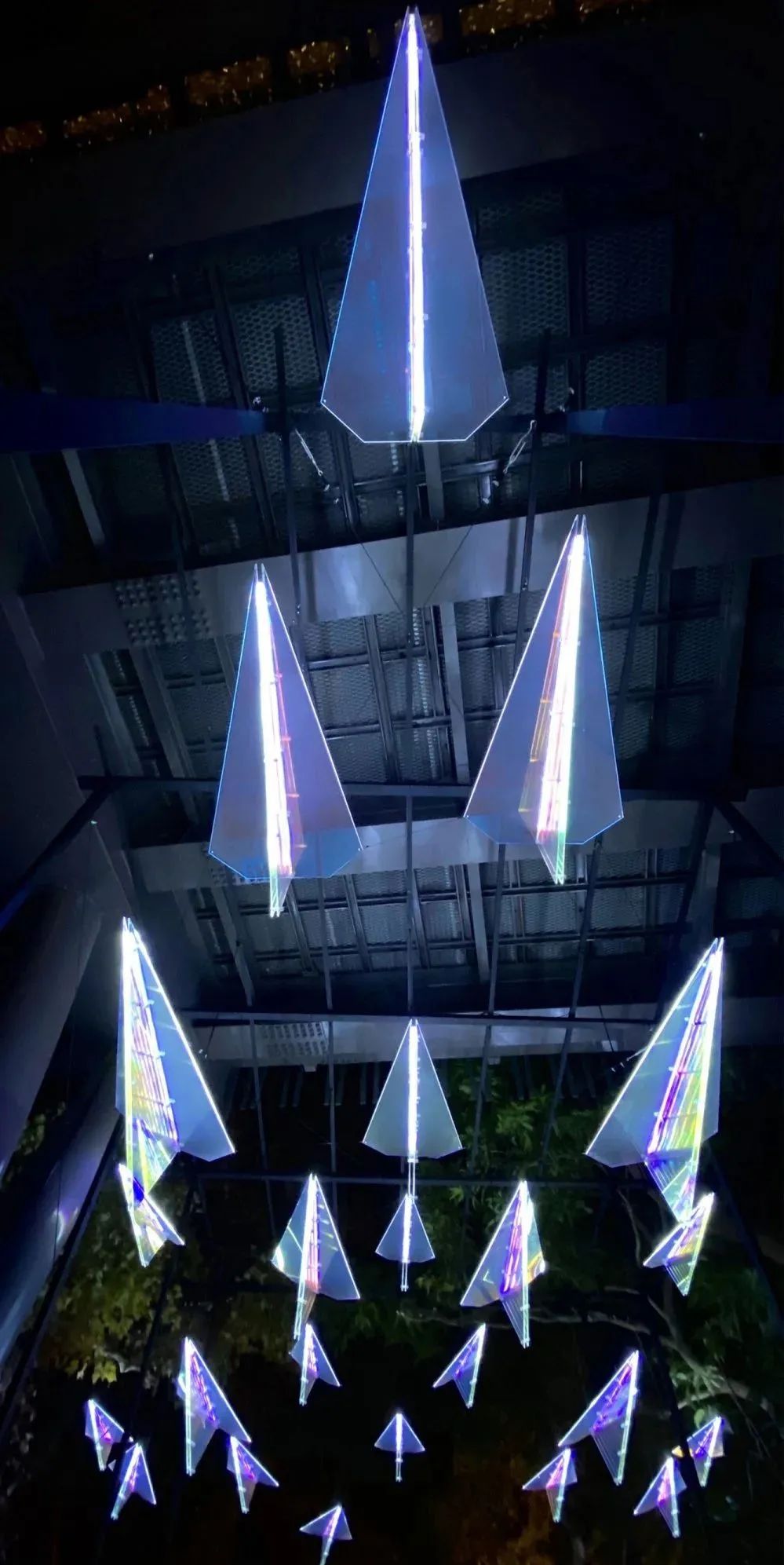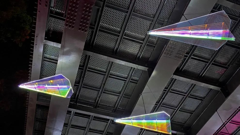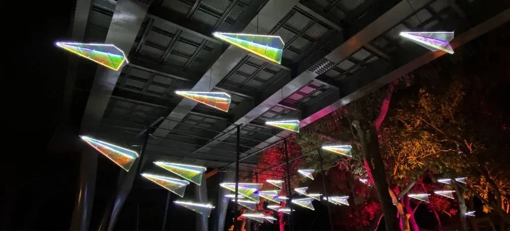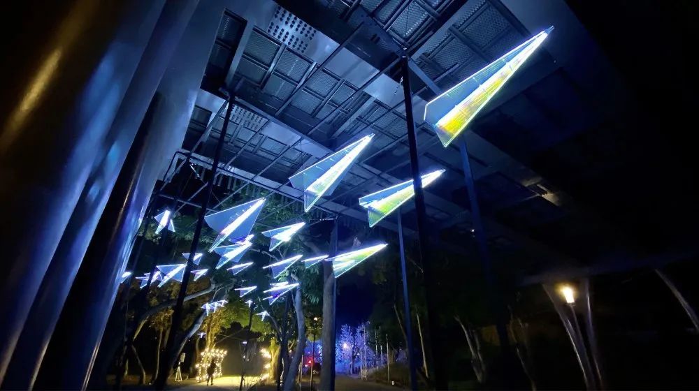 有用主张是台南「月津港灯节」的常客,也因此受到国际瞩目,去年受邀至荷兰「阿姆斯特丹光节」参展。纸飞机的形象唤起了童年的场景。艺术团队有用主张《逐梦飞翔》以纸飞机为主题,亚力克为素材,在空中悬挂出一架一架的灯光纸飞机,飞机还会随着光线角度变化出不同颜色,呈现多样貌的彩虹色系,充满科技感。
