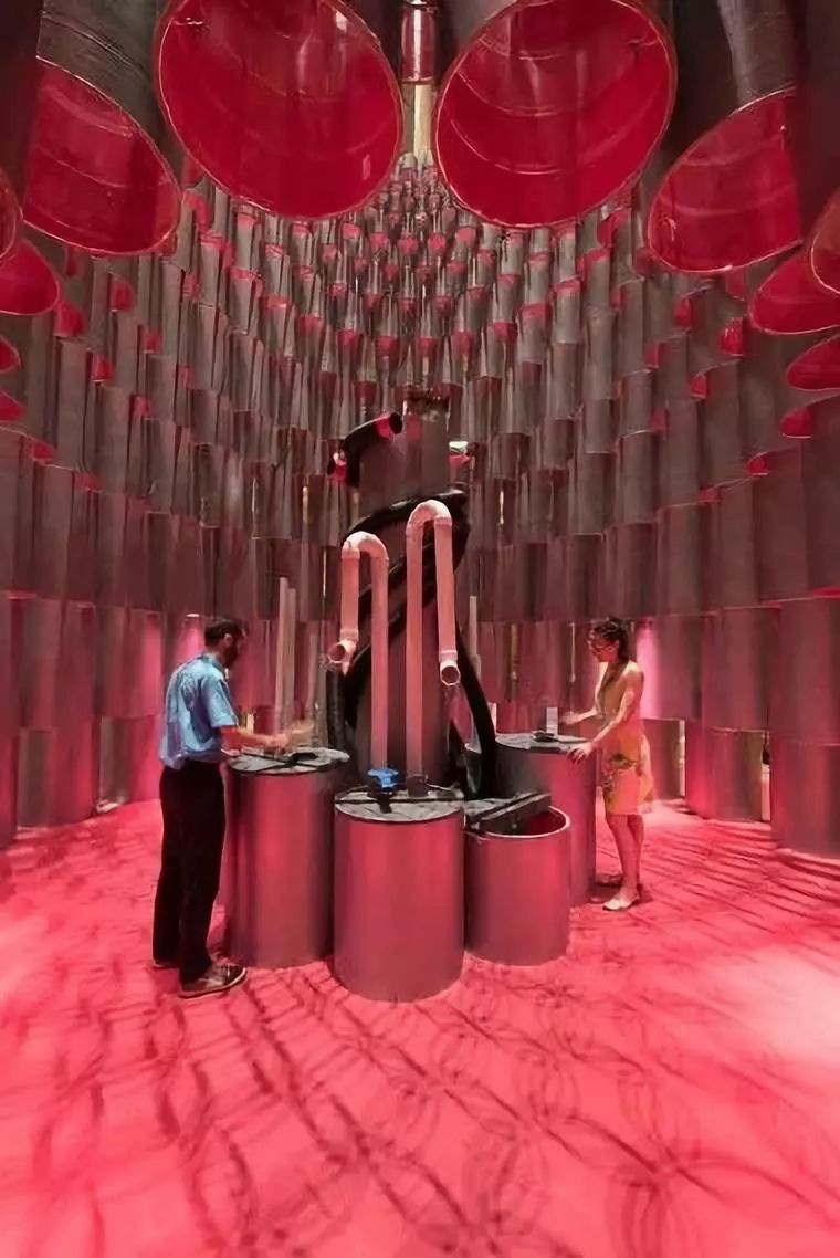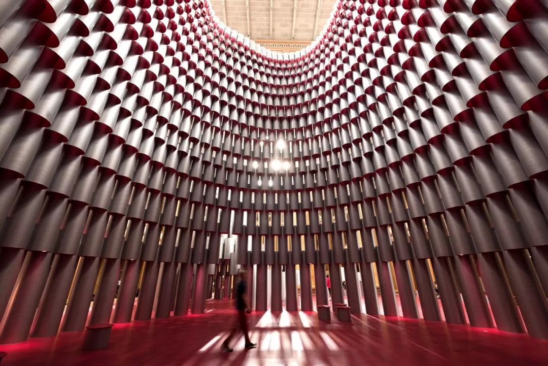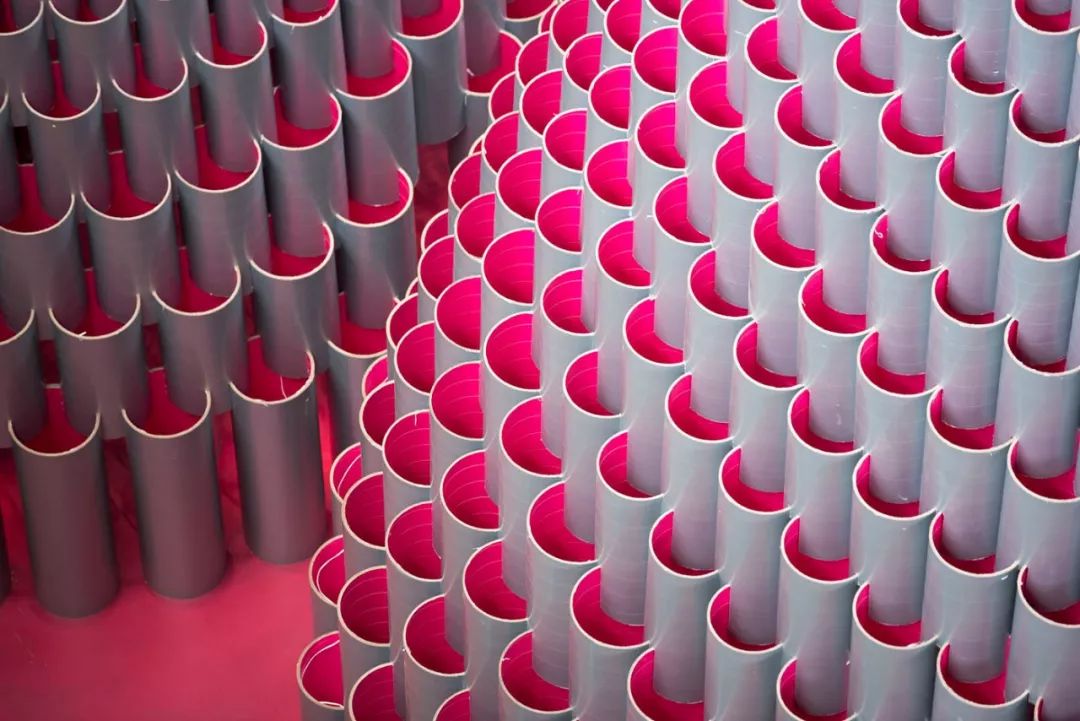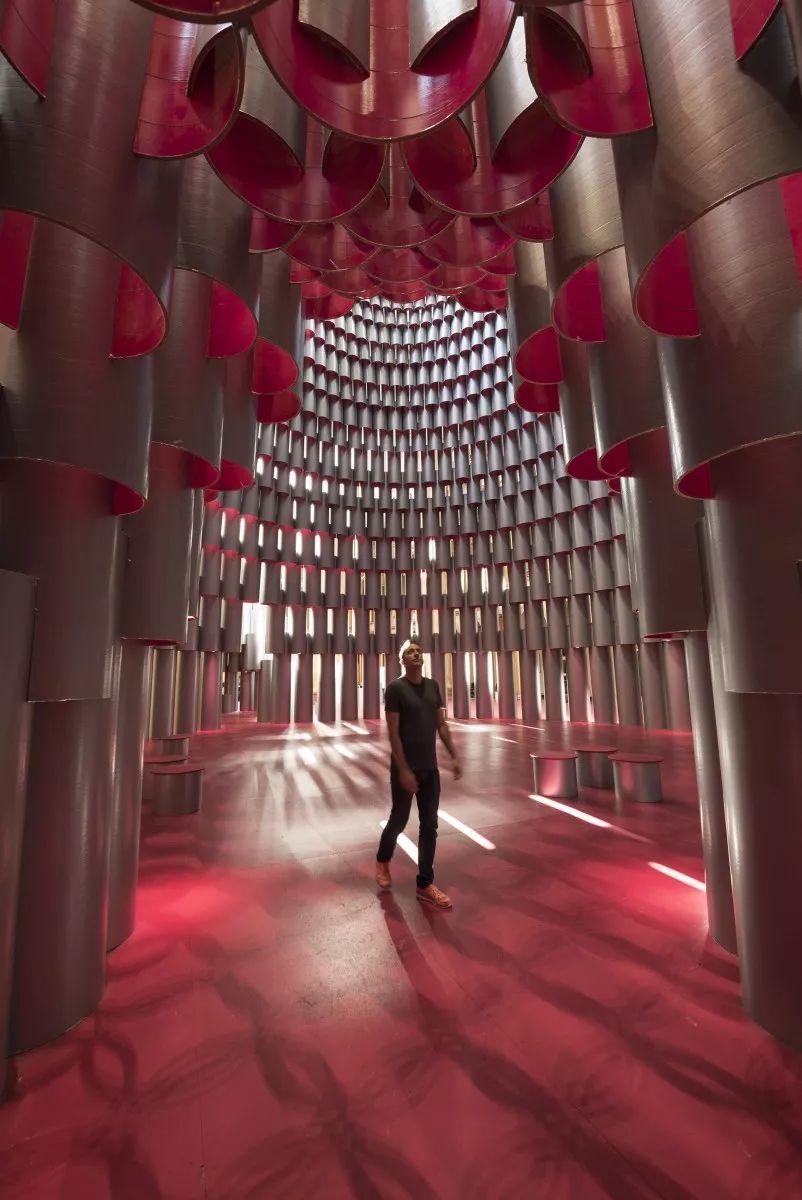 这个被称为蜂巢的装置,由超过2700管不同大小的纸紧锁在一起,创造出亭子一样的临时结构。芝加哥建筑工作室 Gang Architects在华盛顿的国家建筑博物馆内,用堆叠的银色和品红色纸管建造了三个洞穴状的房间,在国家建筑博物馆高耸的大厅内提供了更私密的空间,用于举办从瑜伽课程到音乐会的活动,管子的银色外表面和紫红色内表面是为了与博物馆中央大厅内支撑阳台的8个巨大的科林斯式柱子形成对比。