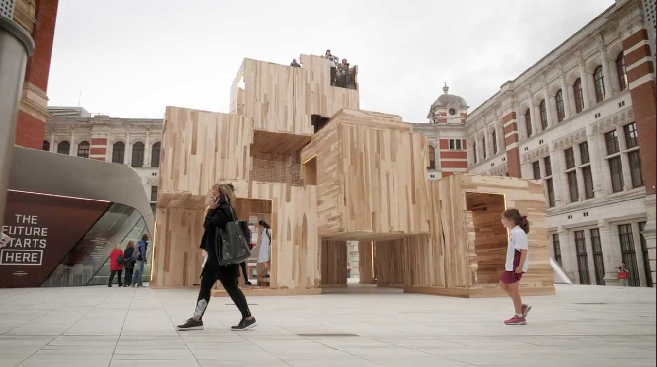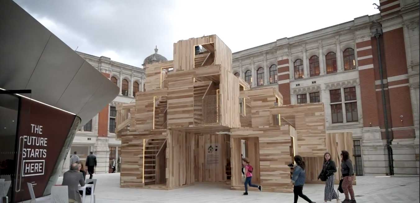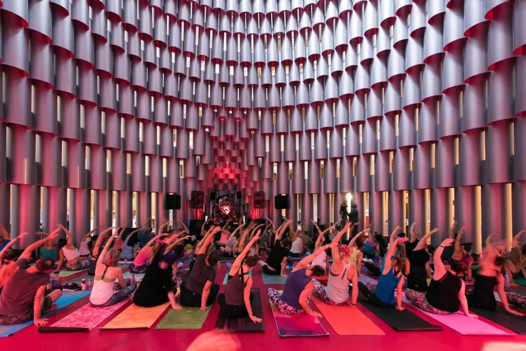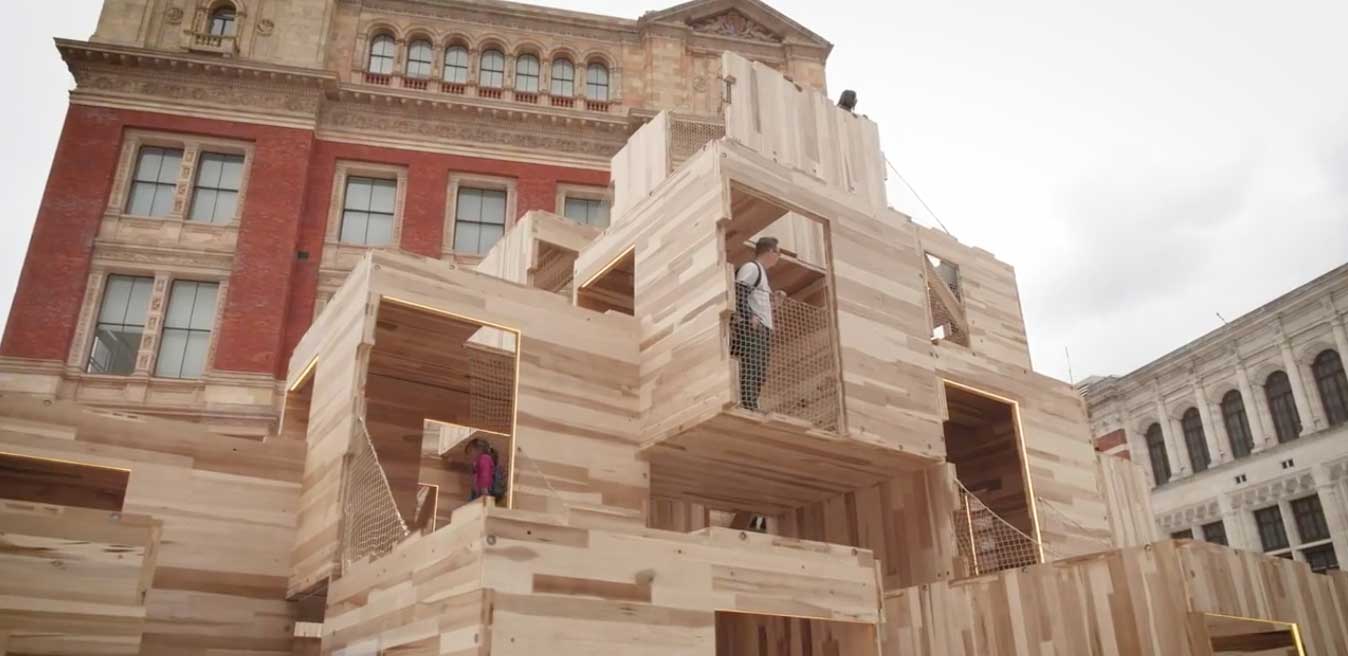 这个被称为蜂巢的装置,由超过2700管不同大小的纸紧锁在一起,创造出亭子一样的临时结构。芝加哥建筑工作室 Gang Architects在华盛顿的国家建筑博物馆内,用堆叠的银色和品红色纸管建造了三个洞穴状的房间,在国家建筑博物馆高耸的大厅内提供了更私密的空间,用于举办从瑜伽课程到音乐会的活动,管子的银色外表面和紫红色内表面是为了与博物馆中央大厅内支撑阳台的8个巨大的科林斯式柱子形成对比。