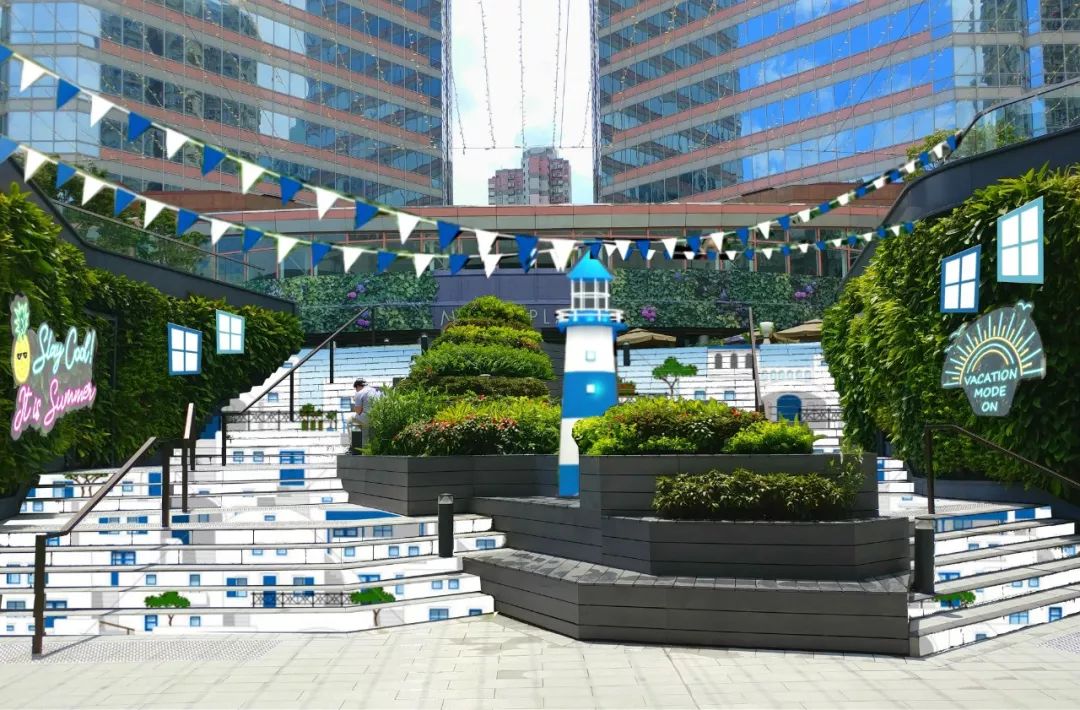 商场以浪漫唯美的希腊蓝白小屋作为主题,配合户外露天广场4大盛夏蔚蓝打卡位,令访客轻易走进异国国度打卡拍照; 加上本地街头音乐组合带来「Get Pop Music」及美食美妆购物消费礼遇,造就一个完美写意之旅。
