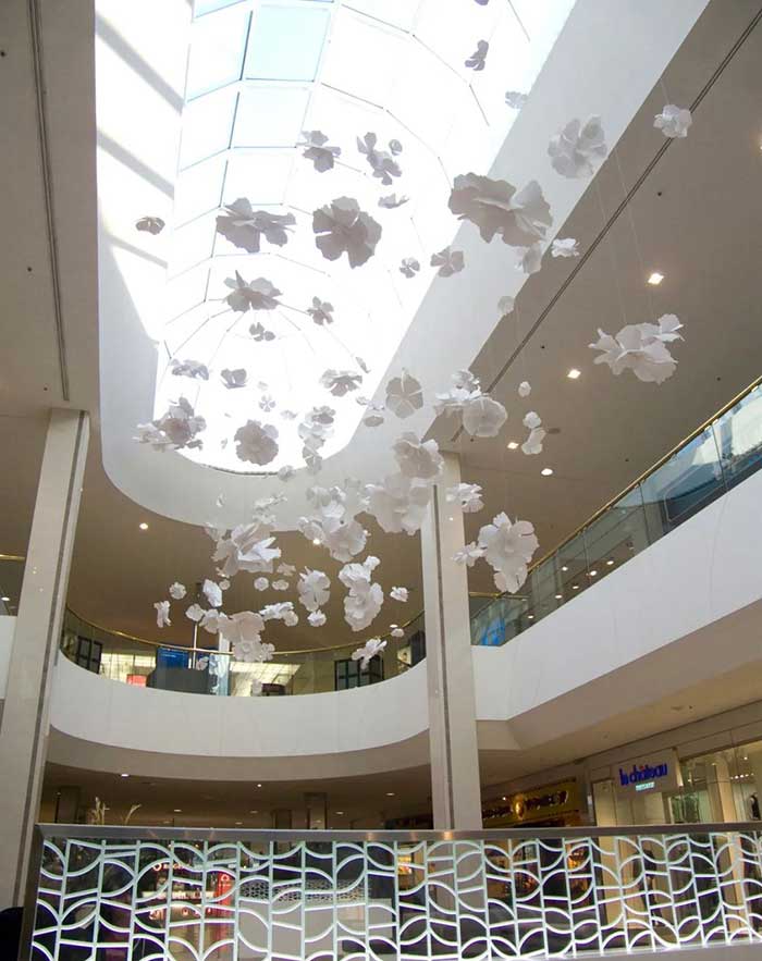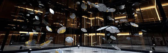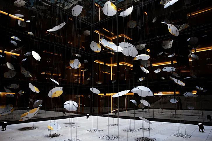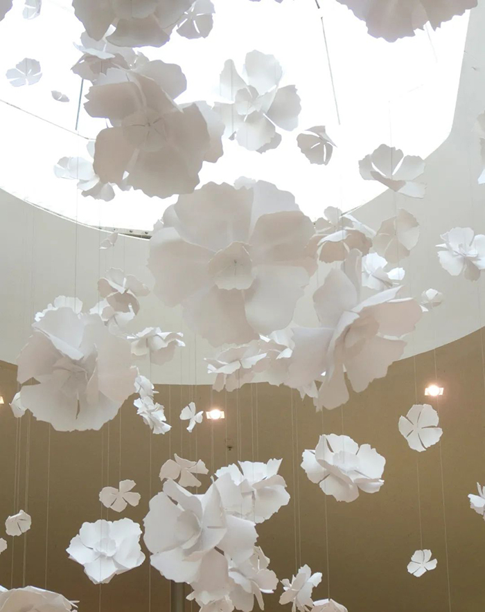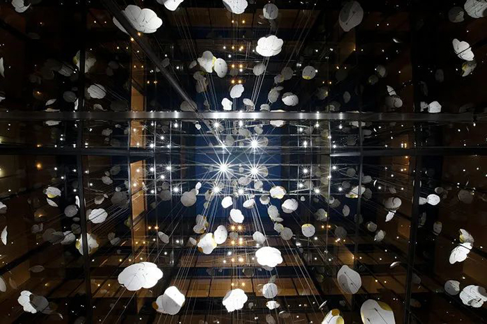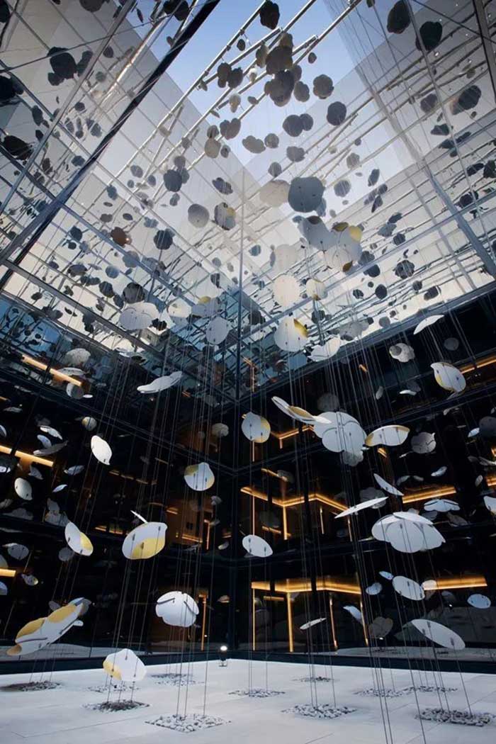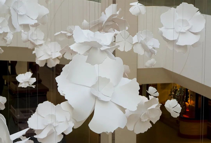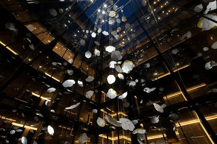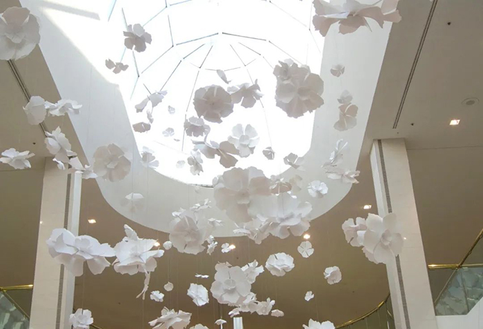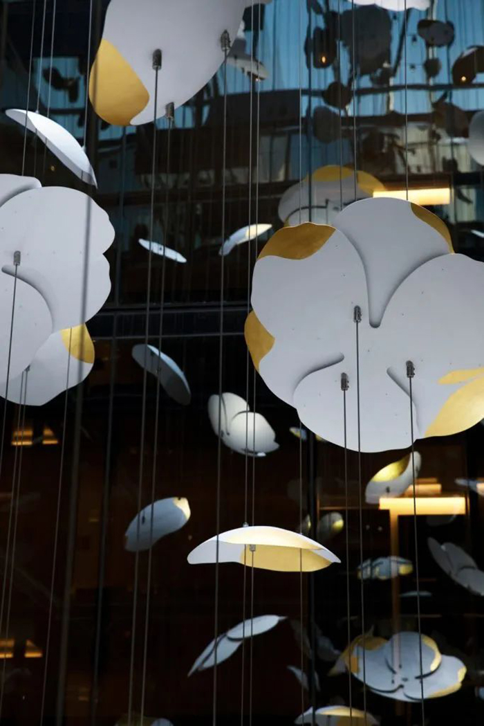 “Contemplation”是由白色的轻质铝制成,铝片上辅以24k镀金装饰,构成一个个魅惑醉人的花环,这些花卉有90多种直径从30厘米到1米不等。花环从十七层到八层如瀑布般穿过中庭,唤起大家对大自然的向往,宛如春天的花朵绽放,夏天微风吹拂着的花瓣,秋天飘落的树叶及冬天飘落的雪花。四季酒店通过“Contemplation”沉浸式的体验,将艺术氛围融入到酒店中。为观众营造一个引人入胜的空间,客人可置身其中享专属的艺术雕塑的互动体验。