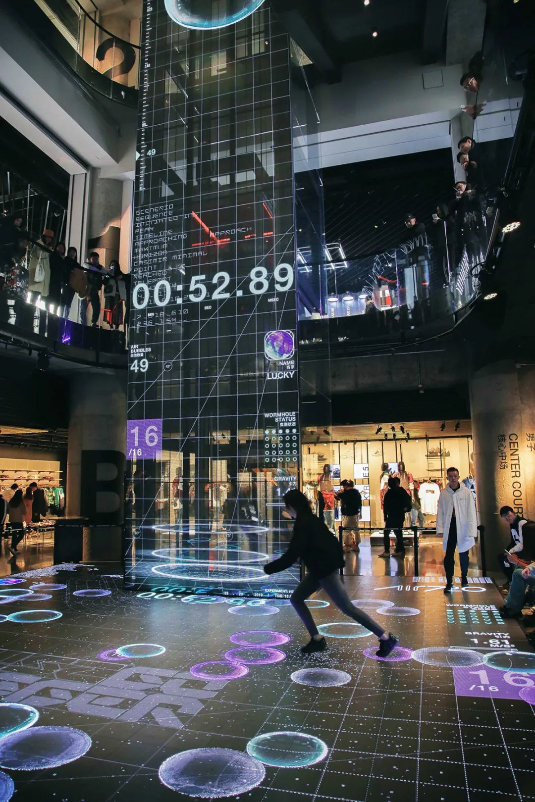 为迎接Nike Air Max Day,Nike请创意团队Studio NOWHERE设计开发,在品牌店铺内打造一个沉浸式的“核心中场”影像装置,用户在地面互动屏幕上快速踩踏的动作,将会吸引air bubble到虫洞内,并触发竖屏,产生巨大的air bubble,更新得分。界面设计和现场音效也以复古未来的风格呈现。这个体验,将 JUST GO BIGGER 的概念融入其中,并传达出Nike超乎想象力的设计理念,和从未停止想象与创新的精神。