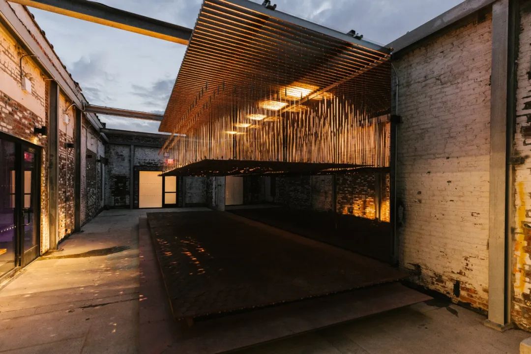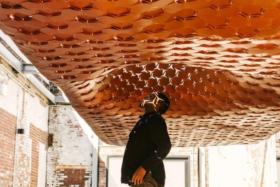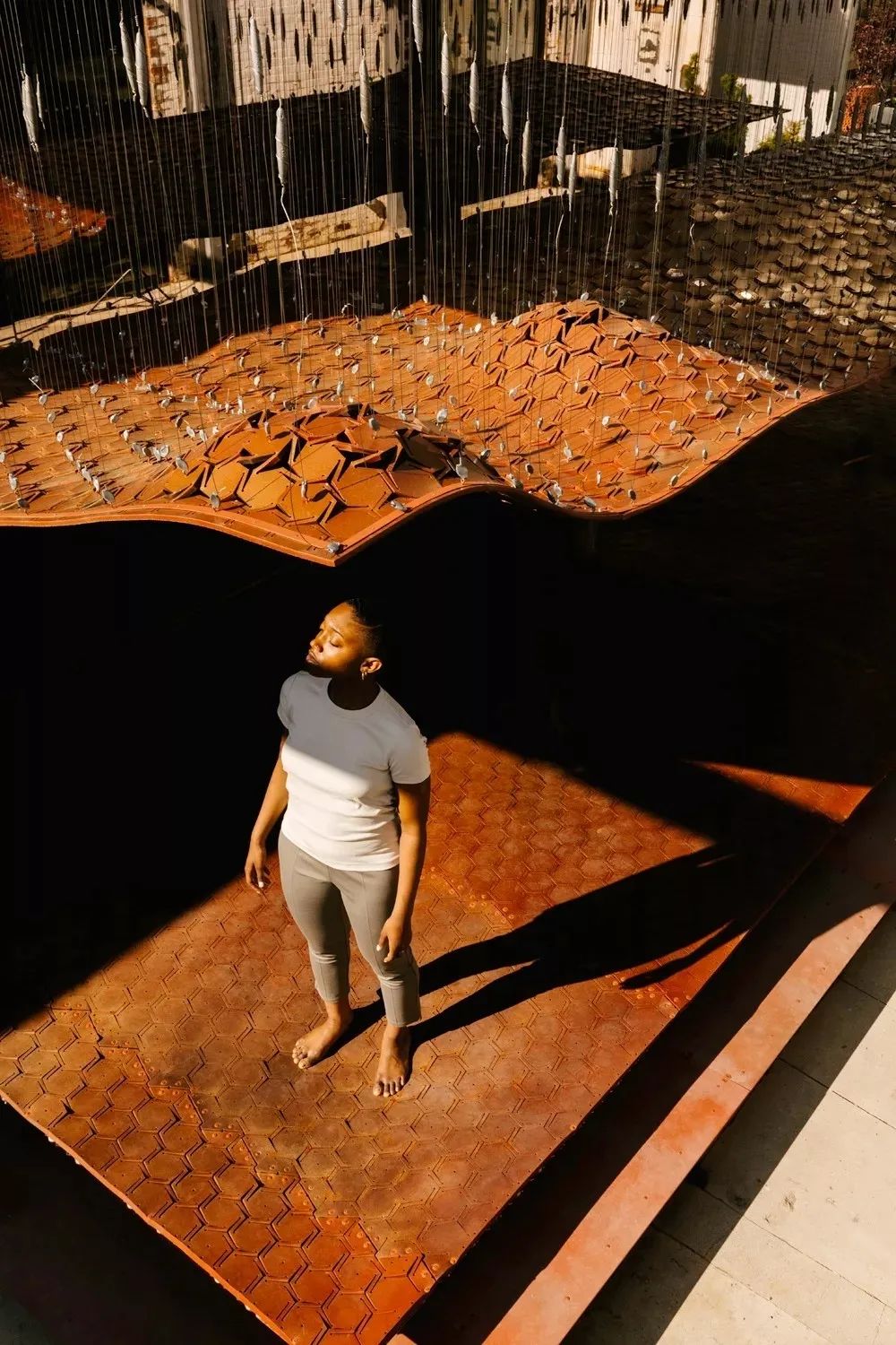 2019年纽约设计周,Studio INI在户外庭院打造出全新的沉浸式动力装置《Urban Imprint》,这是一个随着你的脚步而变化的装置,顶部装置通过不锈钢弹簧和滑轮系统连接,当参观者踏上地板时,会带动脚下的弹簧启动滑轮带动头顶的顶棚开始变动。