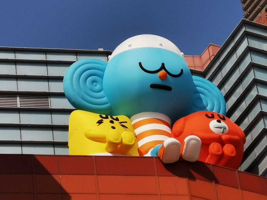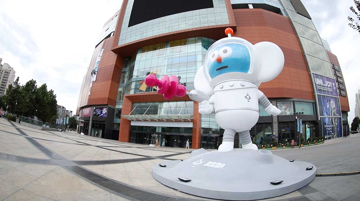 近5吨重、7米高的巨型雕塑是手持激光枪和喷射背包率先“着陆”的MOMO,矗立于朝阳大悦城正门广场。每天阳光穿透晨雾的一瞬,让朝阳下闪光的MOMO唤醒整座城市!视线移到楼顶,还有三只“巨型萌物”等你发现哦~