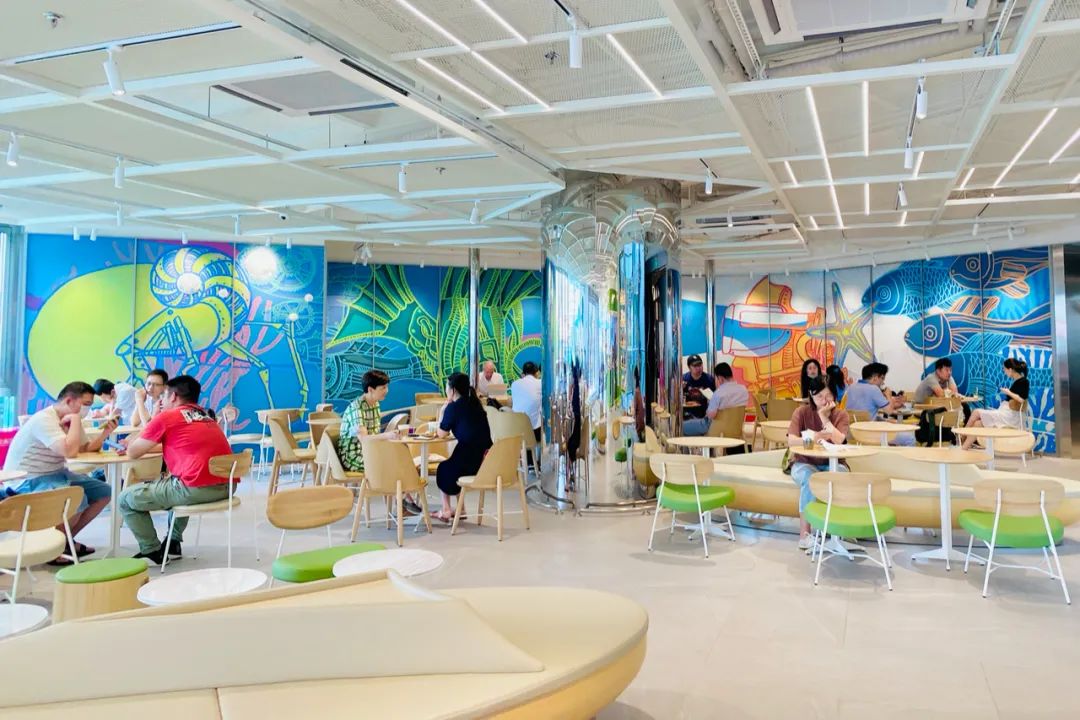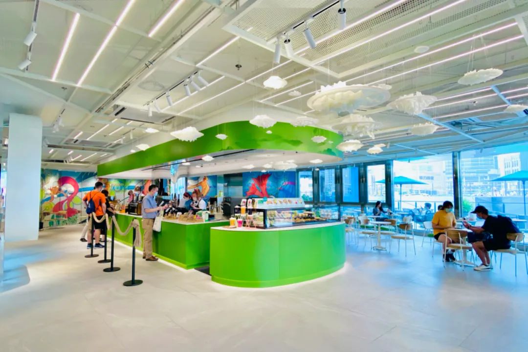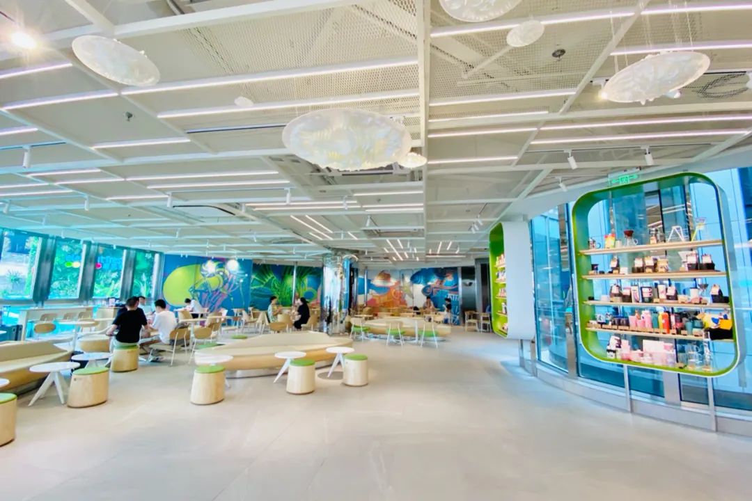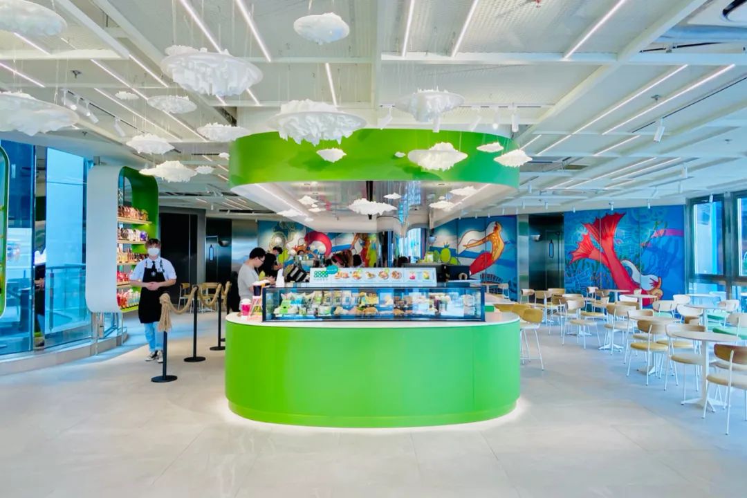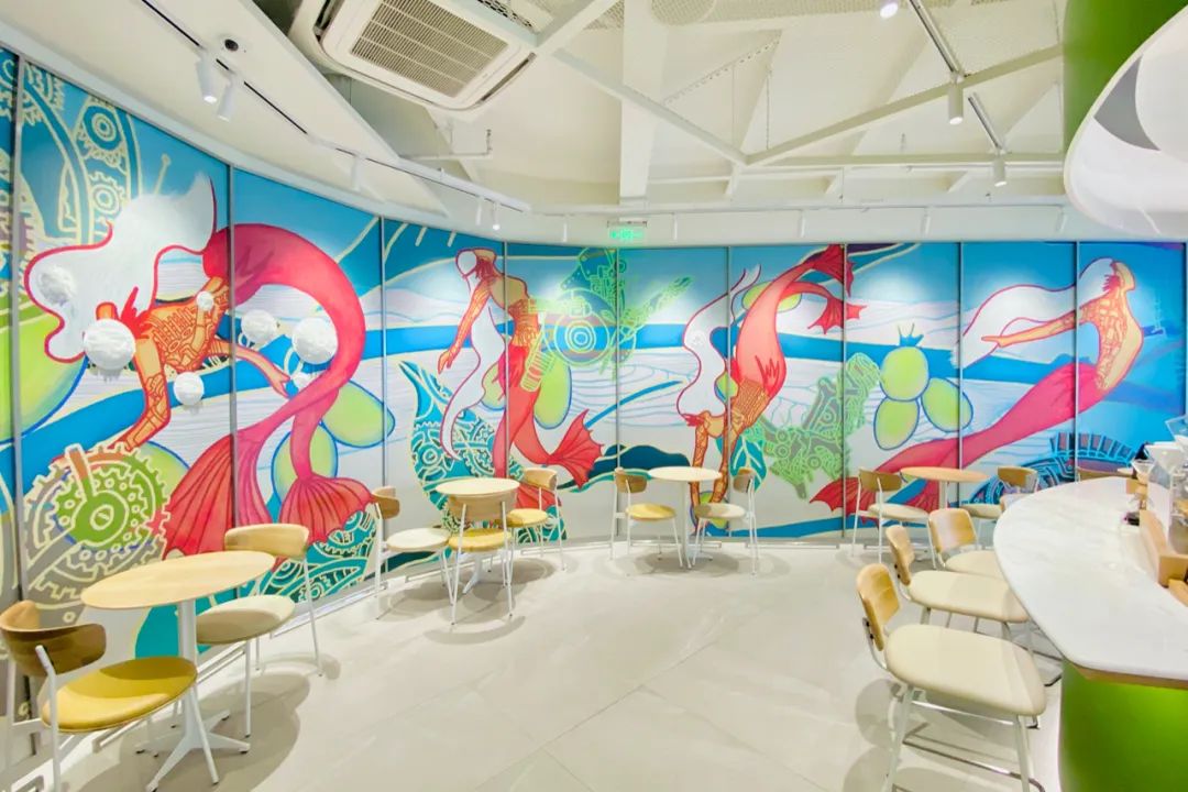 人鱼艺术主题在星巴克店内呈现的主要是位于店铺左右两侧的弧形墙画,左侧由于也是吧台工作区域,因此坐席较少,消费者在点单时更容易近距离感受作品。右侧则位于主力坐席区后方,如果不在该侧就坐则更适合远观。据悉墙画所表达的故事是:美人鱼带着咖啡产区、咖啡种植地的各种元素,漂洋过海来到了上海。整家门店的整体风格有点小清新,悬挂着“茶云”,吧台和产品陈列架的圆角矩形设计手法,灵感来自的宇宙、星空、飞船,打造了全新的网红打卡点。